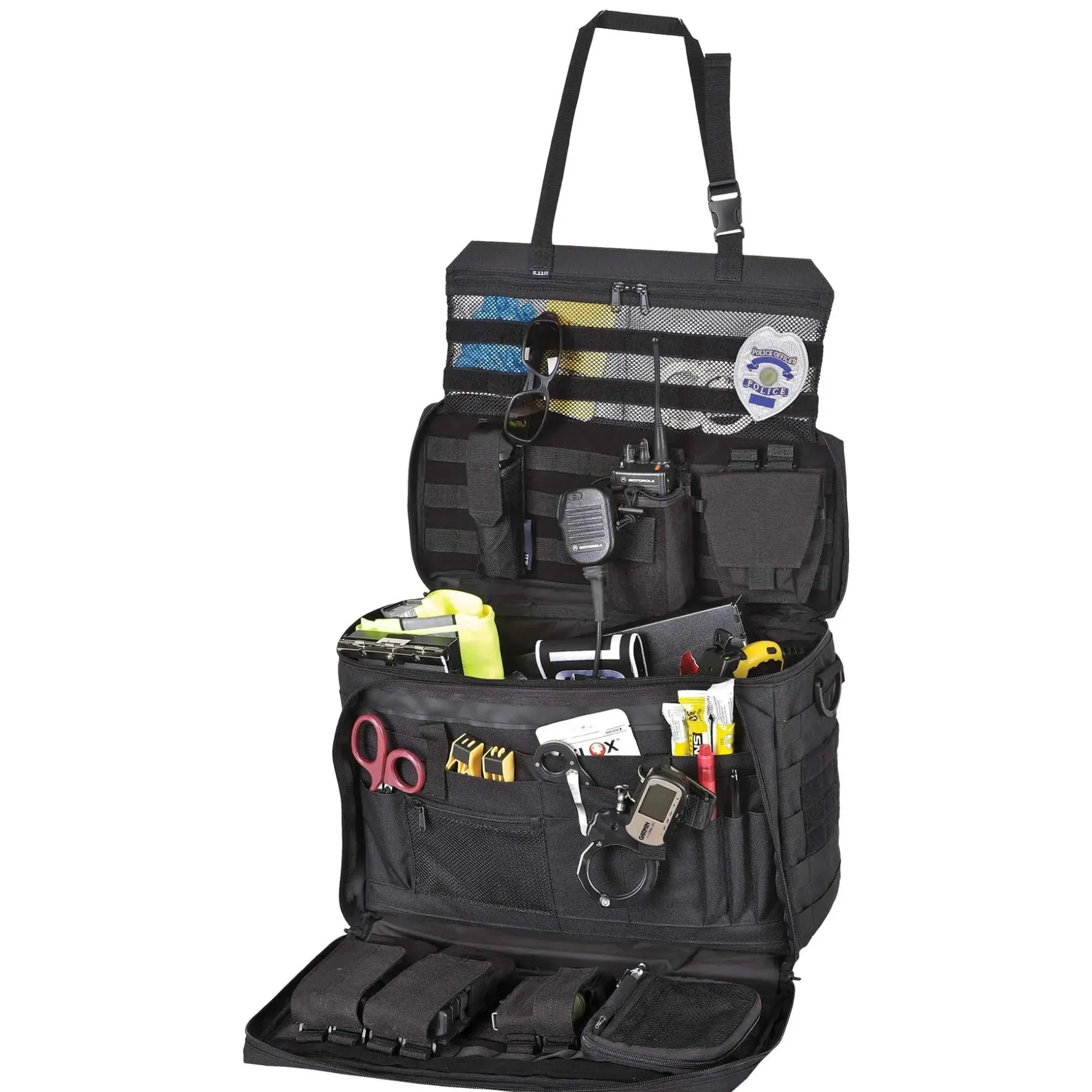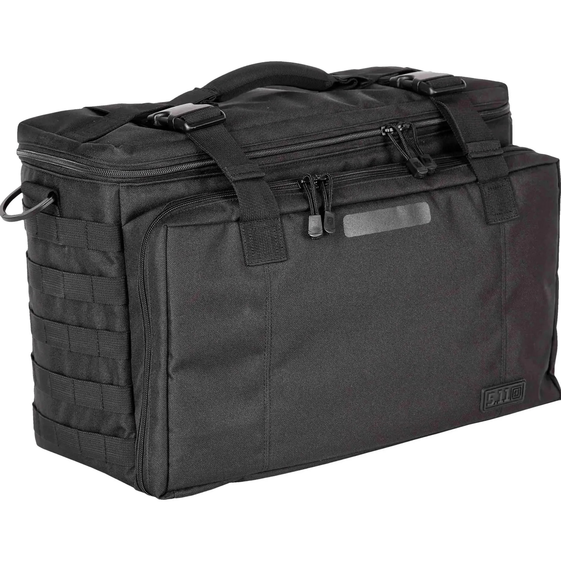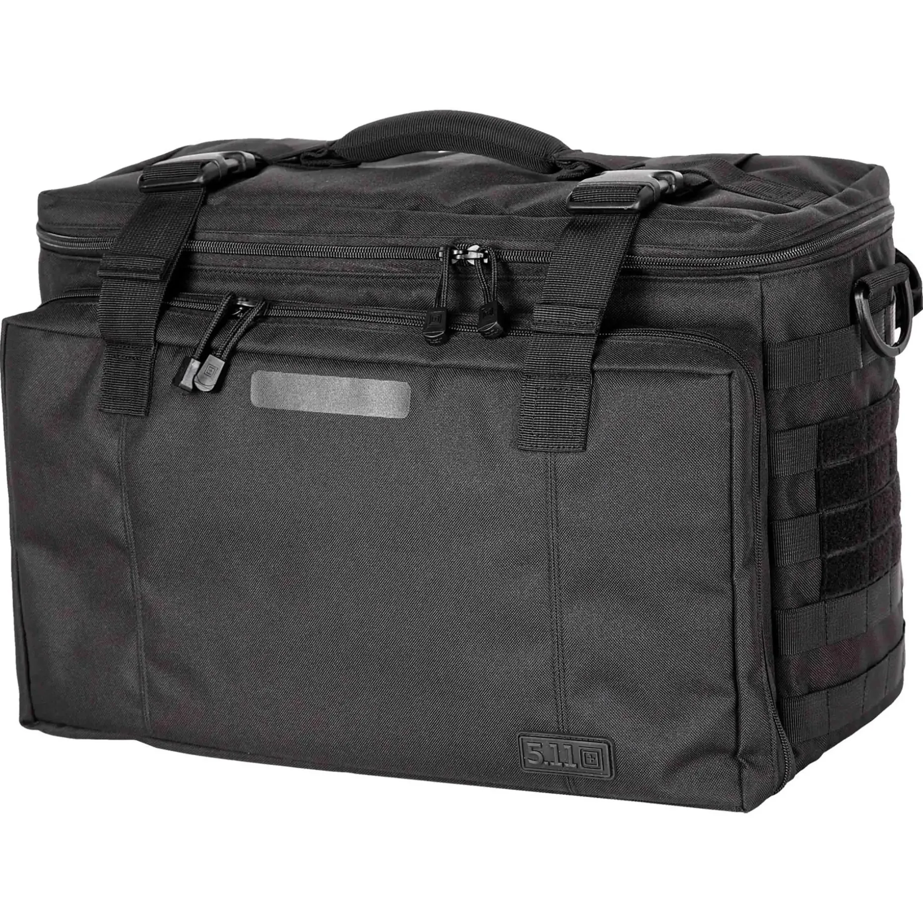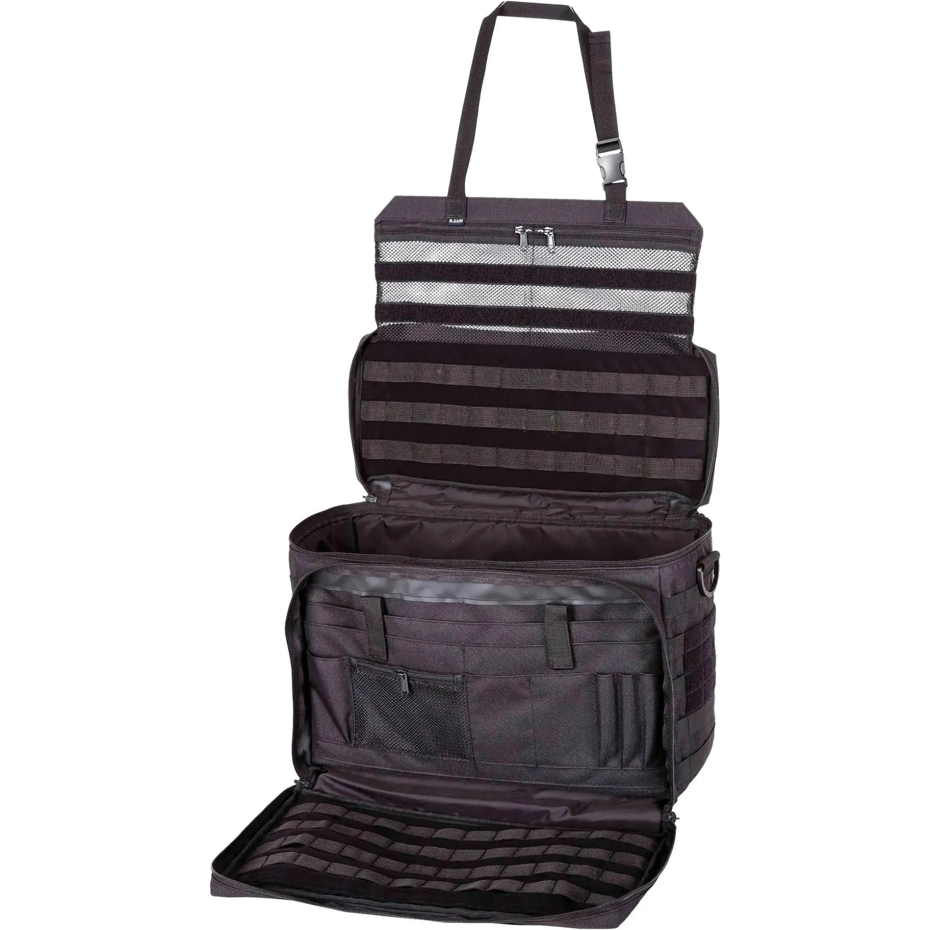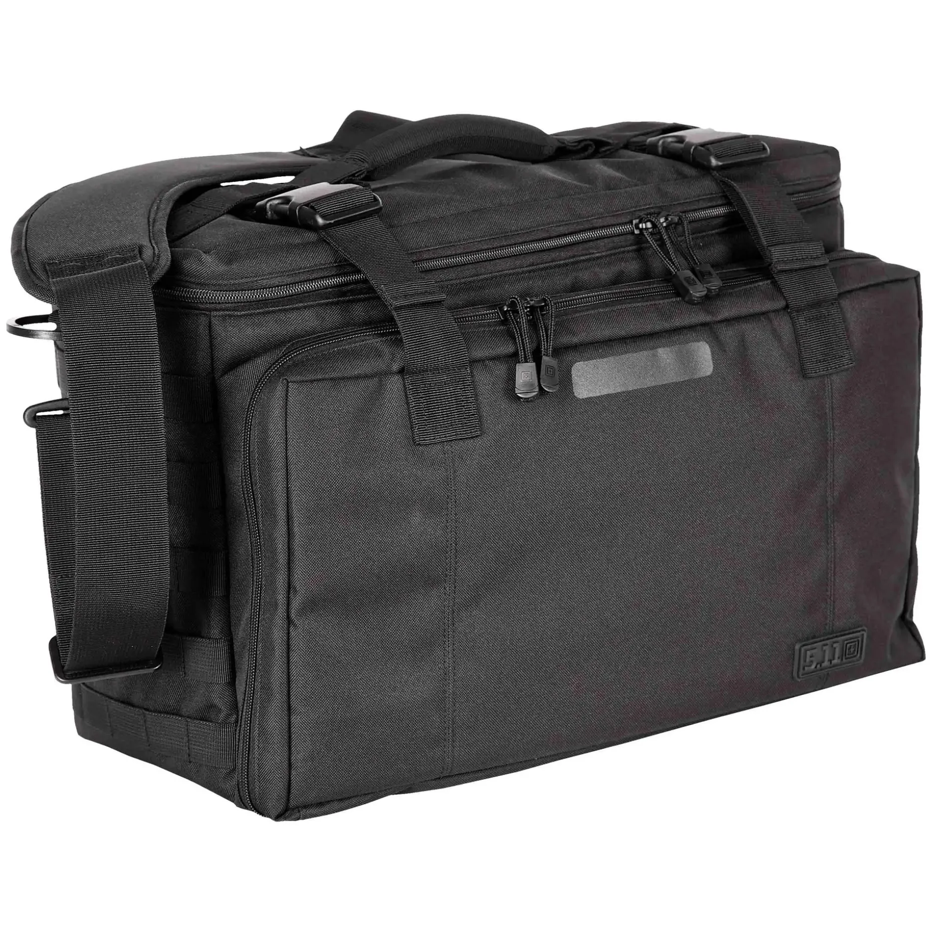 Die 5.11 Tasche Wingman Patrol dient sowohl als Organizer, Werkzeugkasten wie auch als funktionale Diensttasche. Sie ist ausgestattet mit gepolsterten Griffen sowie einem längenverstellbaren Tragegurt. Dank der herausklappbaren Kopfstützen-Sitzbefestigung können Sie sie am Beifahrersitz des Dienstfahrzeugs befestigen. Auf diese Weise können Sie die praktische Tasche ganz nach Ihren individuellen Bedürfnissen transportieren. In einem großen Hauptfach mit klettbaren Unterteilungen, Mollegurtbandsystem im Deckel, 2 Reißverschluss-Netztaschen und einer Innenwand für klettbare Taschen mit den Maßen 51 x 12 x 31 cm ( L x B x H) können Sie Ihre Ausrüstung verstauen. Sie wird abgerundet durch ein Fach mit Organizer- und Stifteinschübe und Mollegurtbandsystem im Deckel, zwei seitliche Mollegurtbandsysteme und ein Steckfach und Klettfläche für ein Namensschild.