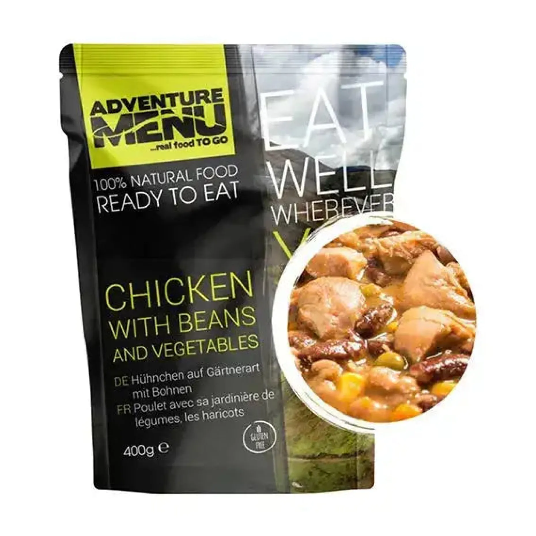 Entdecke das ultimative Powerpaket für Deine Abenteuerlust! Das Adventure Menu Hühnchen auf Gärtnerart mit Bohnen ist perfekt für Deinen Notfallvorrat oder für Dein nächstes Outdoor-Abenteuer. Mit dieser sättigenden Mahlzeit wirst Du stundenlang mit Energie versorgt, damit Du jede Herausforderung meistern kannst.