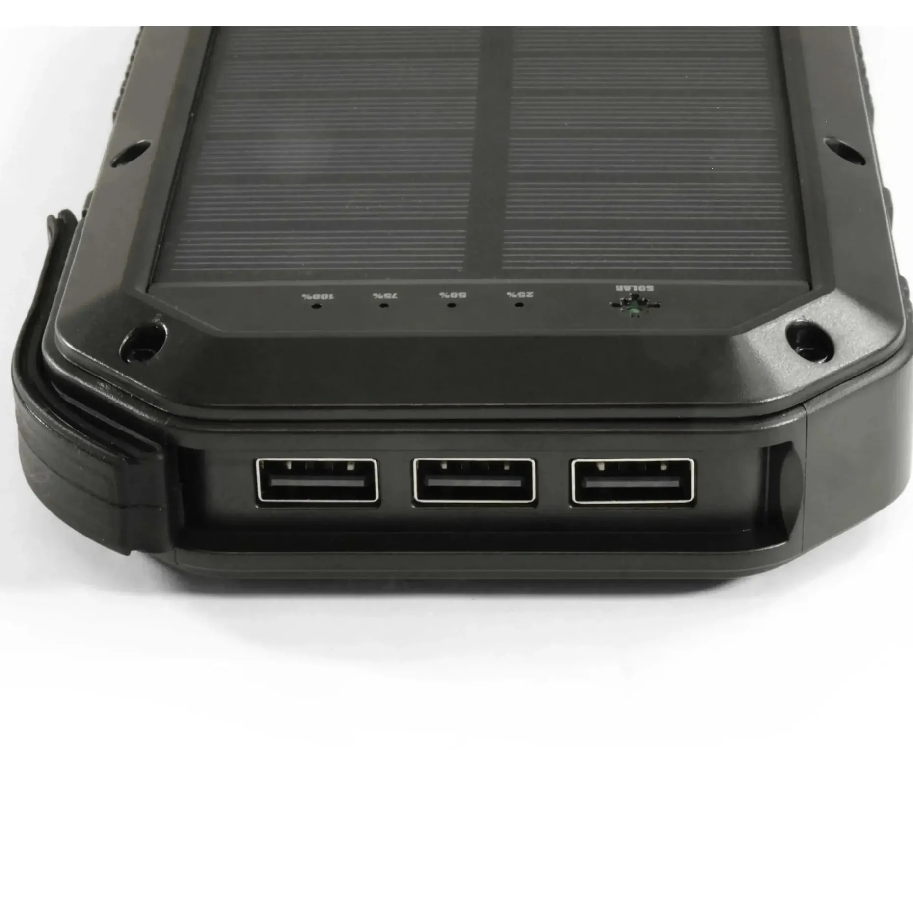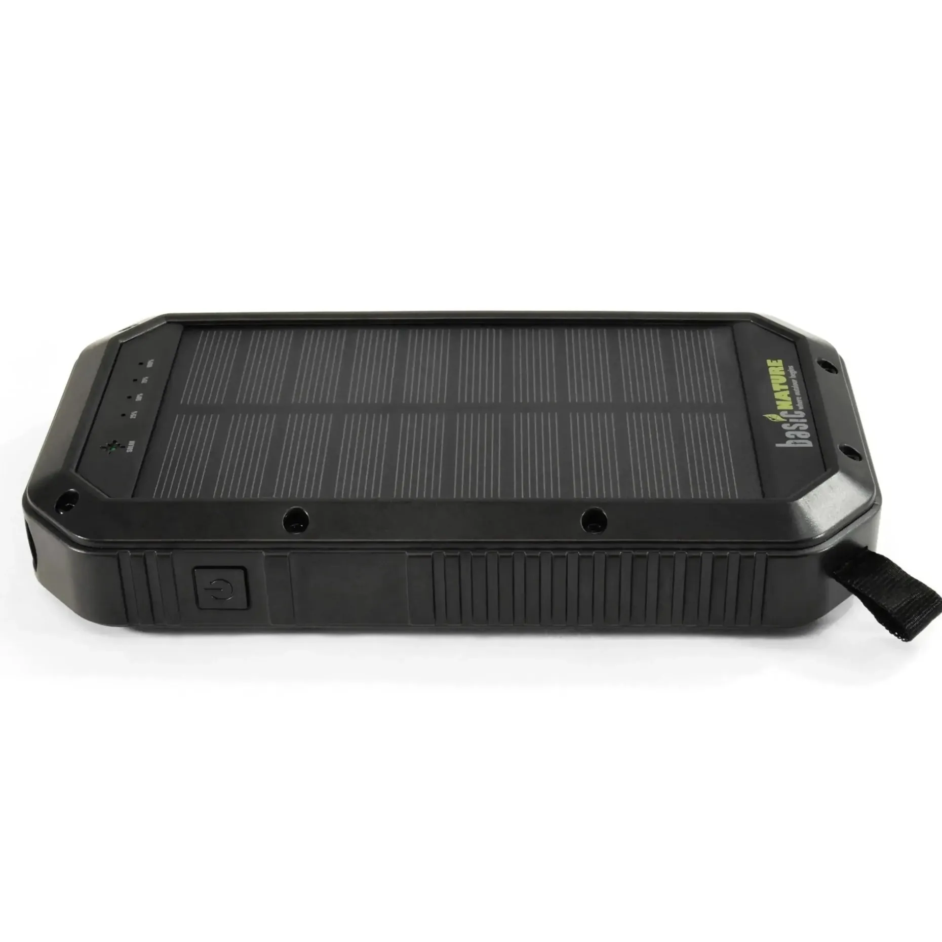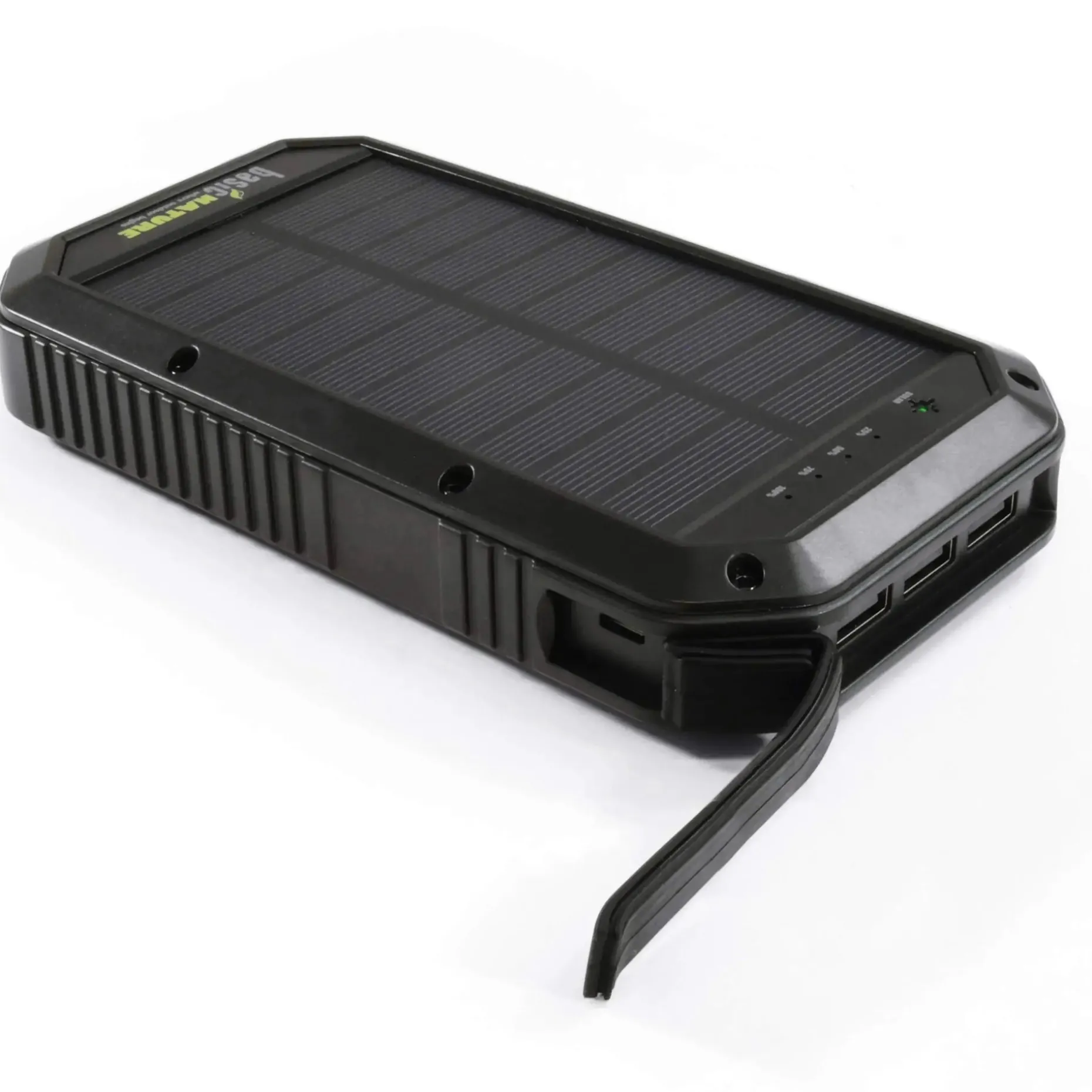 Die BasicNature Powerbank 20 bietet Dir eine Kapazität von 20.000 mAh. Dies ermöglicht die bis zu 4- bis 5-malige Ladung eines Smartphones. Die zusätzliche Funktion Qi „wireless charging“ ermöglicht Dir über Induktion ein kabelloses Laden (nur bei Qi-fähigen Geräten). Das robuste und spritzwassergeschützte Gehäuse (IPX5 Standard) schützt die Powerbank vor Schäden. Die Anschlüsse sind durch eine Silikonkappe gegen Spritzwasser und Staub geschützt. Das Gerät kannst Du via Micro-USB oder über Solar (nur für Notfälle gedacht) aufladen. Zusätzlich ist ein leuchtstarkes LED-Display mit 500 Lumen mit einer Brenndauer bis zu 15 Stunden eingebaut. Die Schlaufe am Gehäuse ermöglicht es Dir, die Powerbank im Zelt aufzuhängen oder tagsüber am Rucksack zu fixieren. So wird der Akku während des Wanderns geladen. Die Statusanzeige in Prozent zeigt den geladenen Zustand an. Die Energie wird in einem hochwertigen Lithium-Polymer-Akku mit langer Lebensdauer gespeichert.