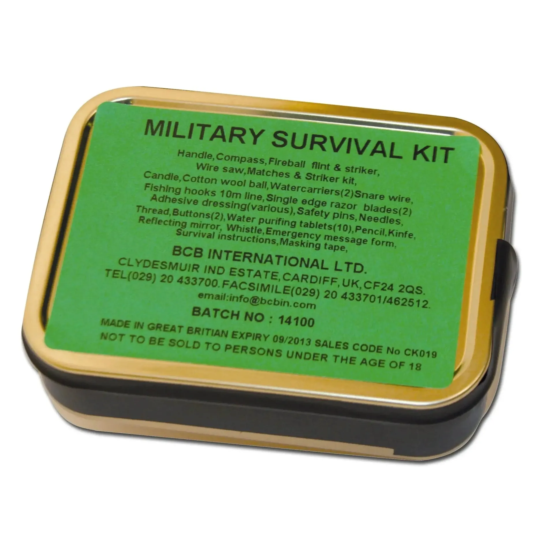 enthält es essenzielle Tools wie Messer, wasserfeste Streichhölzer, Wasserreinigungstabletten, Drahtsäge, Kompass und Signalspiegel.