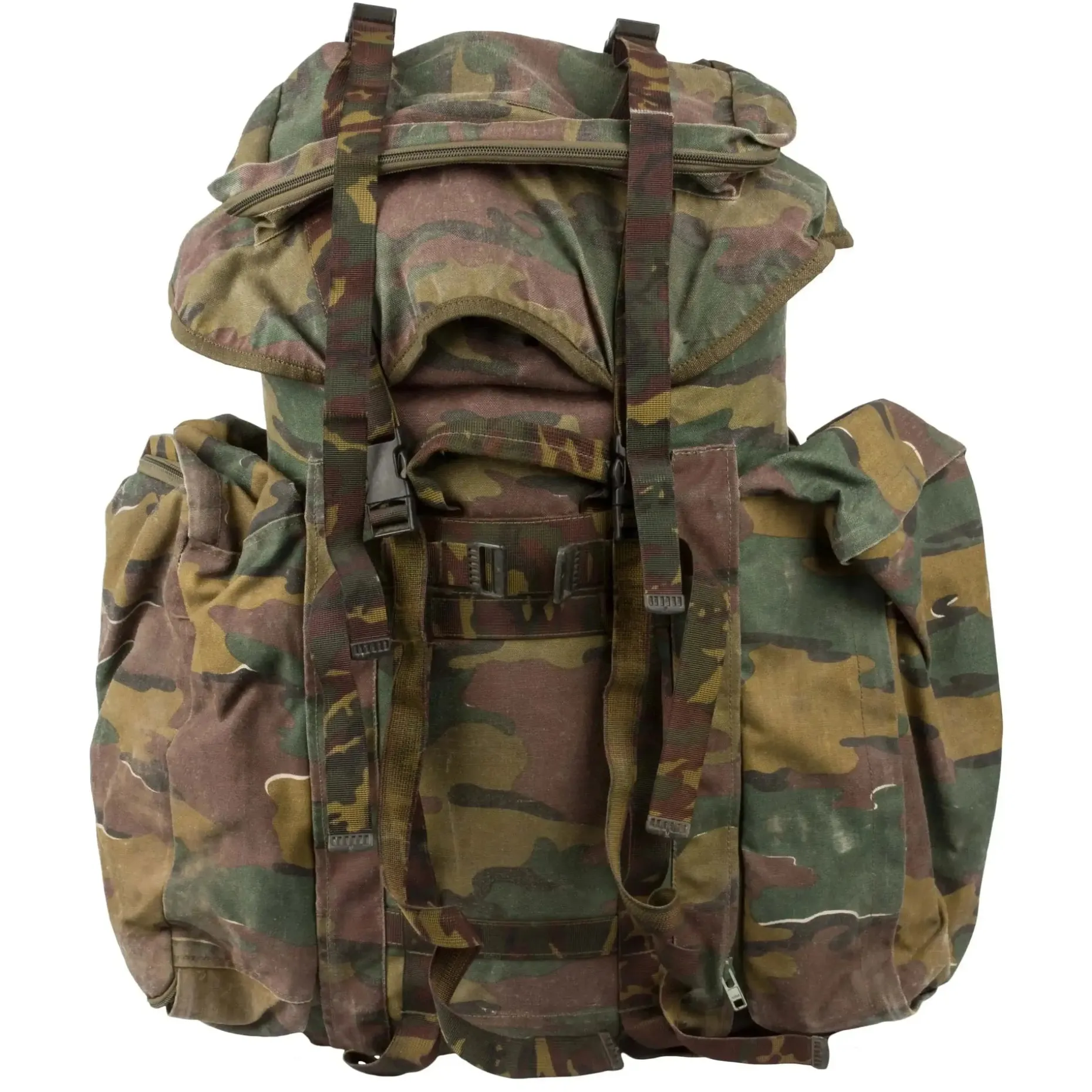Rucksack Mod. 97 der belgischen Armee in gebrauchtem Zustand mit 2 abnehmbaren Seitentaschen.
