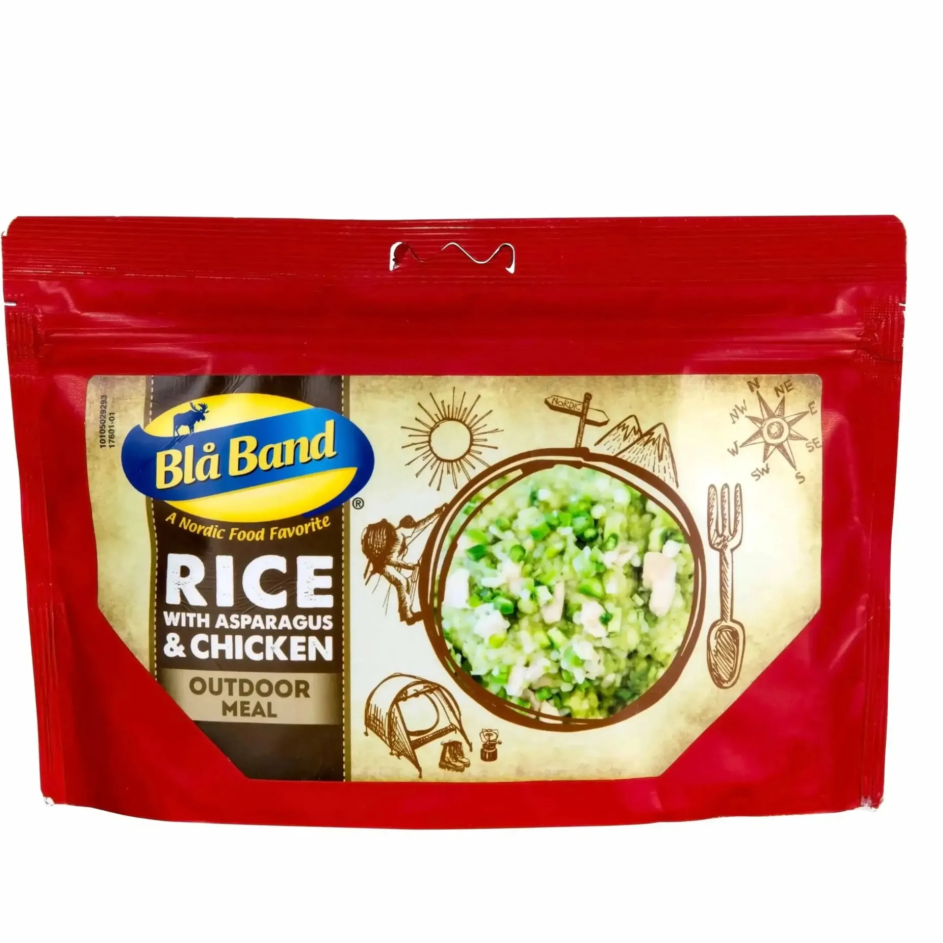 Reis mit Spargel und Hühnchen ist eine schmackhafte und nahrhafte gefriergetrocknete Mahlzeit. Die Mahlzeit beinhaltet keine Geschmacksverstärker und bietet so nur einen geringen geschmacklichen Unterschied zu gekochten Lebensmitteln. Um den Geschmack so wenig wie möglich zu verändern, verwendet Bla Band frische Zutaten, die alle getrennt voneinander gefriergetrocknet werden.
