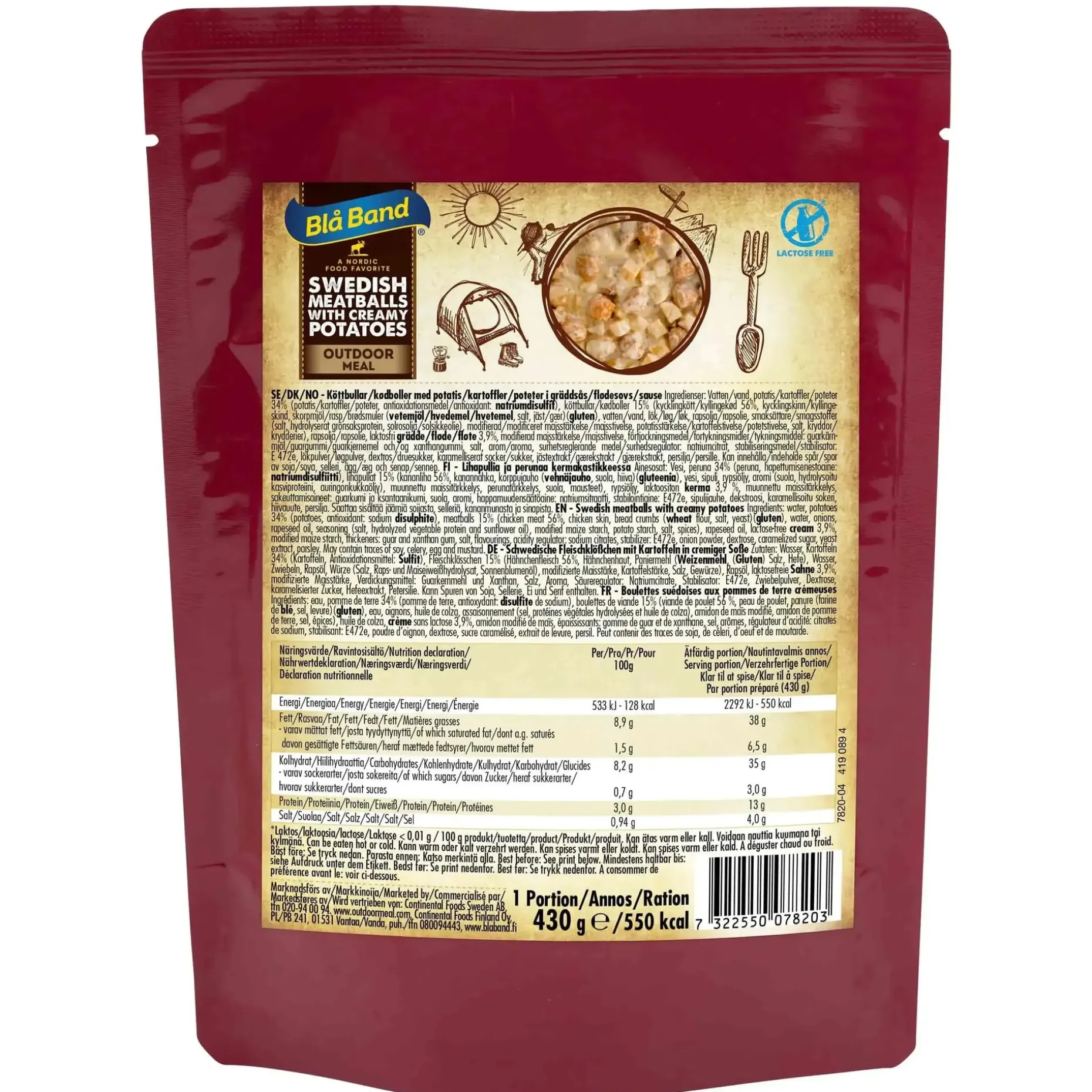 Schwedische Fleischklöße sind eine schmackhafte und nahrhafte gefriergetrocknete Mahlzeit. Die Mahlzeit beinhaltet keine Geschmacksverstärker und bietet so nur einen geringen geschmacklichen Unterschied zu gekochten Lebensmitteln. Um den Geschmack so wenig wie möglich zu verändern, verwendet Bla Band frische Zutaten, die alle getrennt voneinander gefriergetrocknet werden.