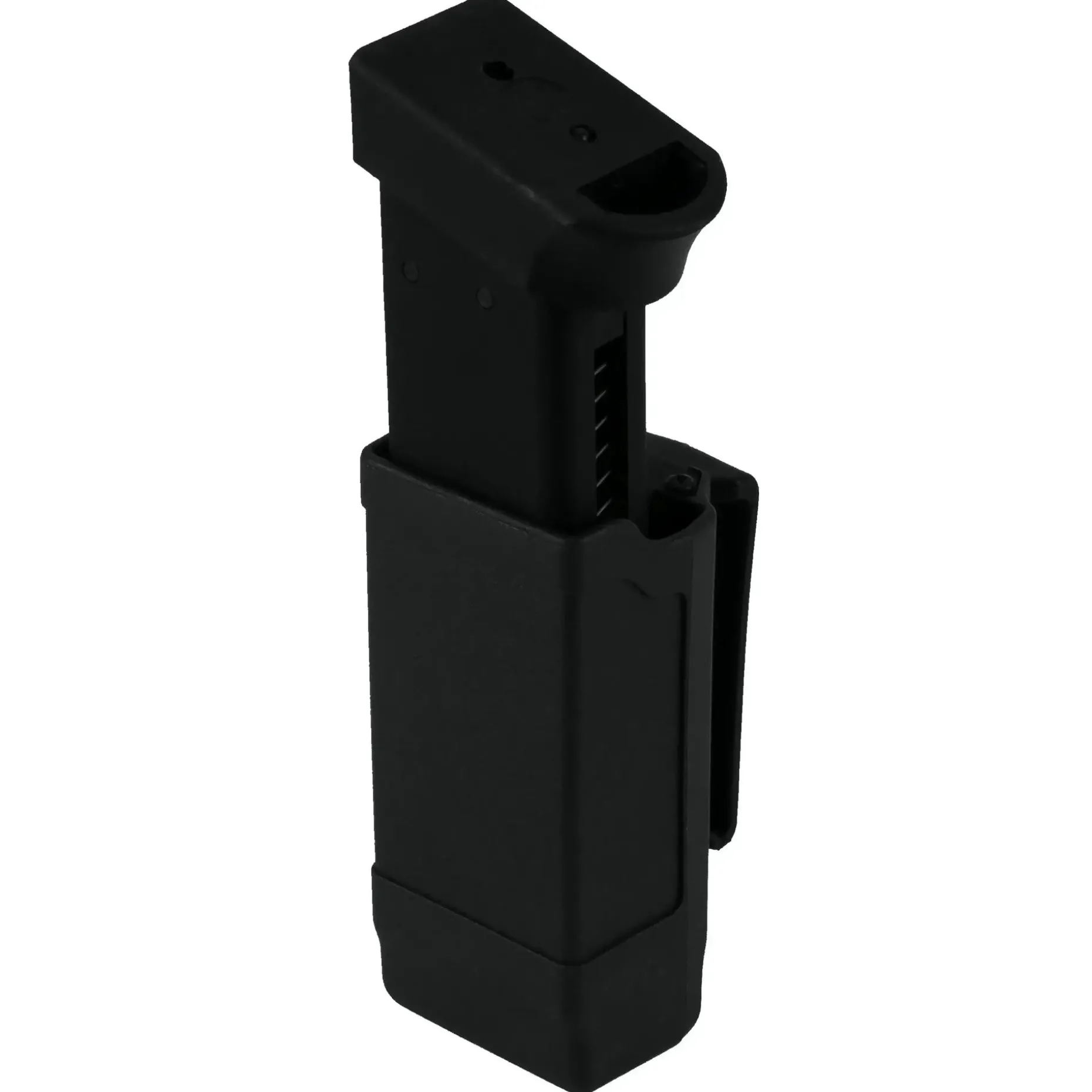 Die universell verwendbare Einzelmagazintasche für 9 mm / .40 sichert das Magazin mittels der eingebauten Feder. Der Gürtelclip lässt sich abnehmen und so kann diese Magazintasche auch paarweise auf den separat erhältlichen Dual Rail Accessory Belt Loop (Art Nr. 49524) montiert werden.