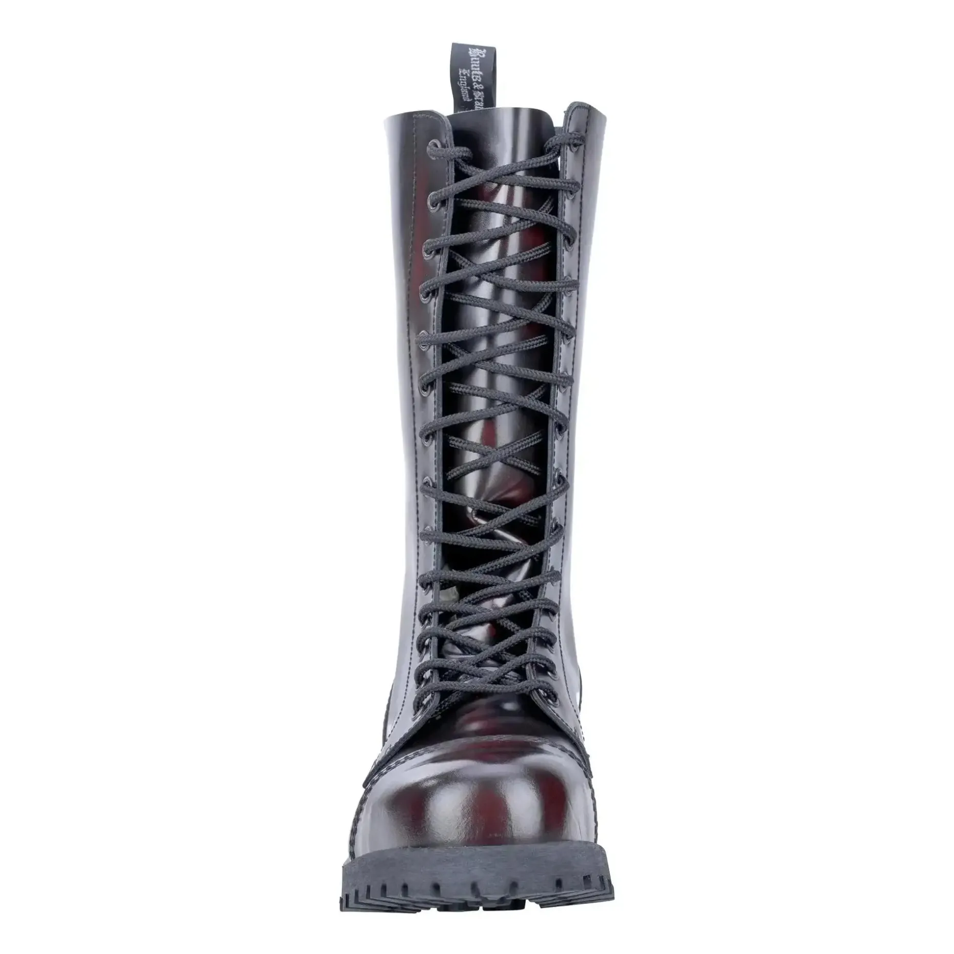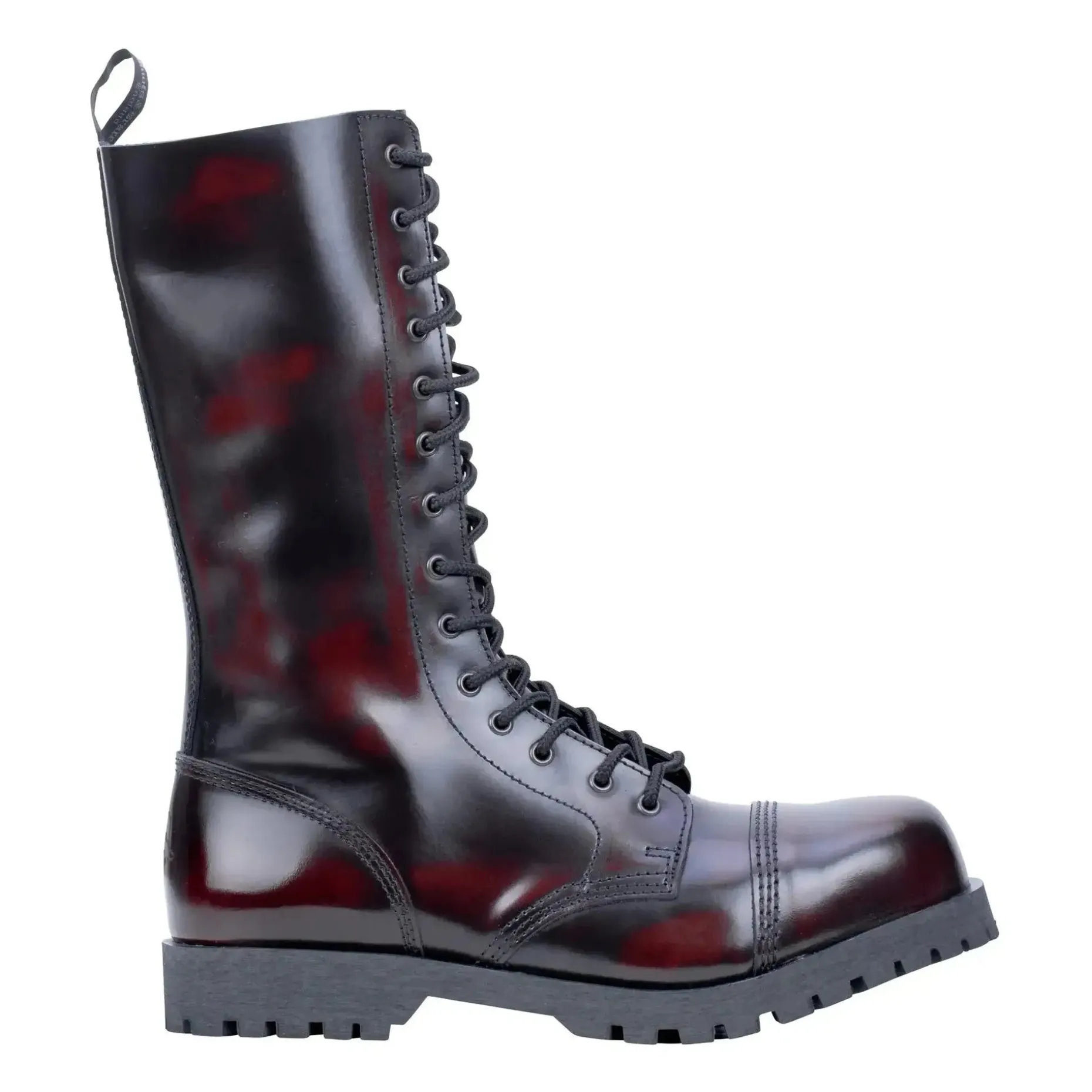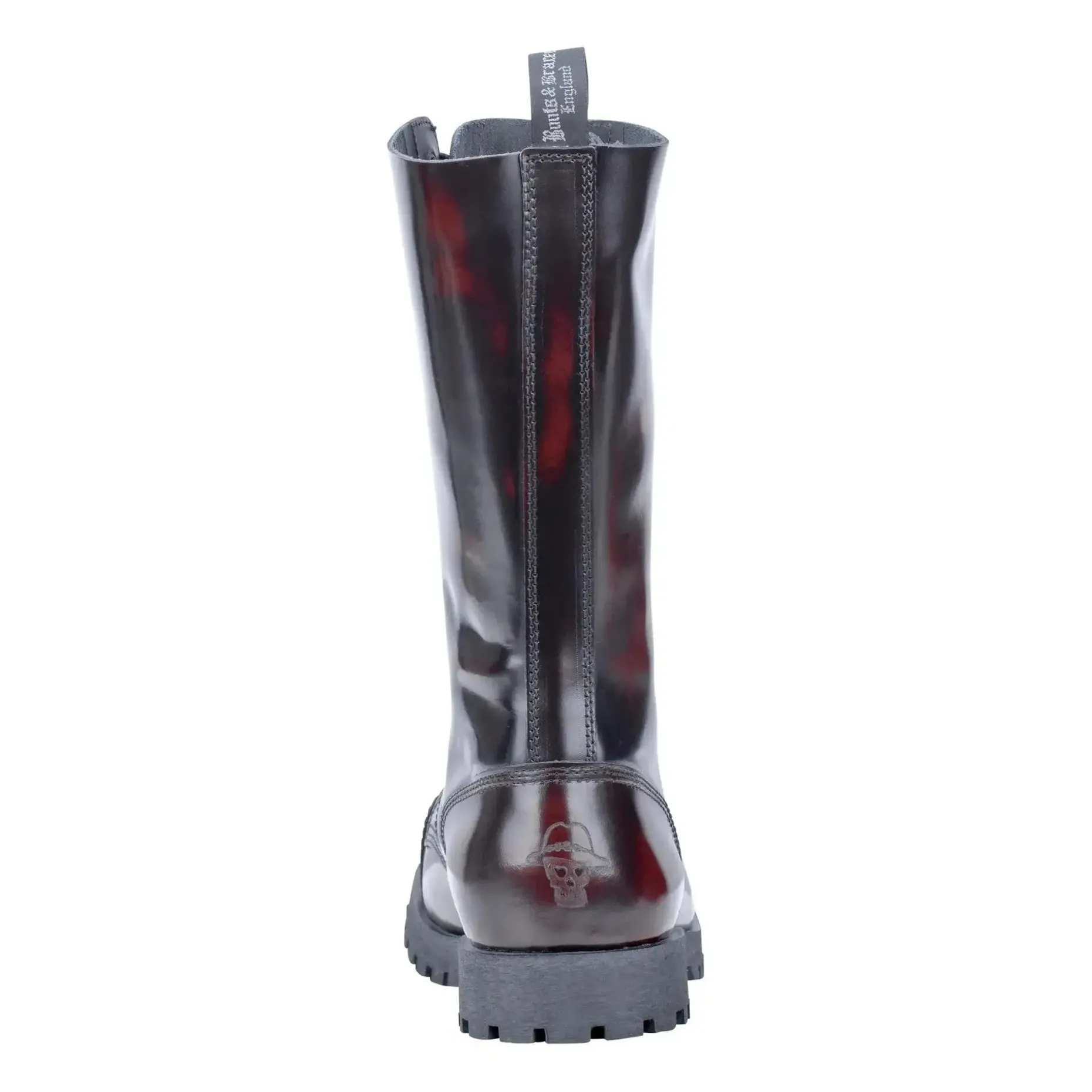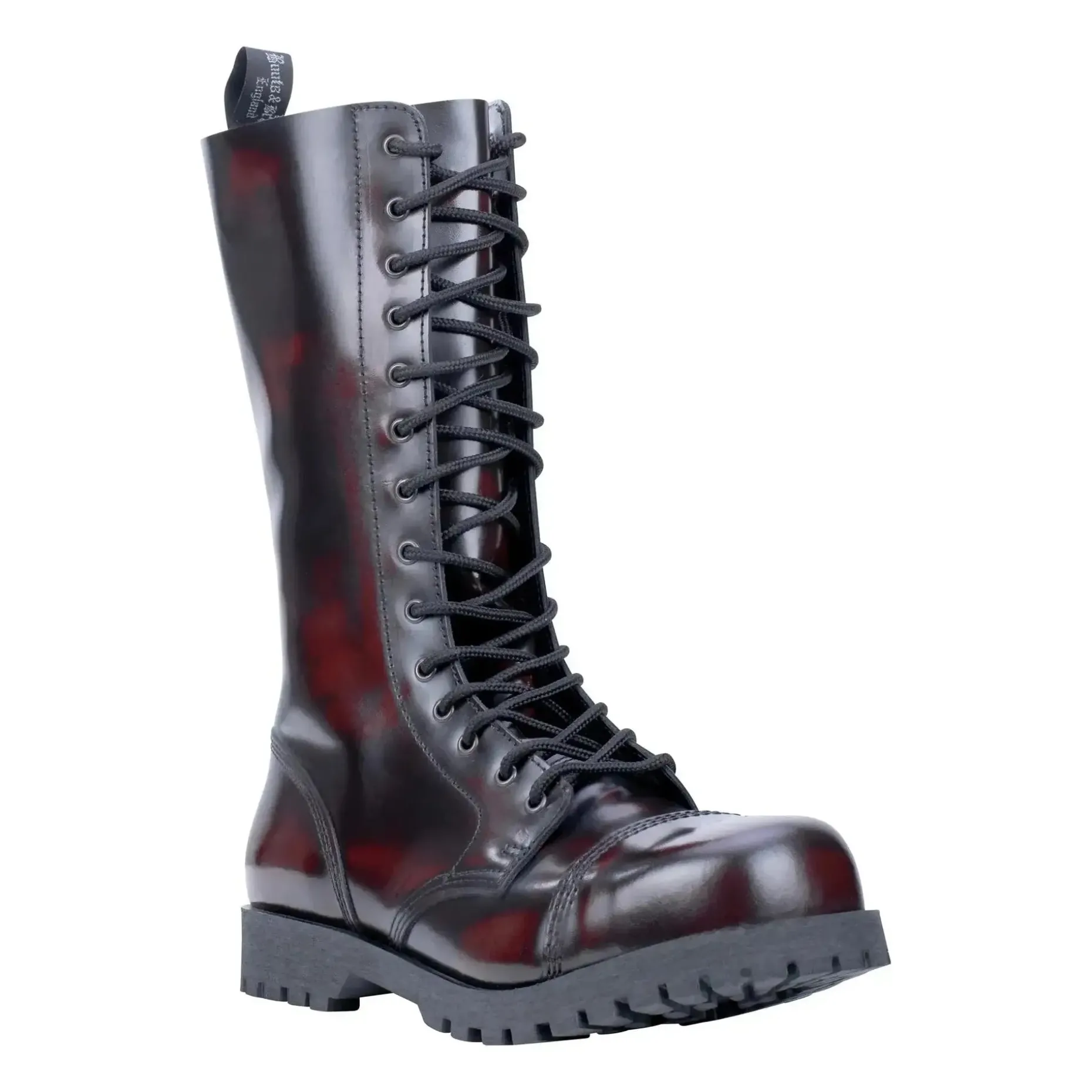 Der Boots & Braces Stiefel 14-Loch Rub Off burgundy mit Stahlkappe und Quernaht überzeugt mit hohem Tragekomfort. Durch die asymmetrischen Leisten sind sie bequemer als gerade geschnittene Modelle. Während die dreifachen Nähte an allen Strukturnahtstellen sie besonders stabil machen, ist die Gummisohle mit Zierschrauben zum besseren Halt ausgestattet. Das Glattleder ist poliert und dementsprechend glänzend. Bei Rub off-Leder wird eine spezielle Wachsbeschichtung genutzt. durch eine spezielle Bürsttechnik entsteht eine spezielle Farbgebung. Jeder Stiefel ist somit ein Unikat und wird am Ende der Produktionskette von Hand individuell gebürstet.
