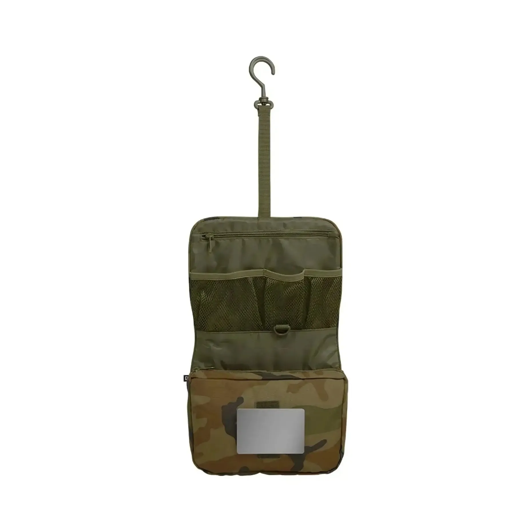 Ein besonderes Highlight der Brandit Toilettentasche ist der abklettbarer, bruchsicherer Spiegel, der immer griffbereit ist und Dir auch unterwegs ein perfektes Styling ermöglicht. Der drehbare Kunststoff-Haken zum Aufhängen sorgt dafür, dass Du die Tasche überall bequem aufhängen kannst.