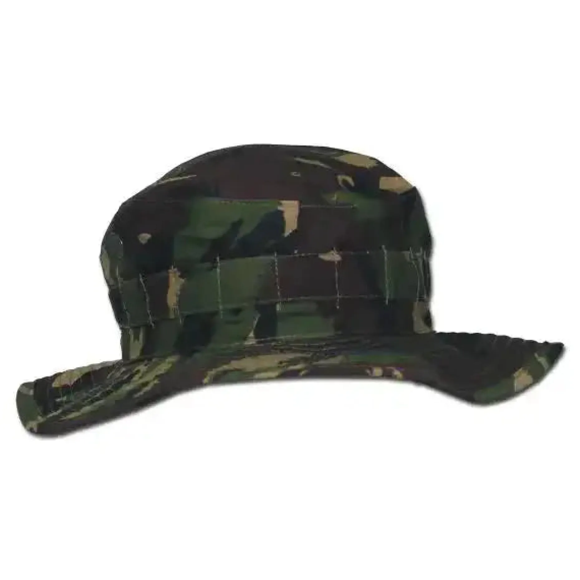 Neuwertiger Tropen-Buschhut aus Original-Beständen der britischen Armee. Das elastische Kinnband ist durch den praktischen Kordelstopper längenverstellbar. Die Krempe lässt sich hochklappen und dient als Sonnenschutz. Rundumlaufende Befestigungsschlaufen für Tarnmaterial.