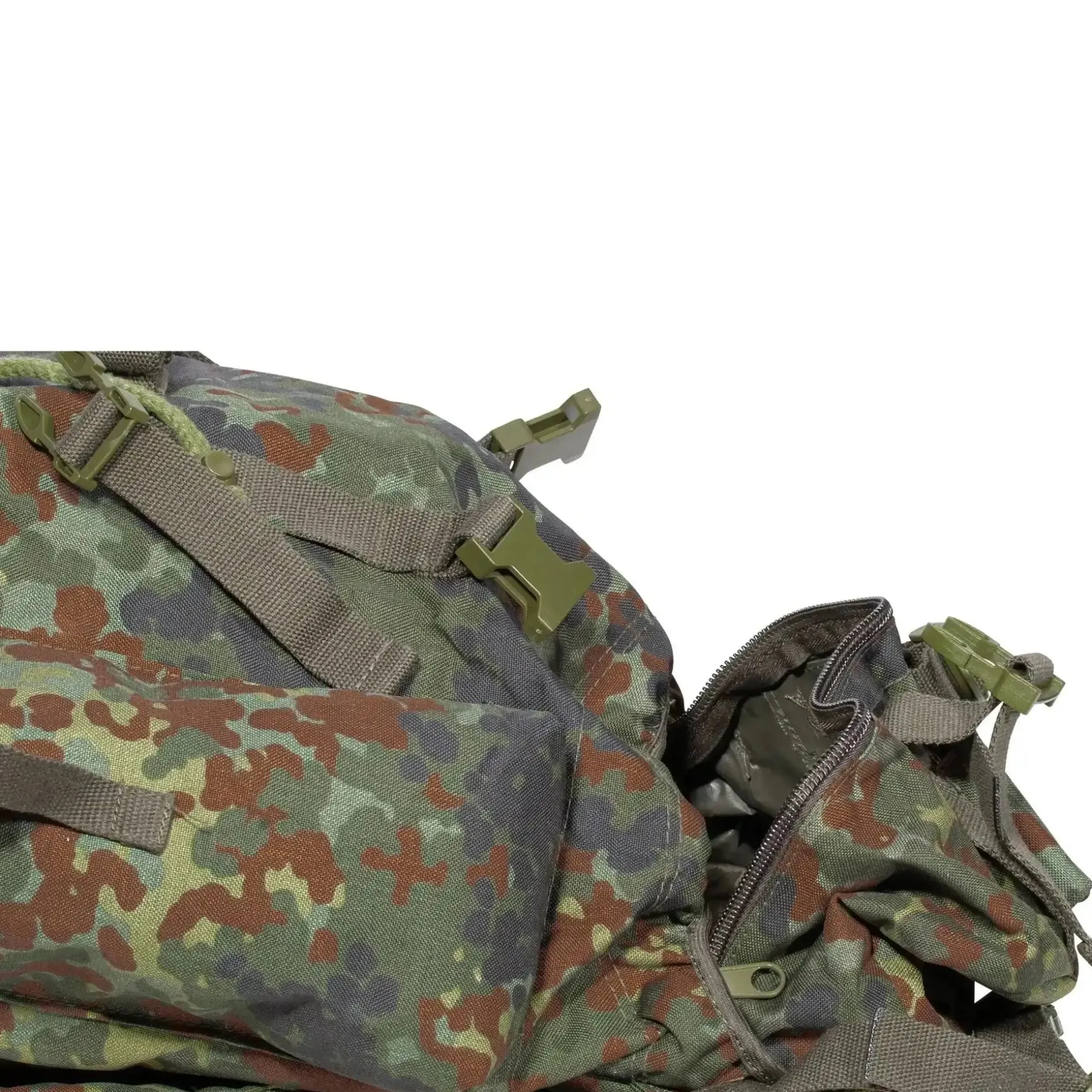 Das große Hauptfach mit variablem Zwischenboden ermöglicht eine flexible Packorganisation, während das Innenfach ideal für eine BW-Isomatte oder andere längliche Gegenstände ist. Zusätzlichen Stauraum bieten die zwei festen Außentaschen mit Schnellverschlüssen und die Deckeltasche für Kartenmaterial oder ähnliches. Dank der gepolsterten, verstellbaren Tragegurte bleibt der Rucksack auch bei schwerer Beladung bequem. Praktische Details wie eine Schneeschürze, Bodenfach mit Reißverschluss, diverse Befestigungsriemen und Materialschlaufen machen ihn zu einem unverzichtbaren Begleiter für Abenteuer.