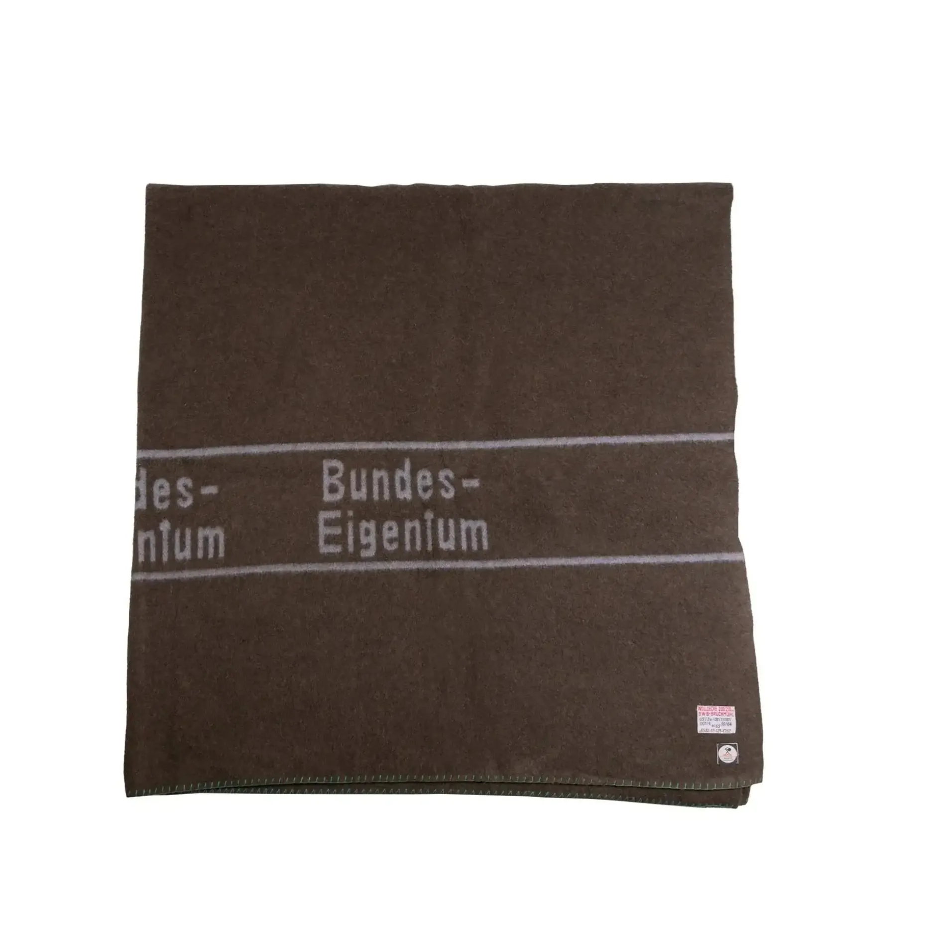 Original Bundeswehr Wolldecke mit Schriftzug „Bundeseigentum“ bzw. „BUND“ in Farbe braun oder oliv (je nach Vorrat) in gebrauchtem Zustand.
