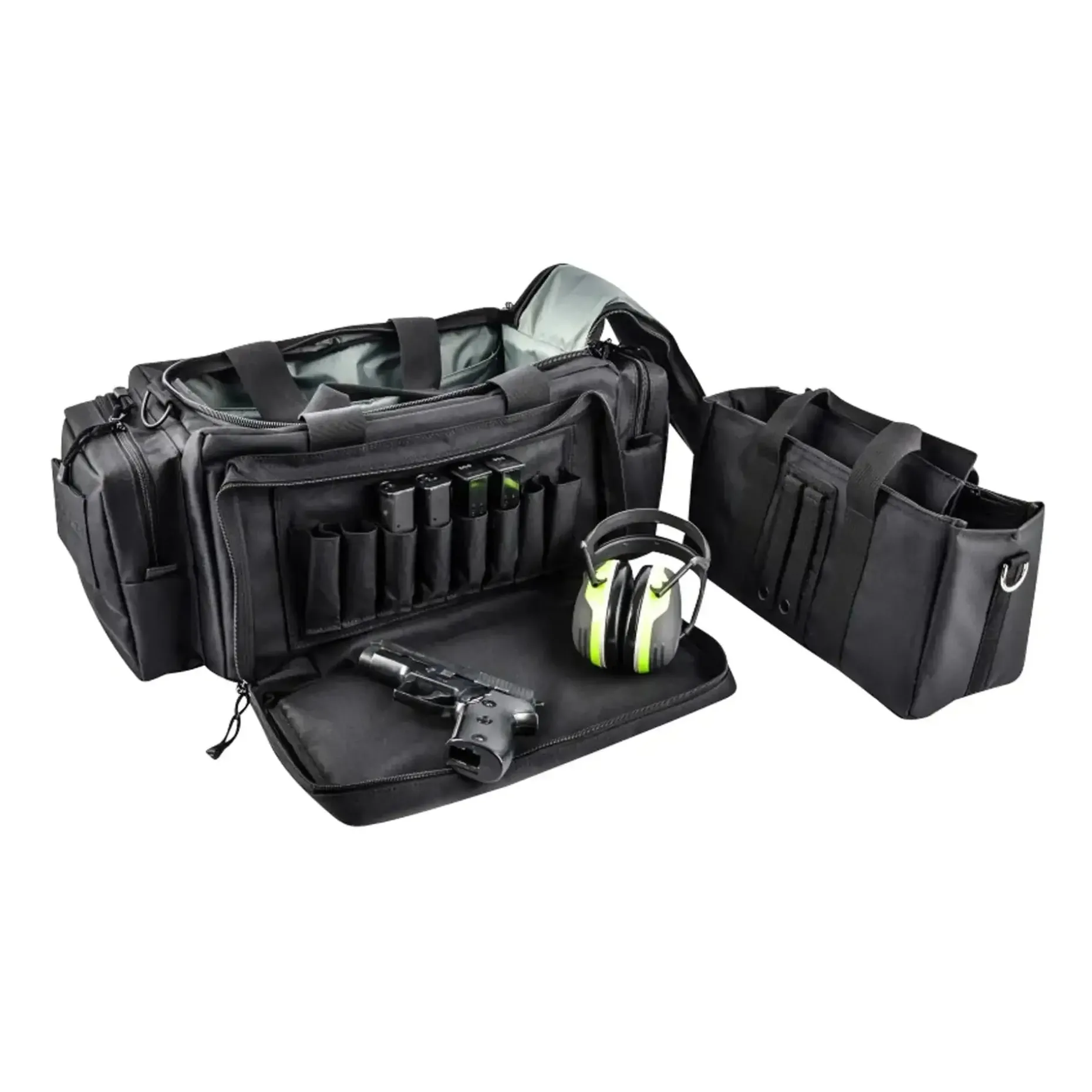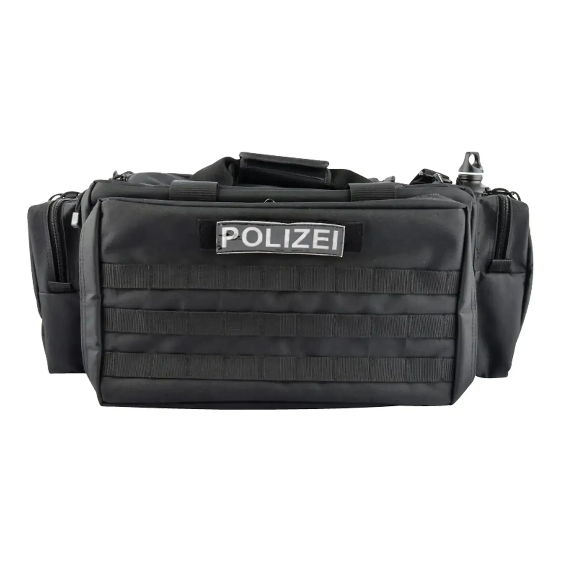 Ein großes Seitenfach mit getrennten Innenfächern für acht Magazine wird seitlich ergänzt durch vier kleinere Fächer mit Reißverschlüssen und ein Fach für eine Trinkflasche. Die herausnehmbare Innentasche mit Molle-Schlaufen verfügt über ein gepolstertes Hauptfach mit zwei verstellbaren Zwischenfächern und zwei Einschubtaschen mit Reißverschluss.