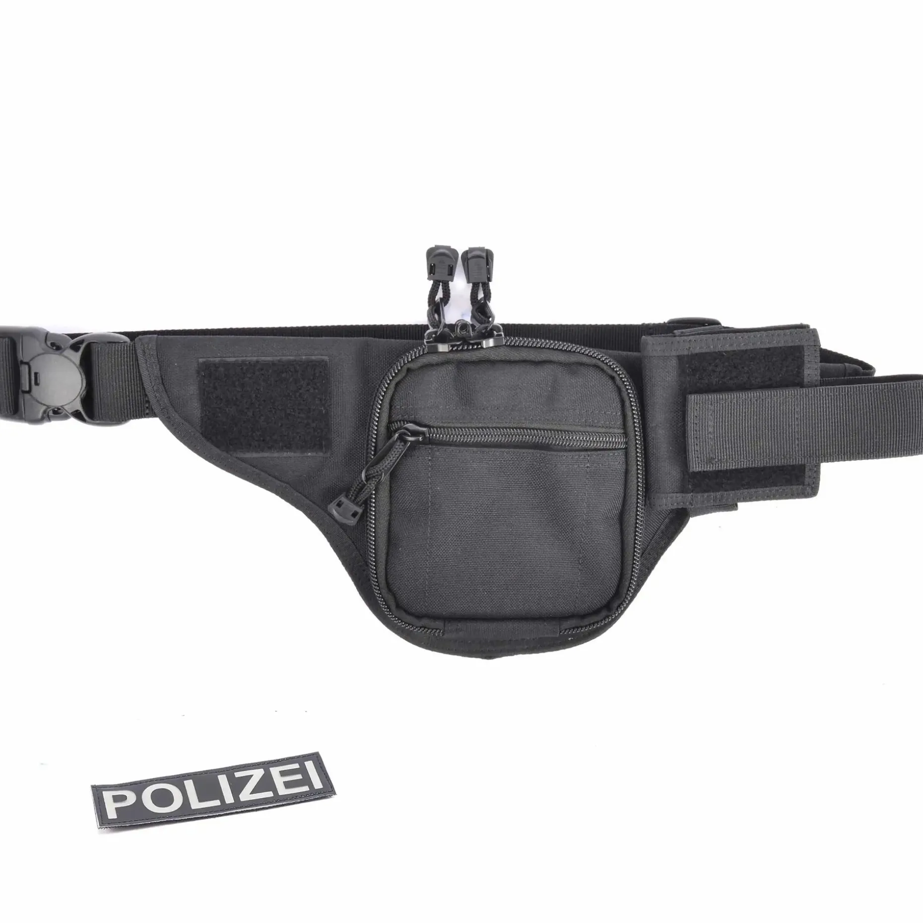 Eine kleine Zubehörtasche (z.B. für Handy, etc) kann außen, wahlweise rechts oder links angebracht werden, um zusätzlich die Kontur des Laufes zu verdecken. Das Hüfttaschenholster wirkt so noch unauffälliger. Der Hüftgurt verfügt über einen 3-Punkt-Sicherheitsverschluß und die Tasche selbst an der Rückseite über zwei Schlaufen mit Klettverschluss zur Sicherung des Hüfttaschenholsters am Gürtel. Kleinere Reservemagazine (z.B. Glock 26) oder Handy (nicht passend für Smartphone) können in der vorderen Reißverschlusstasche untergebracht werden.