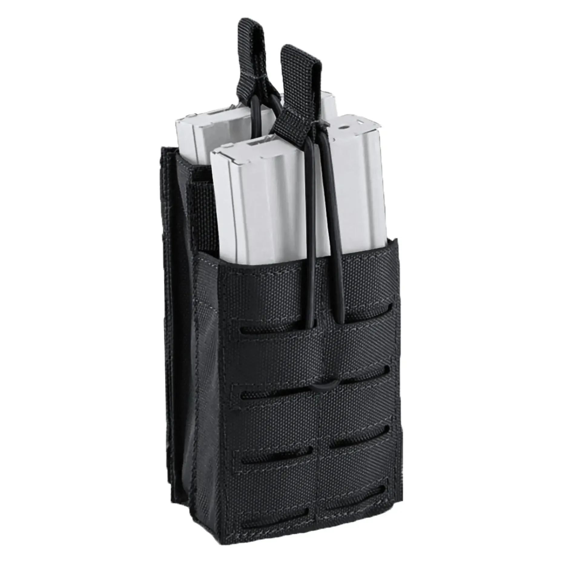 Die praktische Defcon 5 Magazintasche Split Shadow Lasercut nimmt zwei Sturmgewehrmagazine der Kaliber 5.56 x 45 mm und 7.62 x 39 mm auf. Alternativ kannst Du sie beispielsweise auch zum Verstauen von Funkgeräten nutzen. Durch die doppelreihige Anordnung nimmt die Tasche weniger Platz in Anspruch. Ein an der Oberseite der Tasche angebrachtes Gummiband mit Zuglasche sichert die Magazine während des Transports. Durch die Lasercut-Bauweise ist das Holster sehr leicht. Sie ist MOLLE-kompatibel.