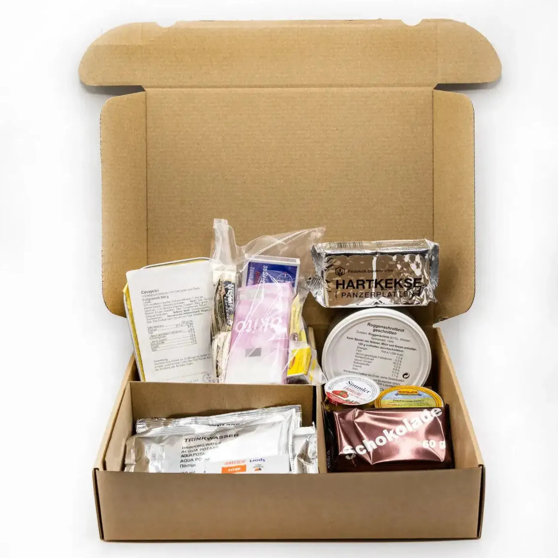 Weitere Beigaben wie isotonisches Getränkepulver, Kaffee und Tee, Zucker, Salz, Taschentücher und Streichhölzer runden das Versorgungspaket ab. Verpackt in einem wasserdichten Zipper-Beutel und einem kompakten Karton, lässt sich die EPa einfach lagern und transportieren. Perfekt auch als Notbevorratung für Haushalte nach den Empfehlungen des Bundesamtes für Bevölkerungsschutz und Katastrophenhilfe.