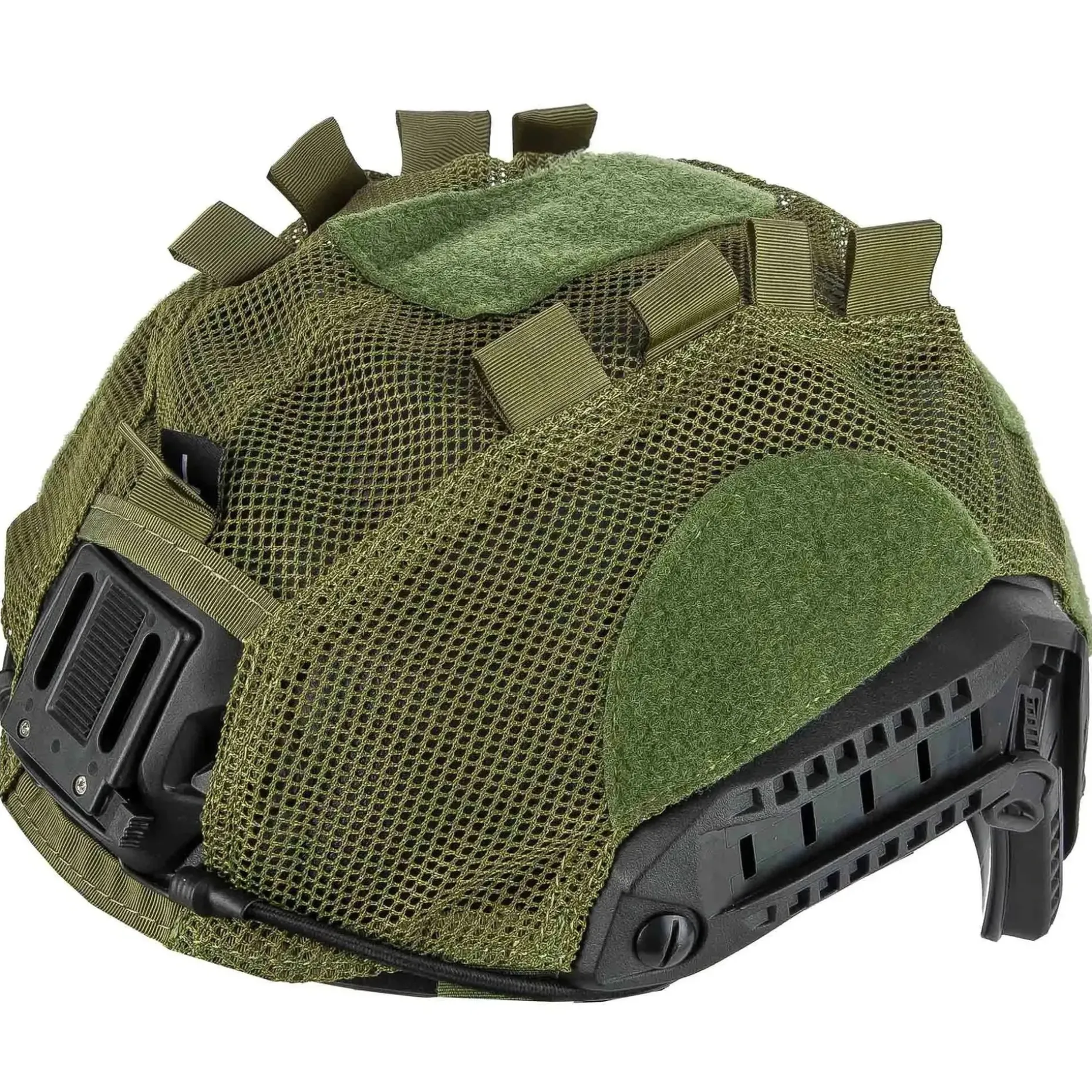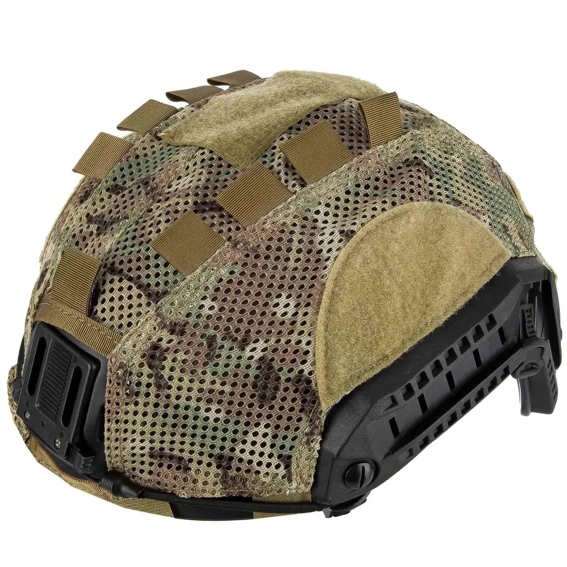 Das Helmcover der Marke FMA ist für den FAST Ballistic oder High Cut Helmet konzipiert. Es besteht aus Cordura sowie Meshgewebe und ist mit Klettflächen zur Anbringung von Patches, Helmlampen oder anderen Accessoires ausgerüstet. Fixiert wird das Cover am Helm mit Hilfe von innenliegenden Klettverschlüssen und zusätzlich mit zwei Bungee-Haken an der NVG-Montage des Helmes. Darüber hinaus ist das Cover mit einem einstellbaren Bungee-Cord ausgestattet, welches es erlaubt, auf dem Helm Ausrüstungsteile z.B. Strobe Lights zu sichern.