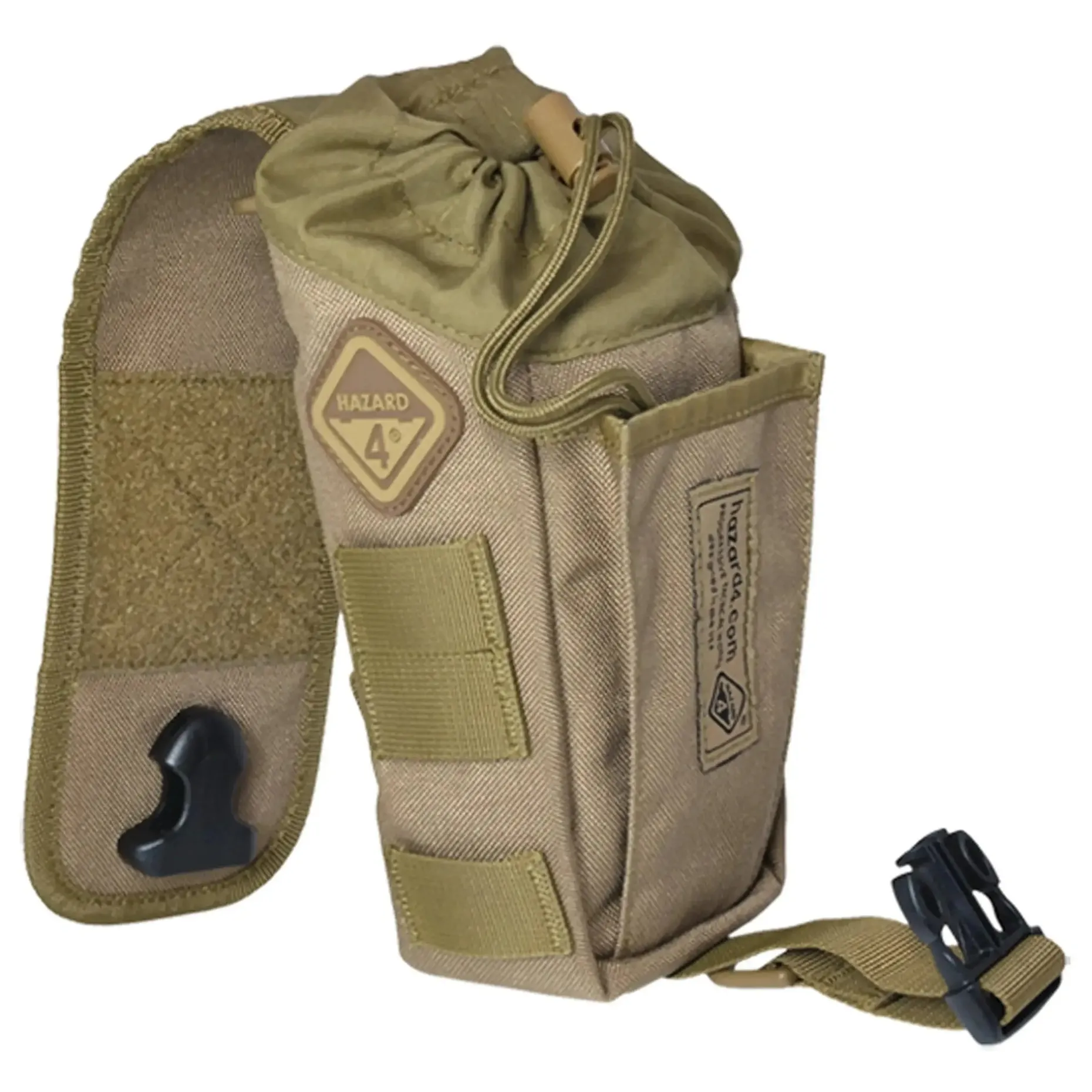 Ursprünglich entwickelt wurde diese Tasche als Wasserflasche oder für Munition. Sie kann per Molle-System an der Ausrüstung befestigt werden und ist so immer griffbereit. Die Lasche kann schnell geöffnet werden, aber dank des Kordelzugs bleiben auch kleinere Gegenstände sicher an ihrem Platz. Die Akkordeon-Fronttasche kann zur Aufbewahrung des Handys verwendet werden, da sie durch die Lasche geschützt wird. Neben dem Hazard 4 Logo als 3D-Patch finden sich Klettflächen zum Anbringen eigener Patches.