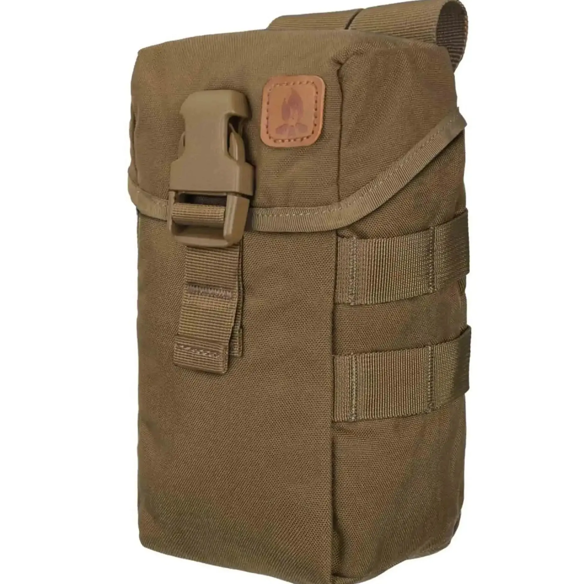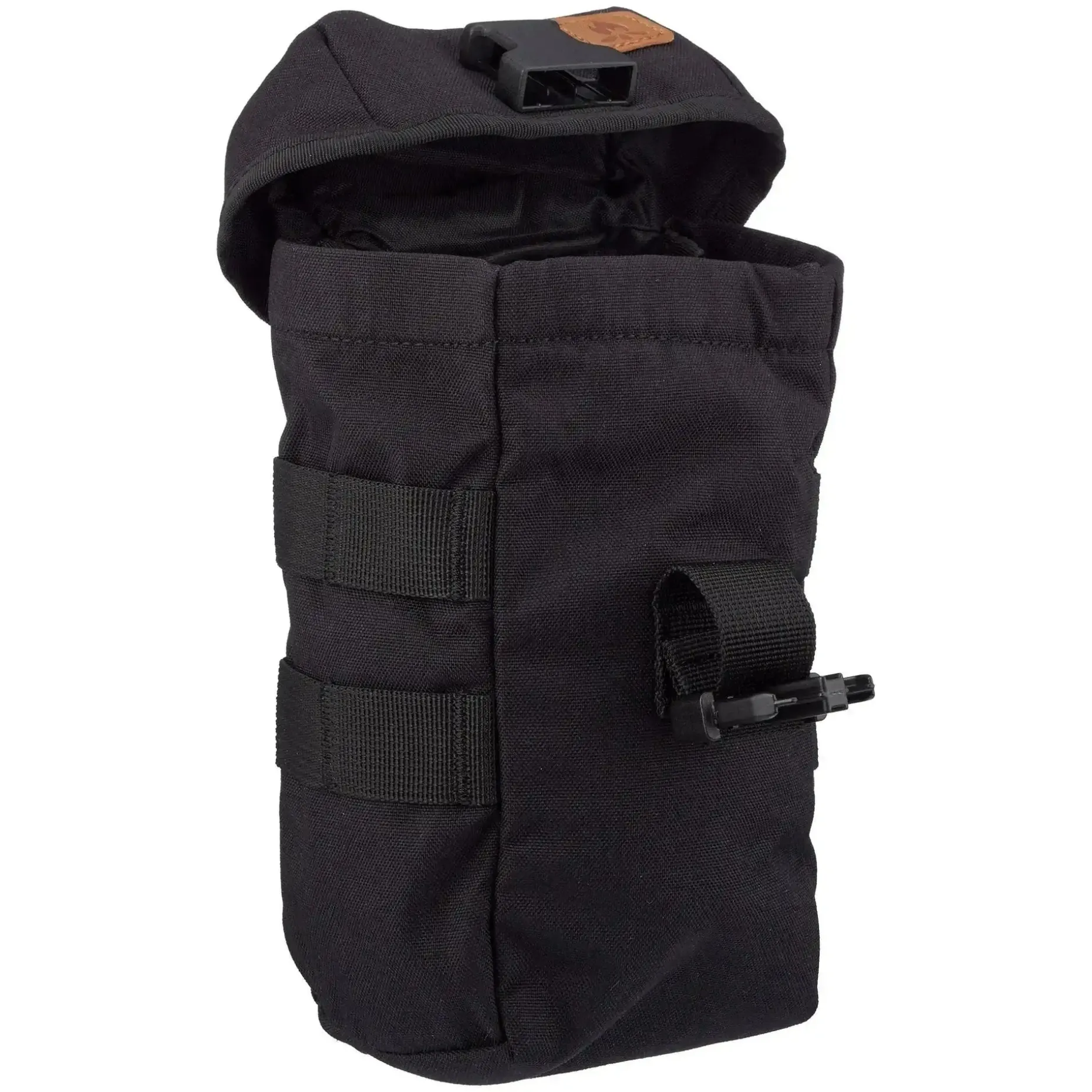 Das Hauptfach ist mit einer verstellbaren Klappe mit Schnellverschluss ausgestattet und lässt sich so an verschiedene Flaschengrößen anpassen. Zwei D-Ringe ermöglichen das Tragen mit einem Schultergurt (nicht enthalten), während MOLLE/PALS-Schlaufen auf der Rückseite eine flexible Befestigung an Rucksäcken, Gürteln oder Chest Rigs erlauben.