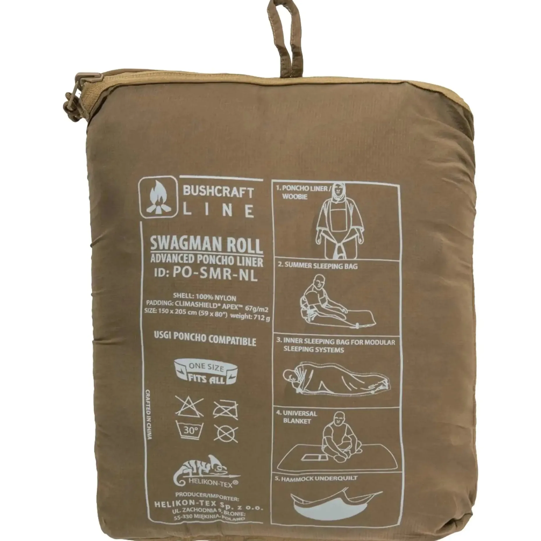 Der Swagman Roll Poncho® von Helikon-Tex ist mehr als nur ein Poncho – er ist ein echter Survival-Allrounder. Aus robustem WindPack Nylon mit DWR-Imprägnierung gefertigt, schützt er Dich zuverlässig vor Wind und leichtem Regen. Dank der Climashield Apex™ Isolierung (67 g/m²) hält er auch bei kühlen Temperaturen angenehm warm, ohne dabei aufzutragen oder die Bewegungsfreiheit einzuschränken. Der Swagman Roll lässt sich flexibel einsetzen: Ob als isolierende Zwischenschicht, Not-Schlafsack, Hängematten-Quilt oder klassischer Poncho – Du hast stets das passende Ausrüstungsteil dabei. Über Reißverschlüsse und Schlaufen kannst Du ihn komfortabel anpassen oder kompakt zusammenrollen und im mitgelieferten Packsack verstauen.
