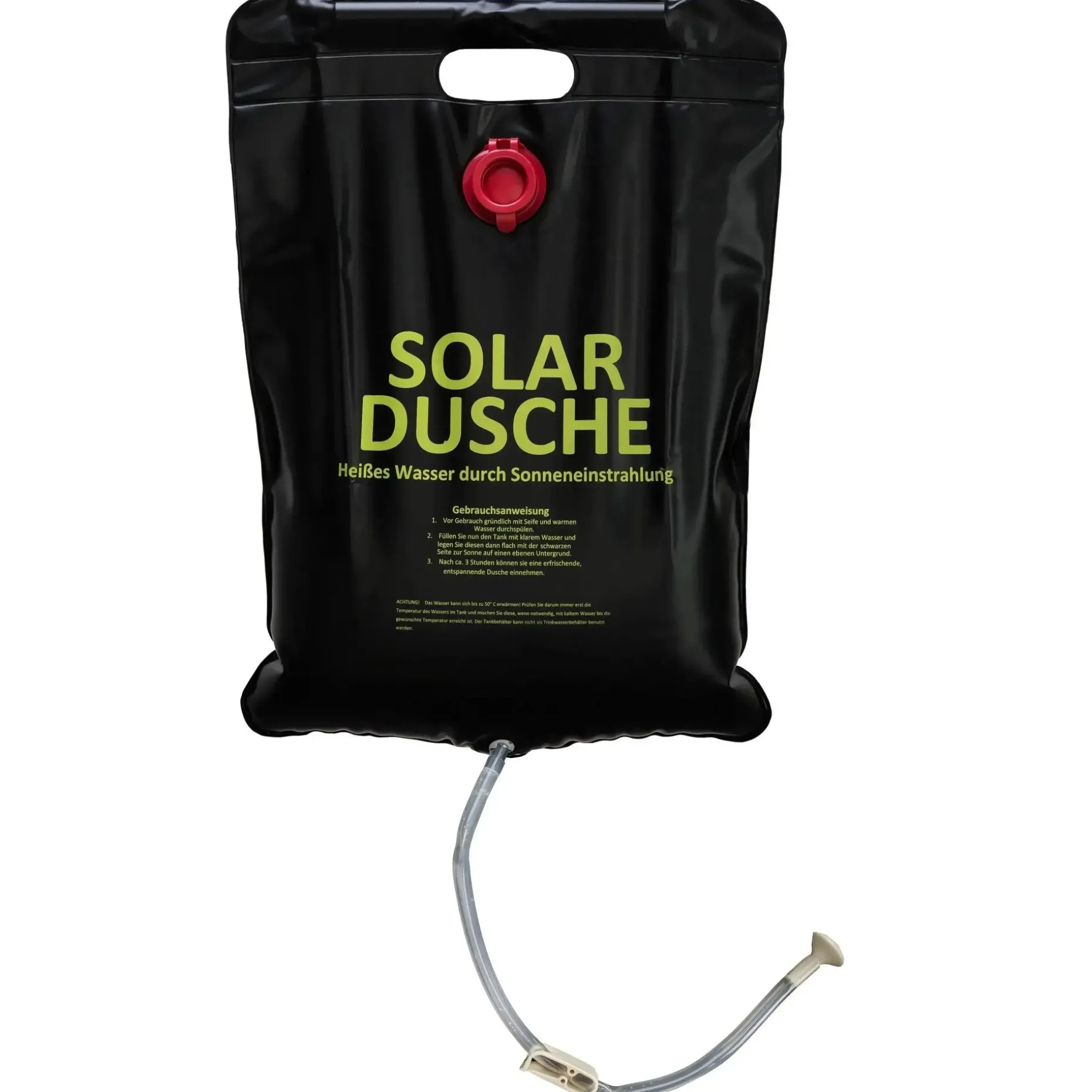 Rollbare Dusche aus PVC mit Aufhängevorrichtung und Stop-Go Ventil. Das Wasser wird durch Sonnenenergie auf bis zu 32°C erwärmt. Im Lieferumfang enthalten ist ein Seil mit Haken um die Dusche an Bäumen o.ä. zu befestigen.