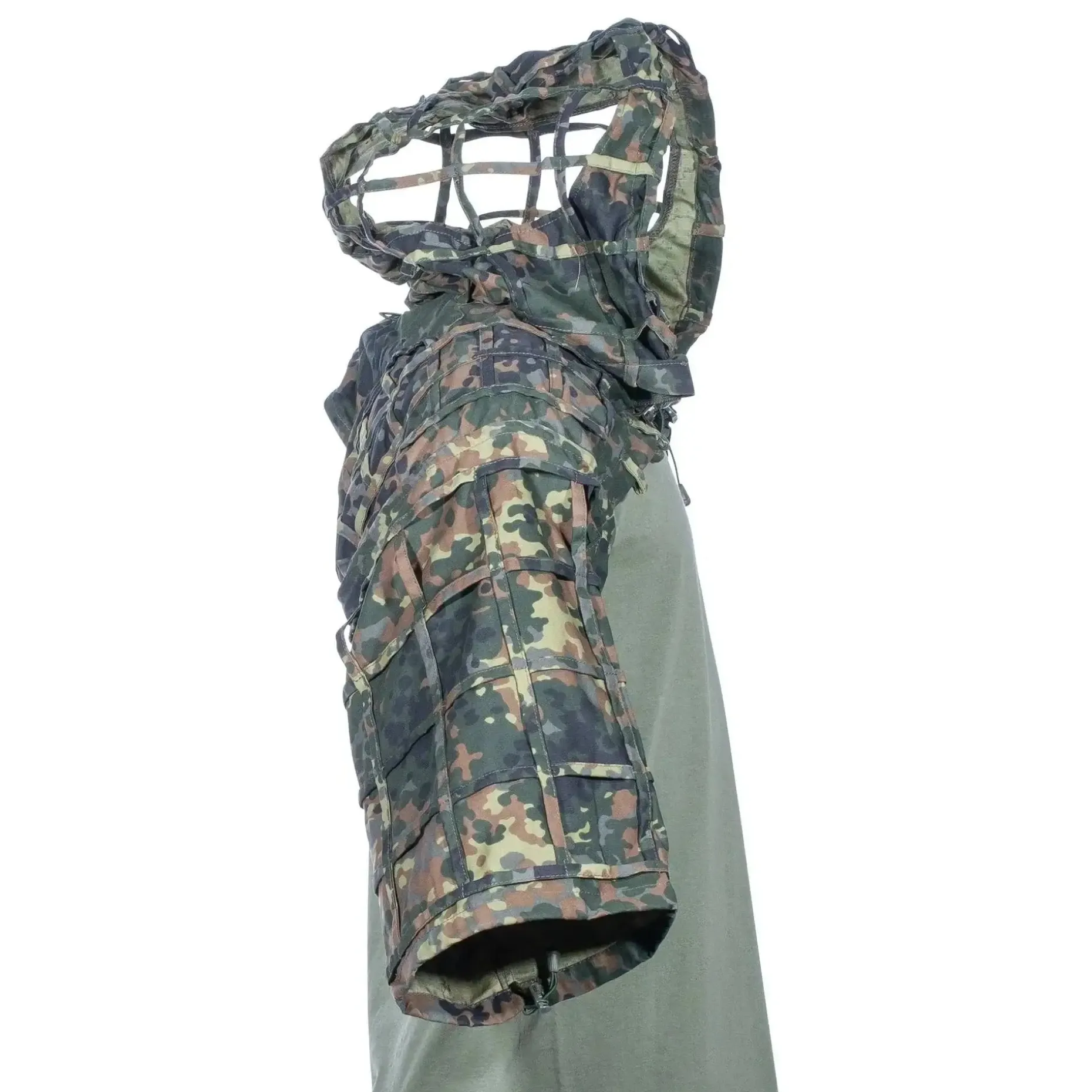Der minimalistische Viper-Hood wird über der Uniform und der Ausrüstung getragen und ist aus leichtem, aber strapazierfähigem Stoff gefertigt. Die Basis des Anzugs besteht aus einem boleroartigen Überzug mit aufgenähtem Tarnnetz. Die verstellbare Brustschnalle und die in den Ärmeln integrierten Schockschnüre bieten Dir ein hohes Maß an Regulierung und Komfort. Die übergroße, skelettierte Kapuze ist geräumig genug, um einen Helm zu bedecken, ohne den Bewegungsspielraum des Kopfes einzuschränken. Ein flexibler, eingenähter Draht am Rand der Kapuze hilft, sie in die richtige Form zu bringen, während mehrere Kordeln für eine gute Regulierung sorgen. Das eingearbeitete Netz bietet reichlich Platz für zusätzliche Vegetation und tarnende Stoffteile.