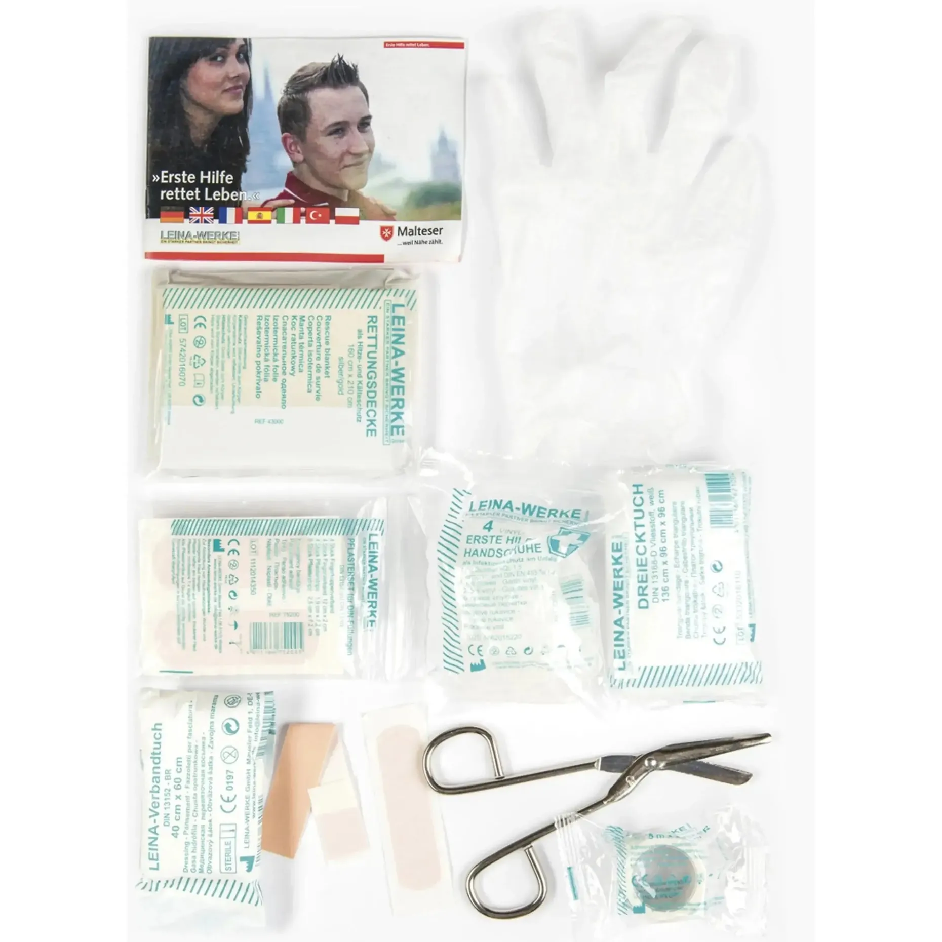 – Pflasterset: 4x Wundschnellverband 10 x 6 cm, 2x Fingerkuppenverband, 2x Fingerverband 12 x 2 cm, 2x Pflasterstrips 1,9 x 7,2 cm, 4x Pflasterstrips 2,5 x 7,2 cm
