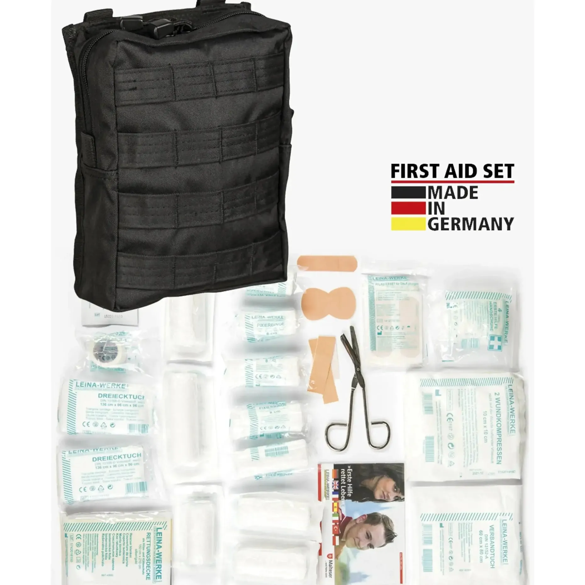 – Pflasterset: 4x Wundschnellverband 10 x 6 cm, 2x Fingerkuppenverband, 2x Fingerverband 12 x 2 cm, 2x Pflasterstrips 1,9 x 7,2 cm, 4x Pflasterstrips 2,5 x 7,2 cm