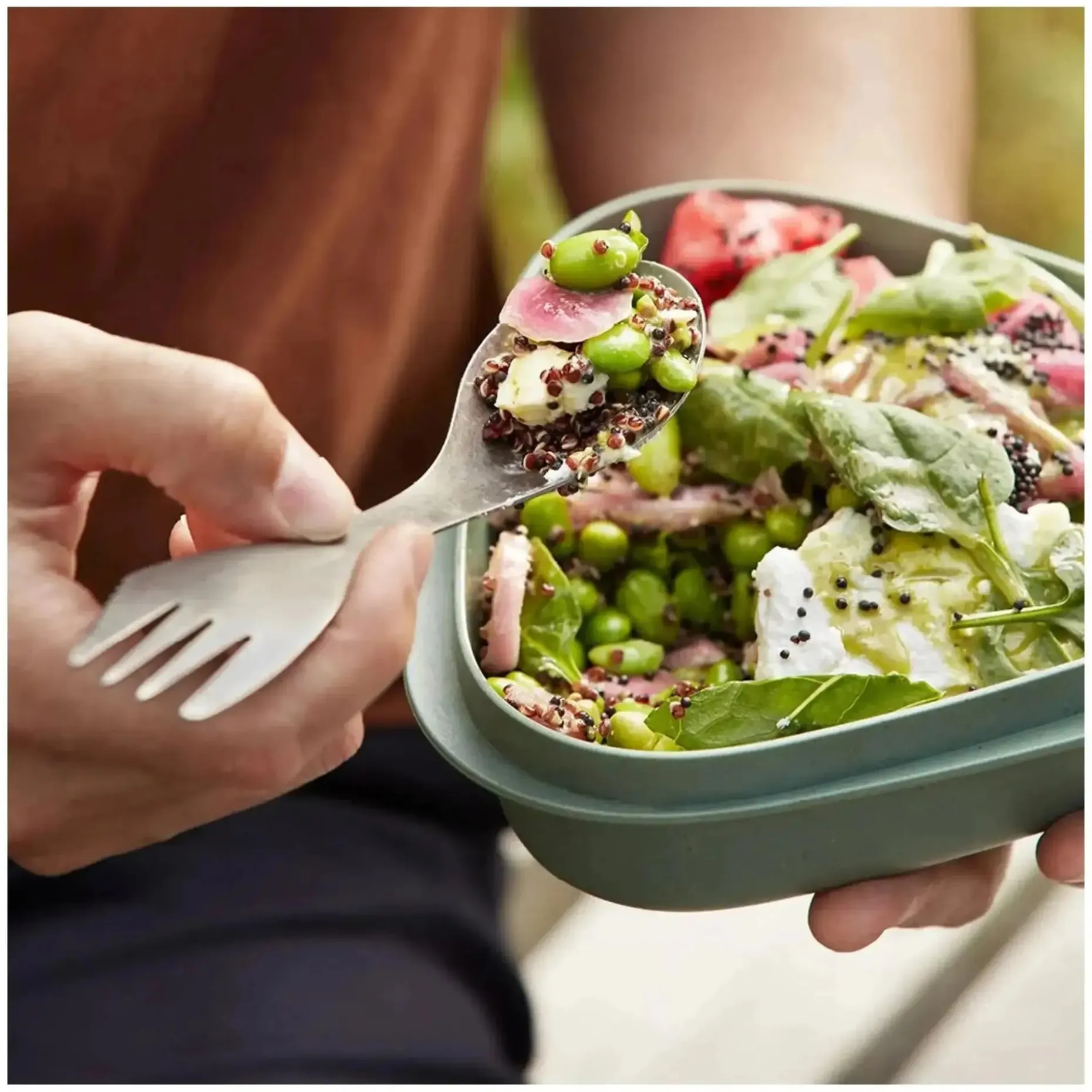Der extrem leichte Light my Fire Göffel Spork Titanium vereint Löffel, Gabel und Messer. Er ist sehr stabil und somit bestens für Outdoor-Ausflüge geeignet. Das genutzte Material bringt mehrere Vorteile mit sich: Da die polierte Oberfläche hypoallergen ist, kommt kein metallischer Geschmack auf. Zudem besitzt Titan eine hervorragende Elastizität. Auf diese Weise hält der Göffel auch heißen Speisen stand. Außerdem ist er spülmaschinenfest und frei von BPA.