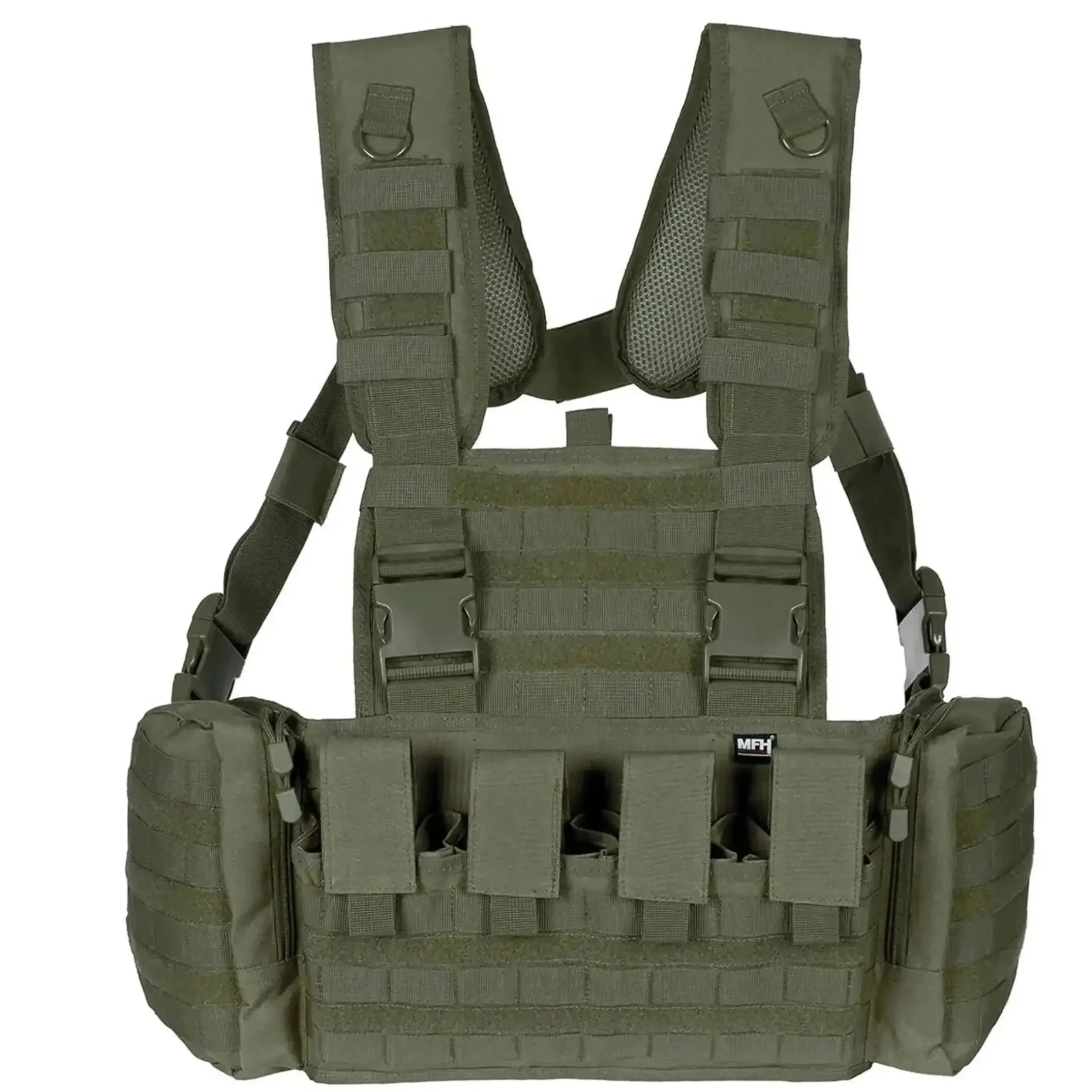 In zwei seitlichen Mehrzwecktaschen mit 2-Wege-Reißverschluss sowie Molle-Aufnahmeschlaufen und einem D-Ring innen kannst Du zum Beispiel eine 1 Liter US Feldflasche verstauen. Des Weiteren ist der Chest Rig mit vier verstellbaren Magazintaschen mit Klett vorne ausgestattet. Diese ist anpassbar auf alle gängigen Magazine und jeweils als Doppelmagazintasche nutzbar. Ein einklappbares Frontpanel mit Kartenfach und ein Einschubfach mit Klett an der Innenseite vorne runden den Mission ab. Außerdem hat die komplette Weste außen Molle-Aufnahmeschlaufen und Klettflausch zur Befestigung von zusätzlicher Ausrüstung. Sie ist auch über ballistischen Schutzwesten tragbar.