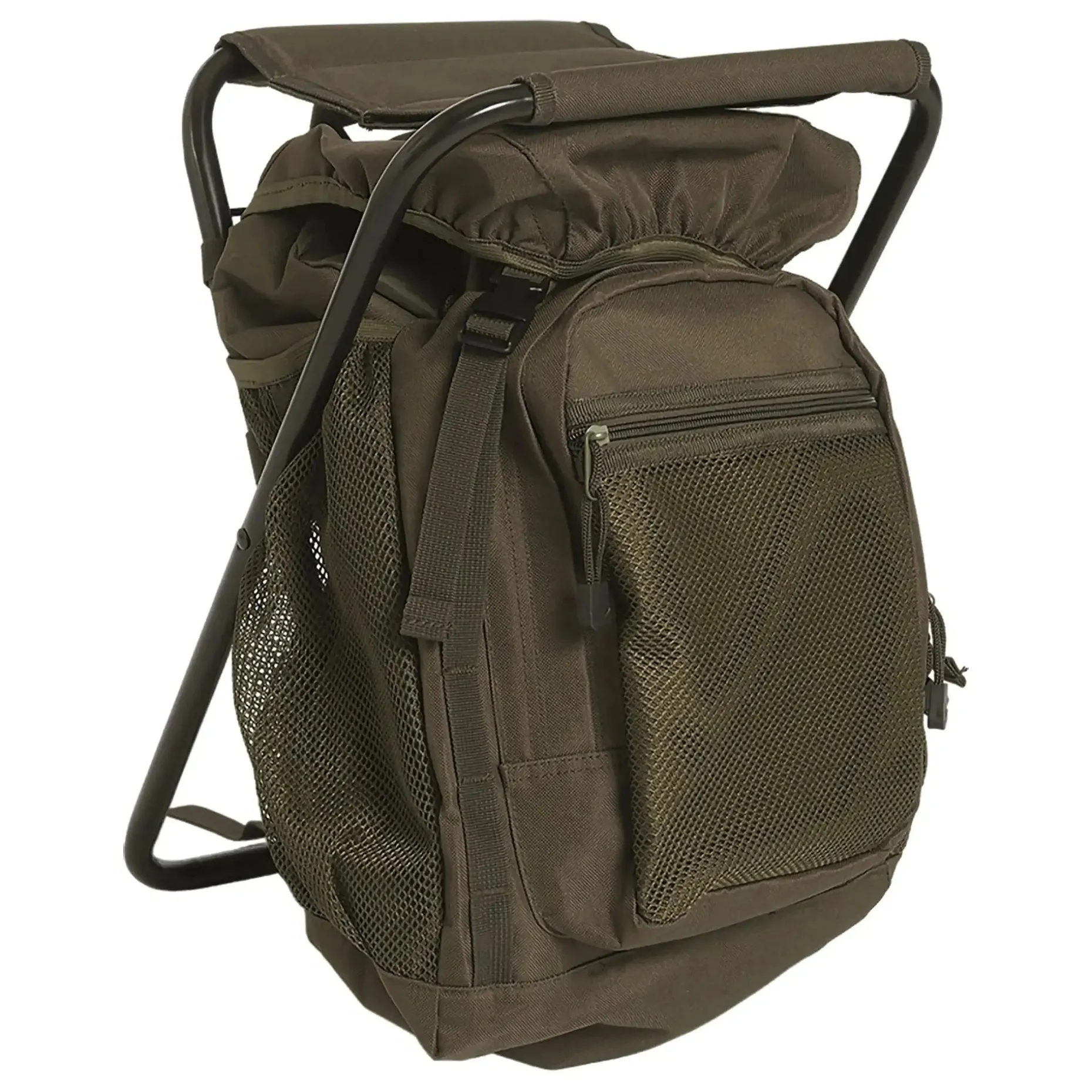 Dieser Rucksack mit Hocker ist ein idealer Outdoorbegleiter. Durch die breite Bodenfläche steht er auch auf unebenem Gelände sicher und ist mit seinem Klapprahmen aus Eisen robust und trotzdem gut zu tragen. Im großzügig bemessenen Hauptfach des Rucksacks und in den Netztaschen findet alles Platz, was man bei der Outdoortour dabeihaben will