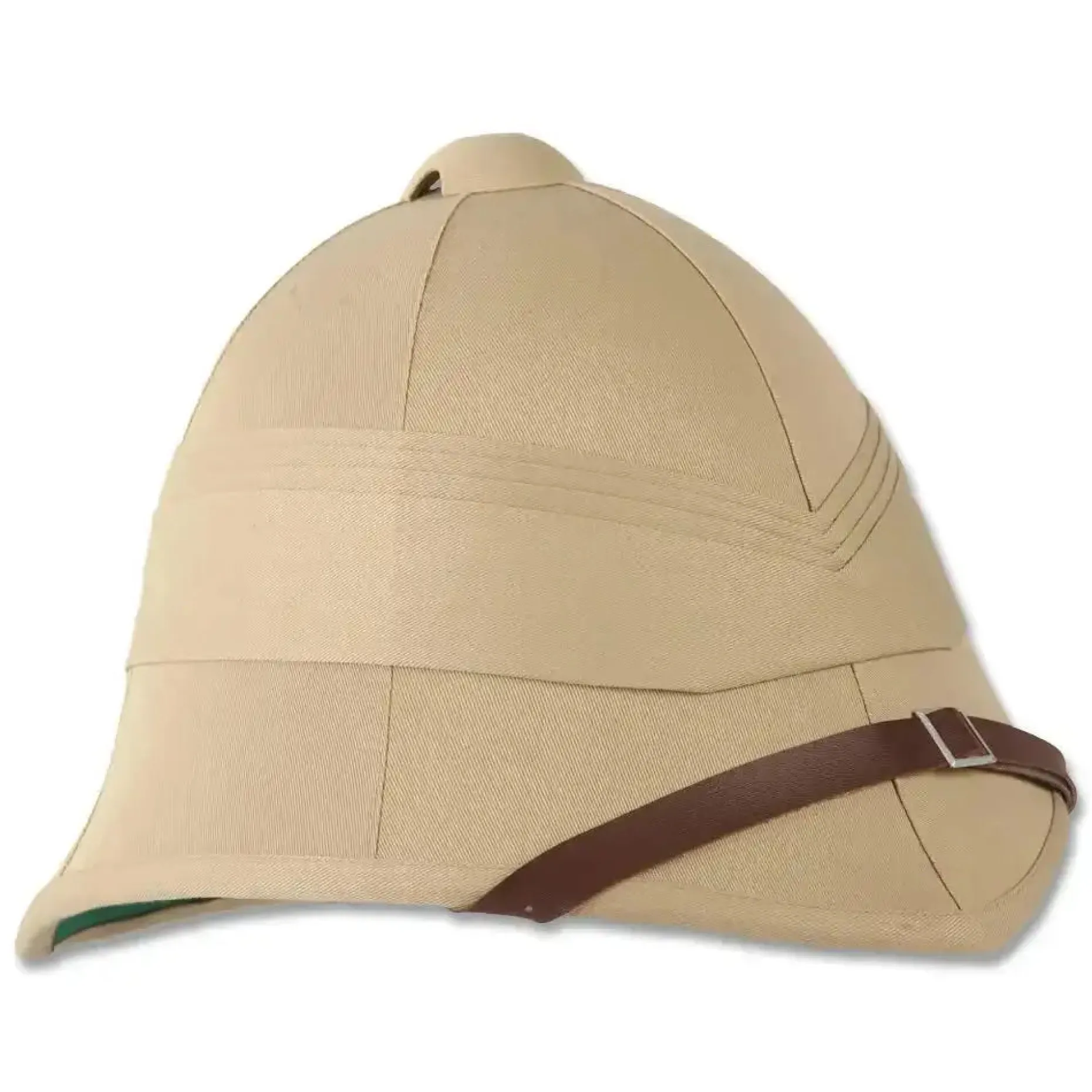 Britischer Tropenhelm mit verstellbarem Kinnriemen. Der formgebende Kern dieses Helmes ist das Pflanzenmark eines vietnamesischen Holunders. Die engl. Bezeichnung dieses Helmes ist Pith helmet, was so viel bedeutet wie (Pflanzen-)Mark Helm.