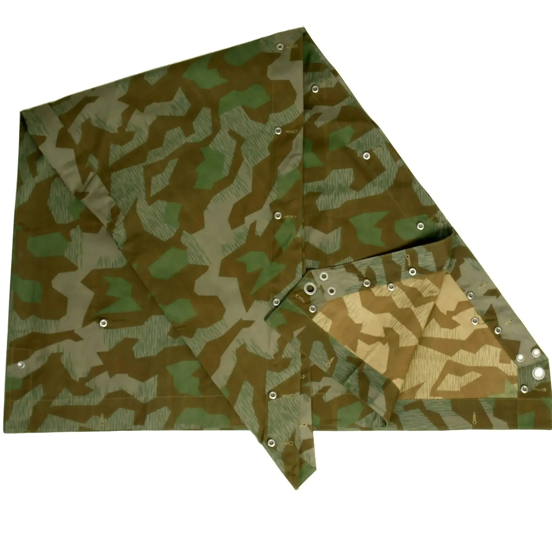 Die Dreieckszeltbahn M34 Repro ist eine hochwertige Reproduktion in Pyramidenform, hergestellt aus wasserabweisendem und robustem Baumwollgewebe. Mit Schlaufen und einem Durchgriff in der Mitte kann die Zeltbahn auch als Poncho verwendet werden. Zudem können aus 4 Zeltbahnen ein komplettes Zelt aufgebaut werden. Die splintertarn Farbgebung verleiht der Dreieckszeltbahn M34 einen authentischen Look. Ideal für Outdoor-Aktivitäten und Campingabenteuer, bietet dieses vielseitige Produkt Schutz vor Witterungseinflüssen und ist einfach zu transportieren.