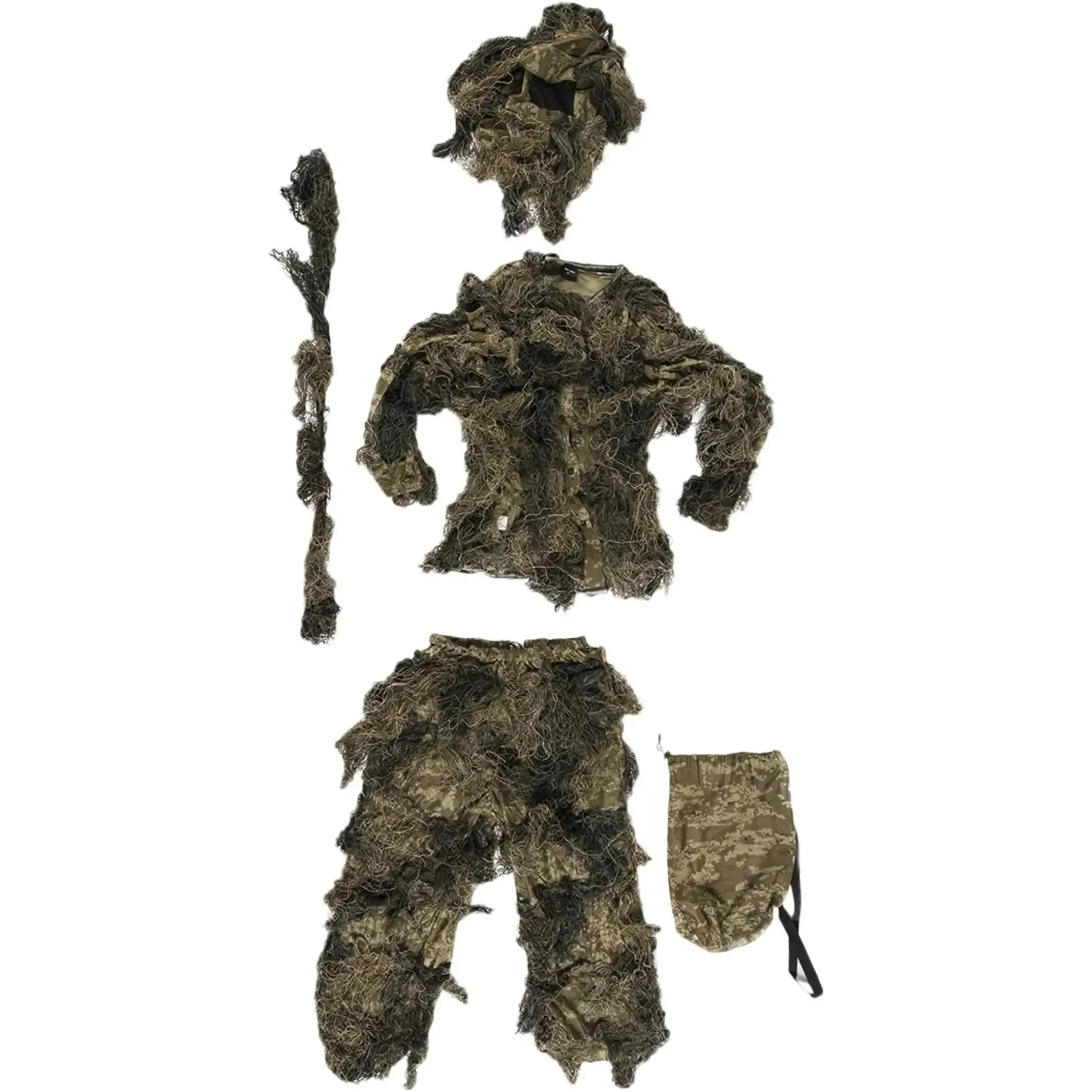 Als Trägermaterial dient ein sehr engmaschiges Netzgewebe im Tarndesign, auf welchem Fäden in Streifenabschnitten aufgenäht sind. Jacke und Hose werden über normaler Bekleidung getragen.