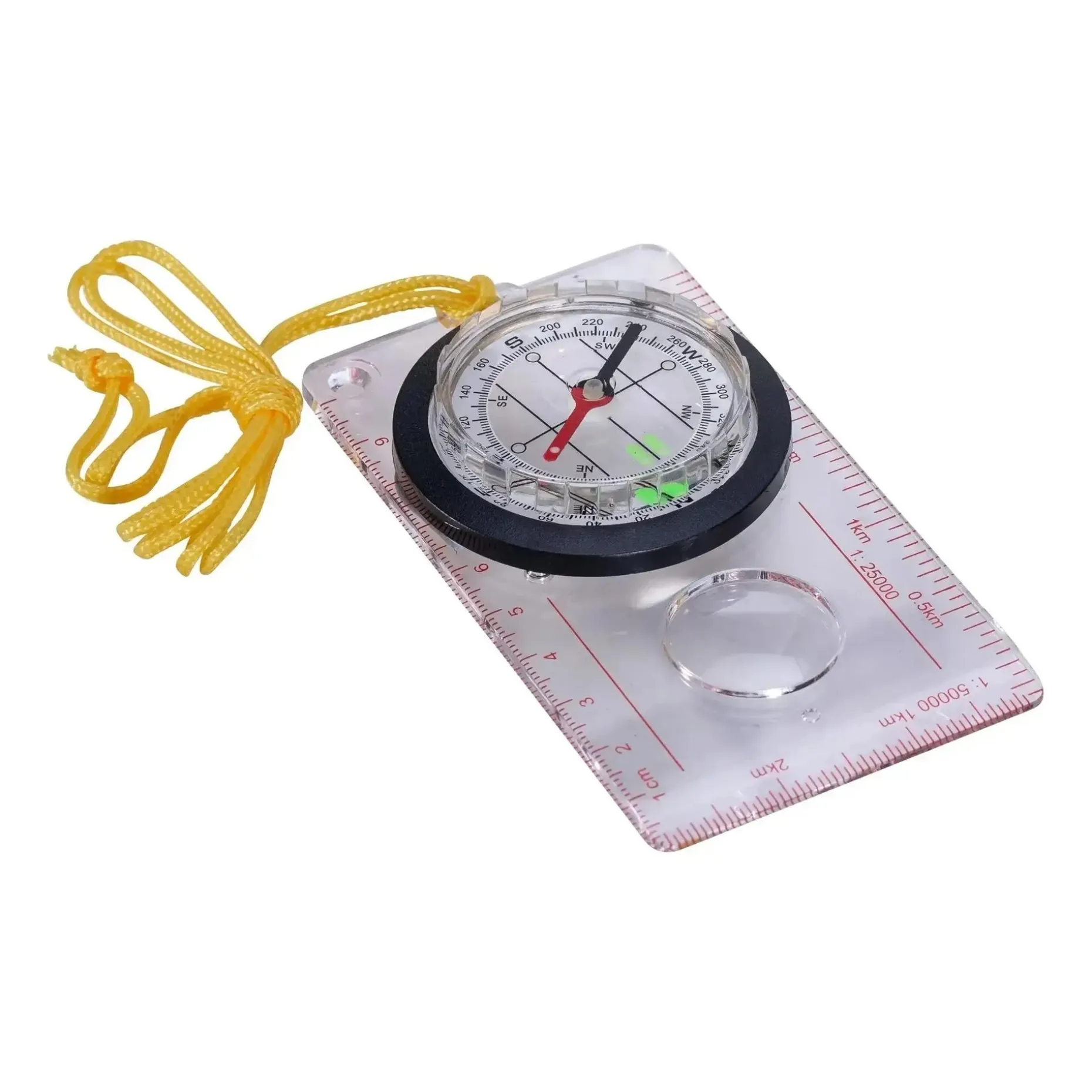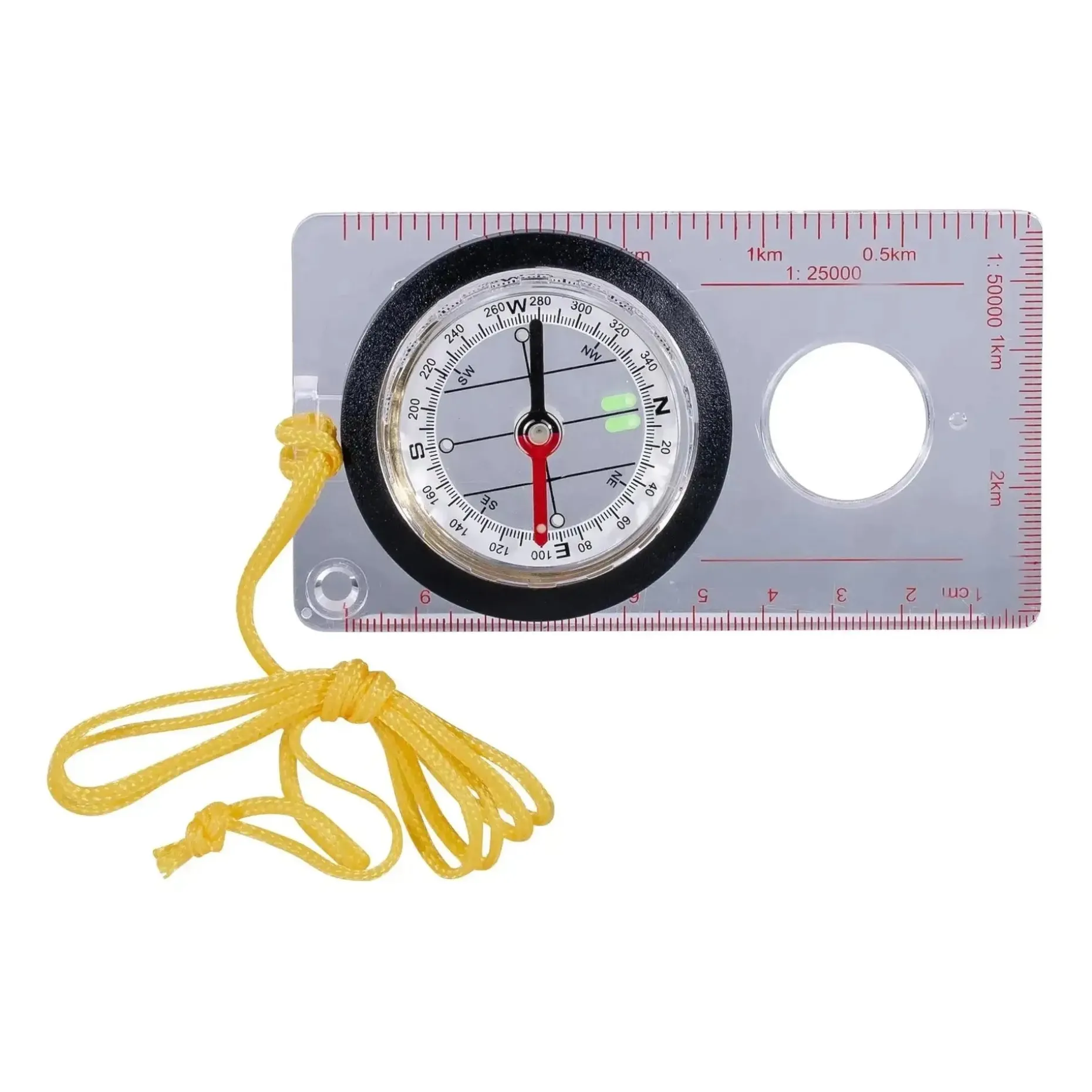 Fluoreszierende Kompassplatte und Nadel, für die grobe Orientierung im Dunkeln.