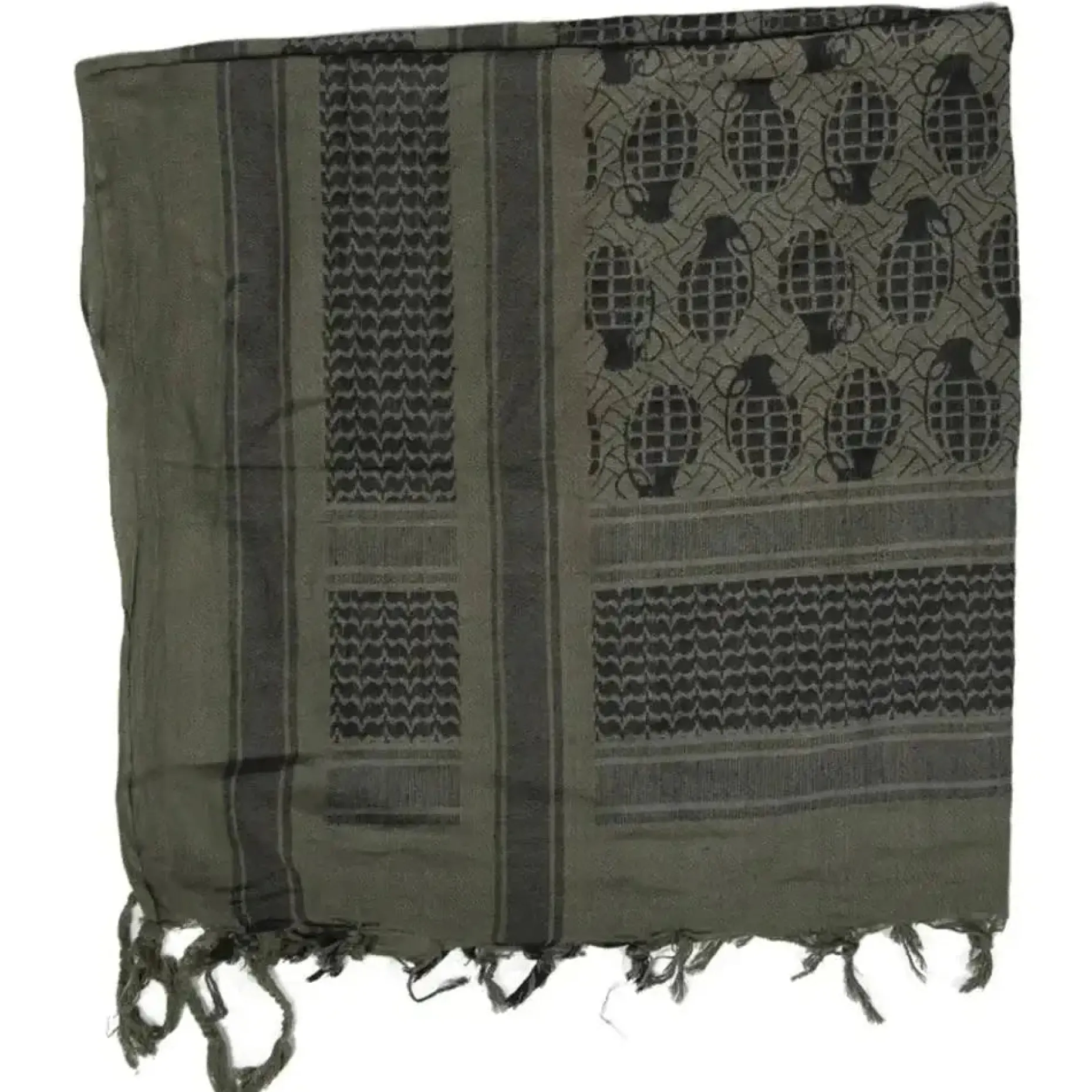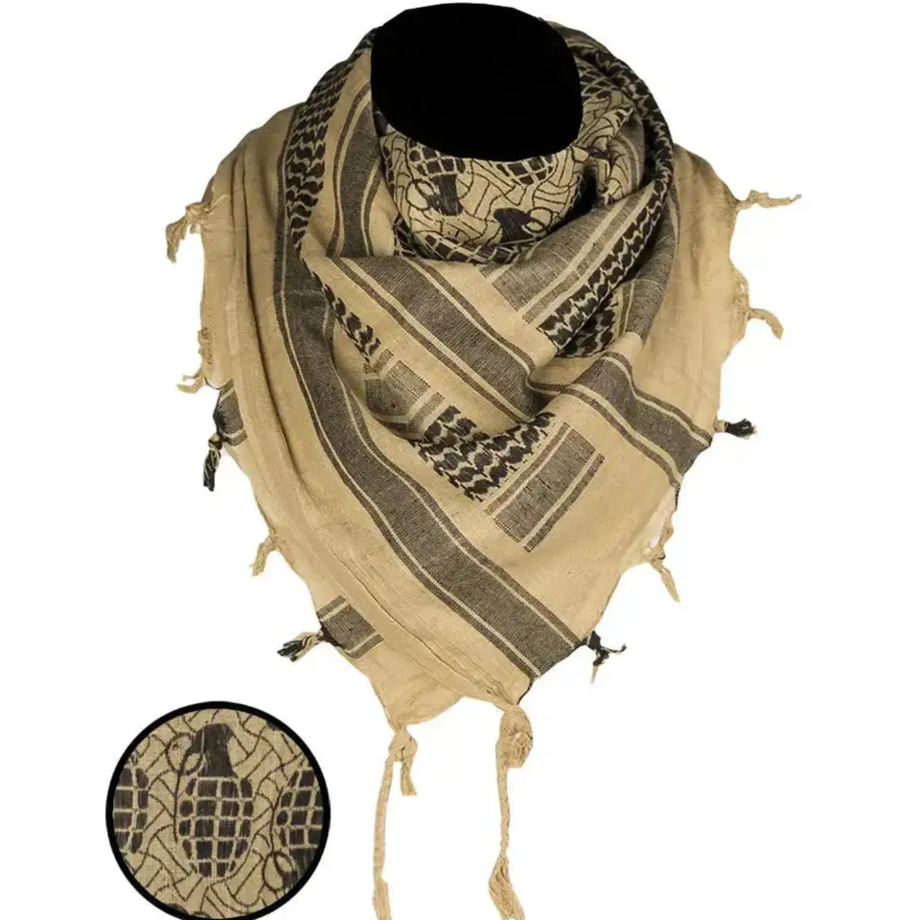 Diese modische Version des allseits beliebten Allzweckschals, bekannt als Shemagh, ist mit kleinen „Pineapples“, also Handgranaten versehen. Er lässt Ihr Outfit in einem ganz anderen Licht erstrahlen und kann zudem ganz klassisch als Schal, Gesichtstarnung oder Kopftuch verwendet werden.