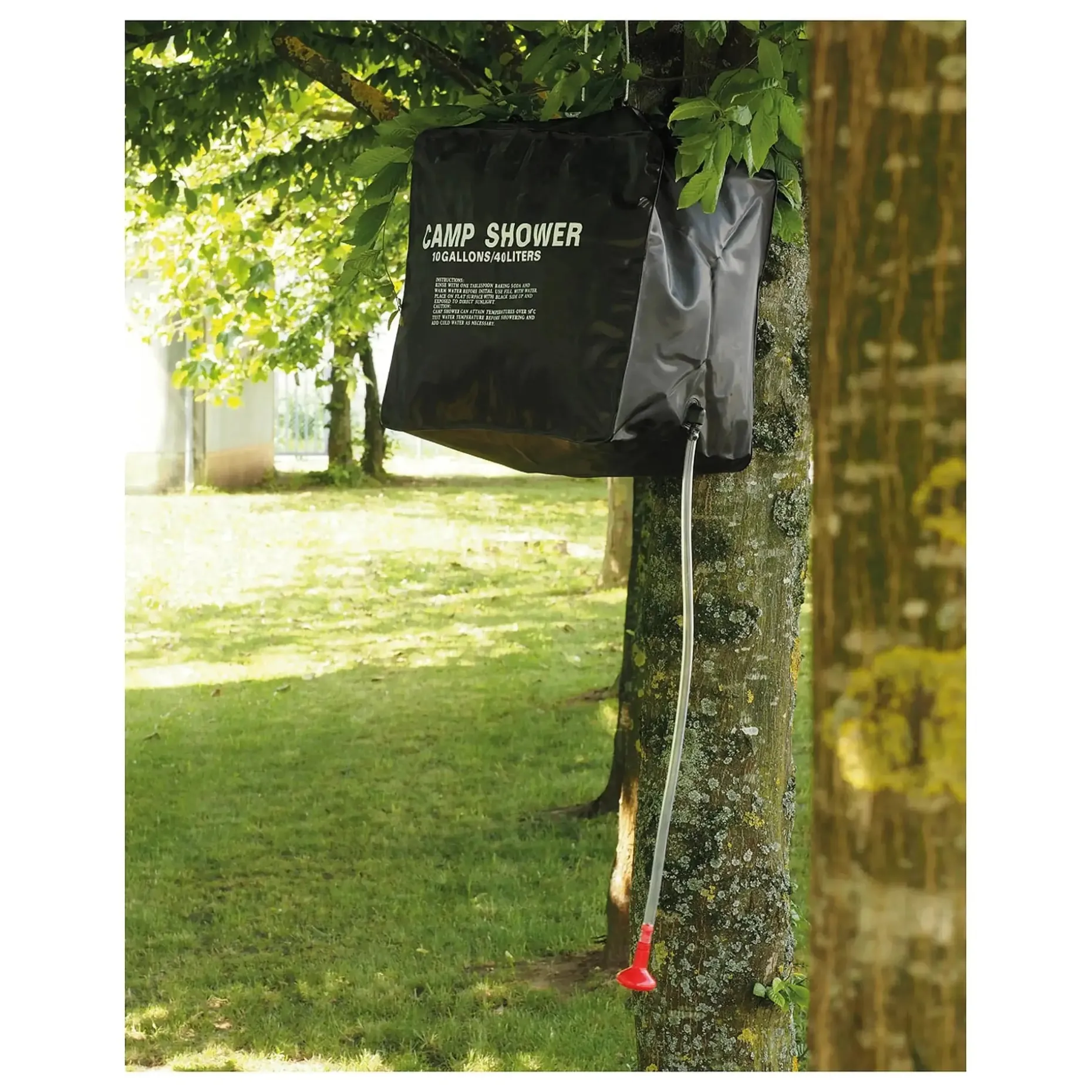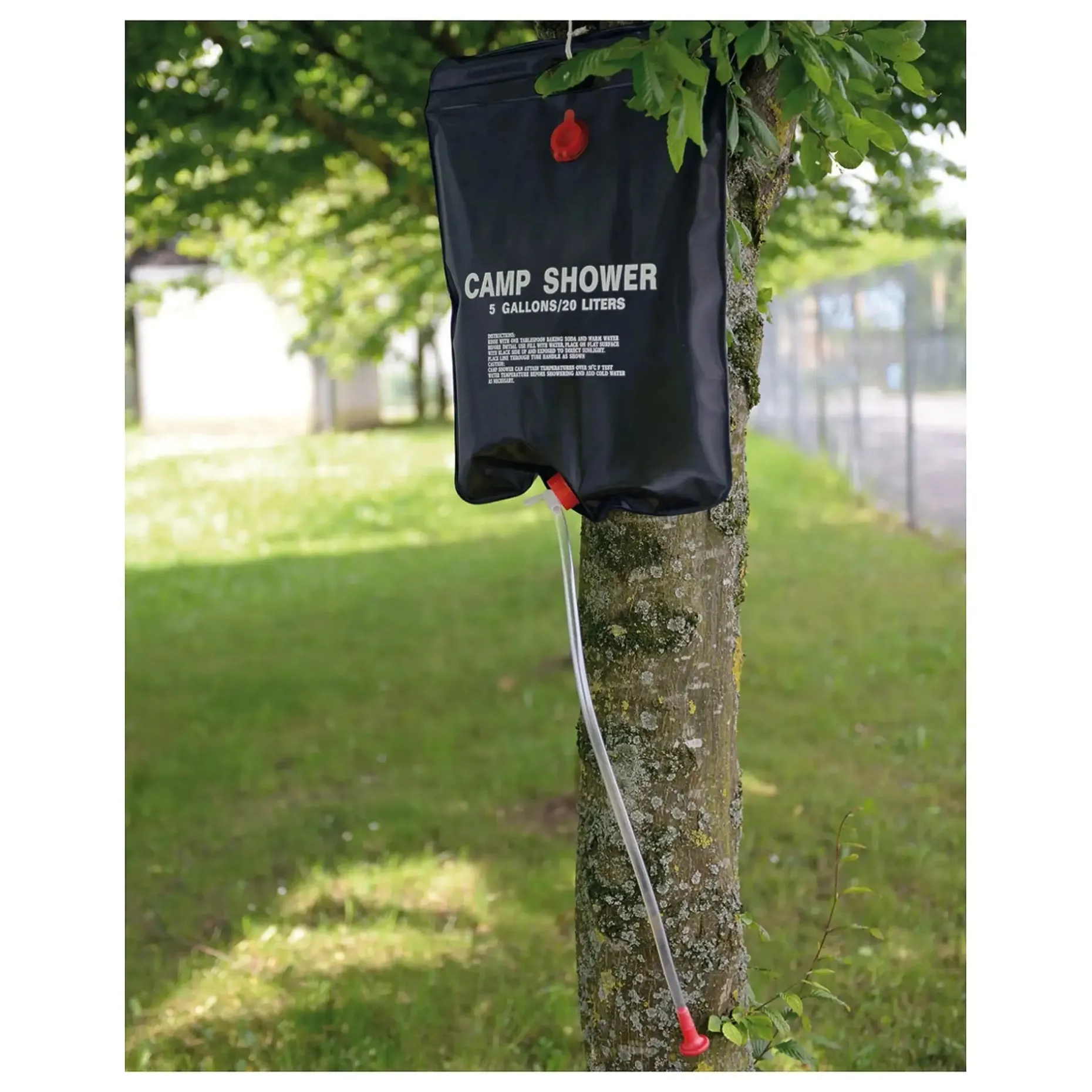 Die Dusche kommt mit Aufhängevorrichtung, Duschschlauch und Duschkopf. Zum Befestigen der Dusche werden ca. 2 m Schnur mitgeliefert. Sie lässt sich nach Gebrauch einfach zusammenrollen und transportieren.