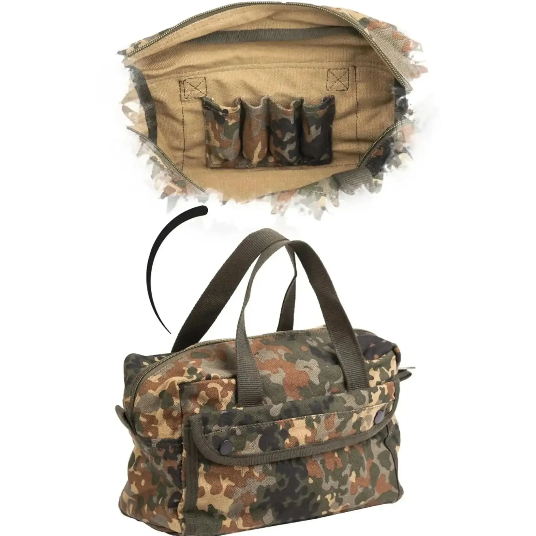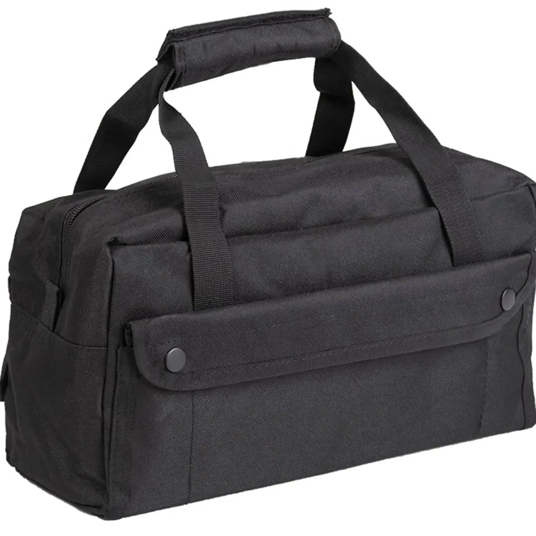 Praktische Handgepäcktasche im Mini-Format. Großes Hauptfach mit Mittelreißverschluss und Steckfächern links und rechts für Stifte, Werkzeug etc. 2 aufgesetzte Außentaschen mit Abdeckung und Druckknopfverschluss. Bodenverstärkung.