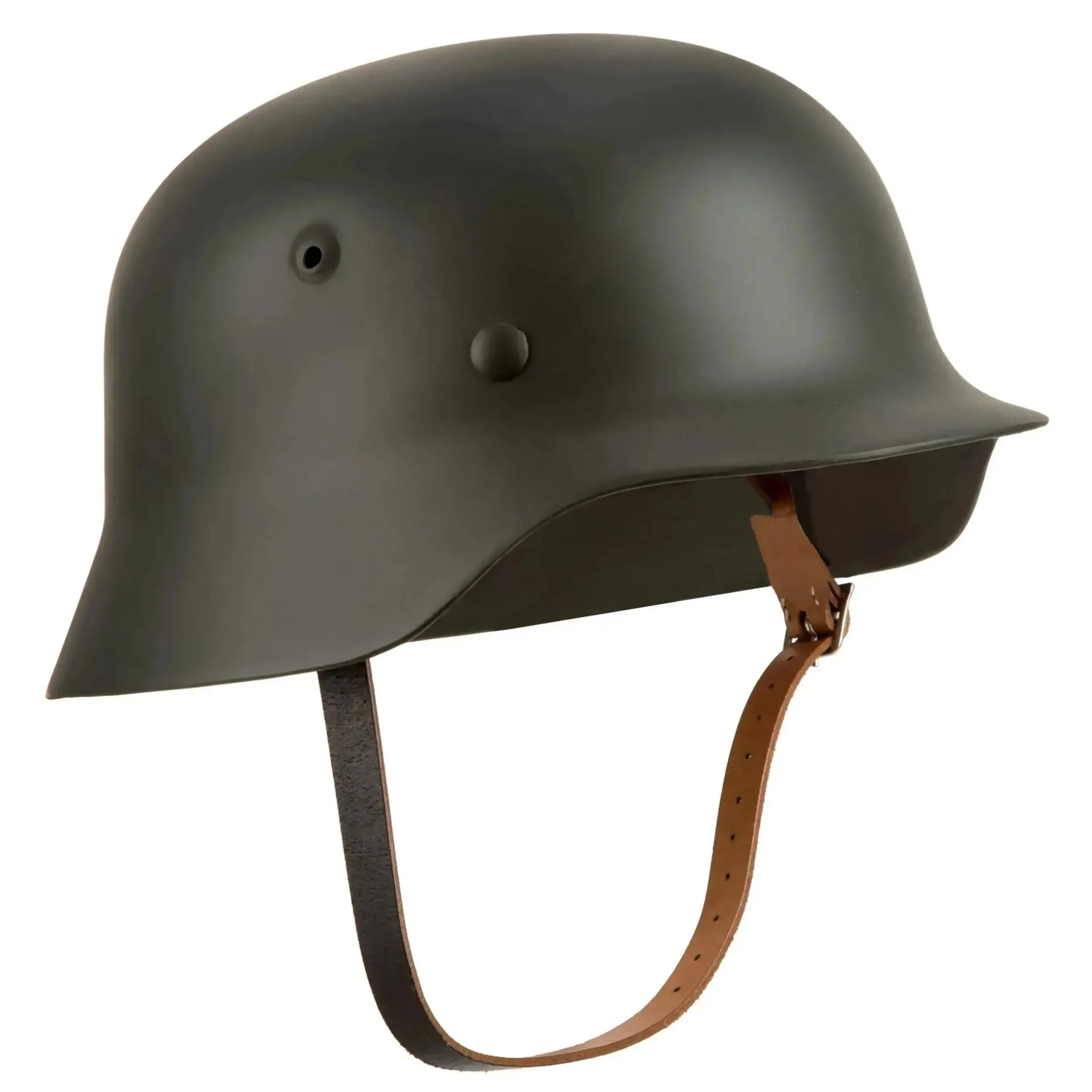 Der Mil-Tec WH Stahlhelm M40 ist ein Nachbau des WK II Stahlhelms M40 in seiner typischen Form mit den seitlichen Lüftungslöchern. Das Lederinnenfutter ist auf einem Metallring befestigt. Der Kinnriemen aus Leder ist verstellbar.