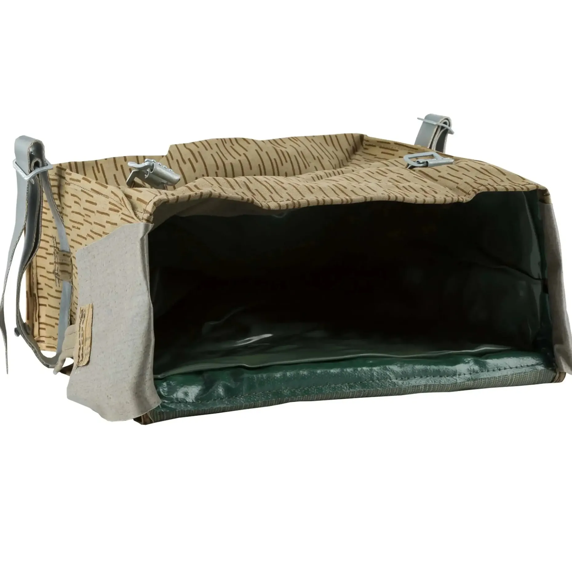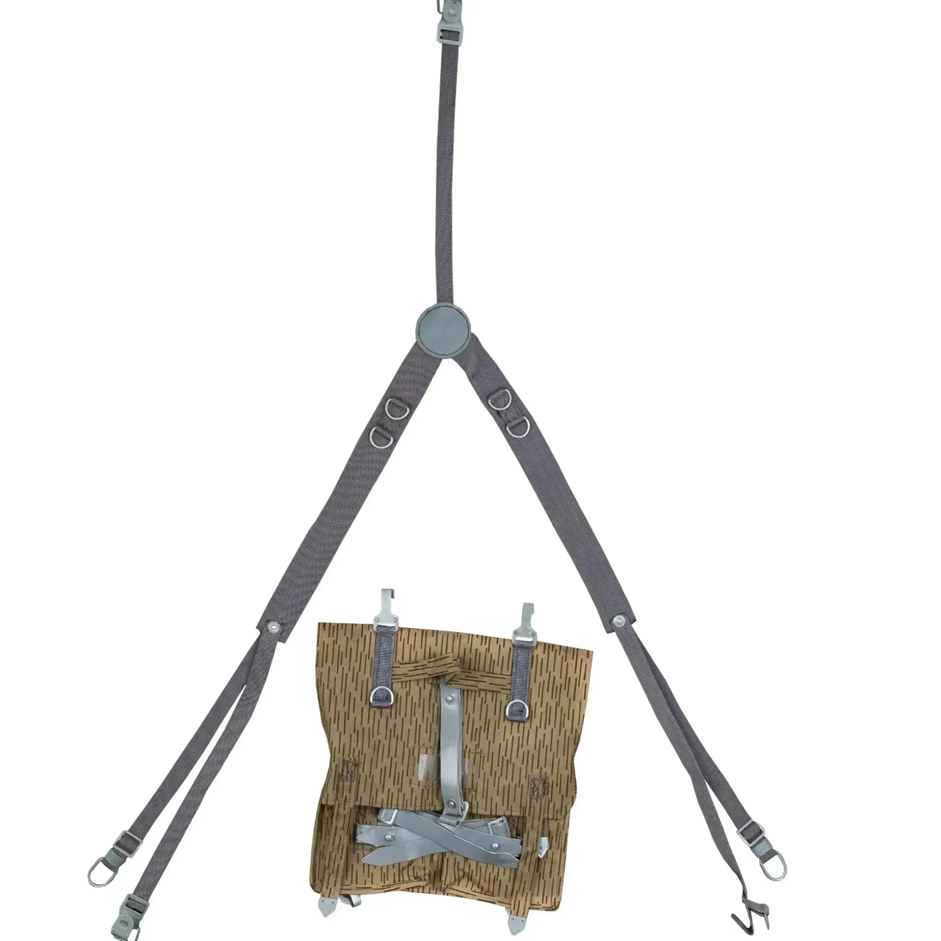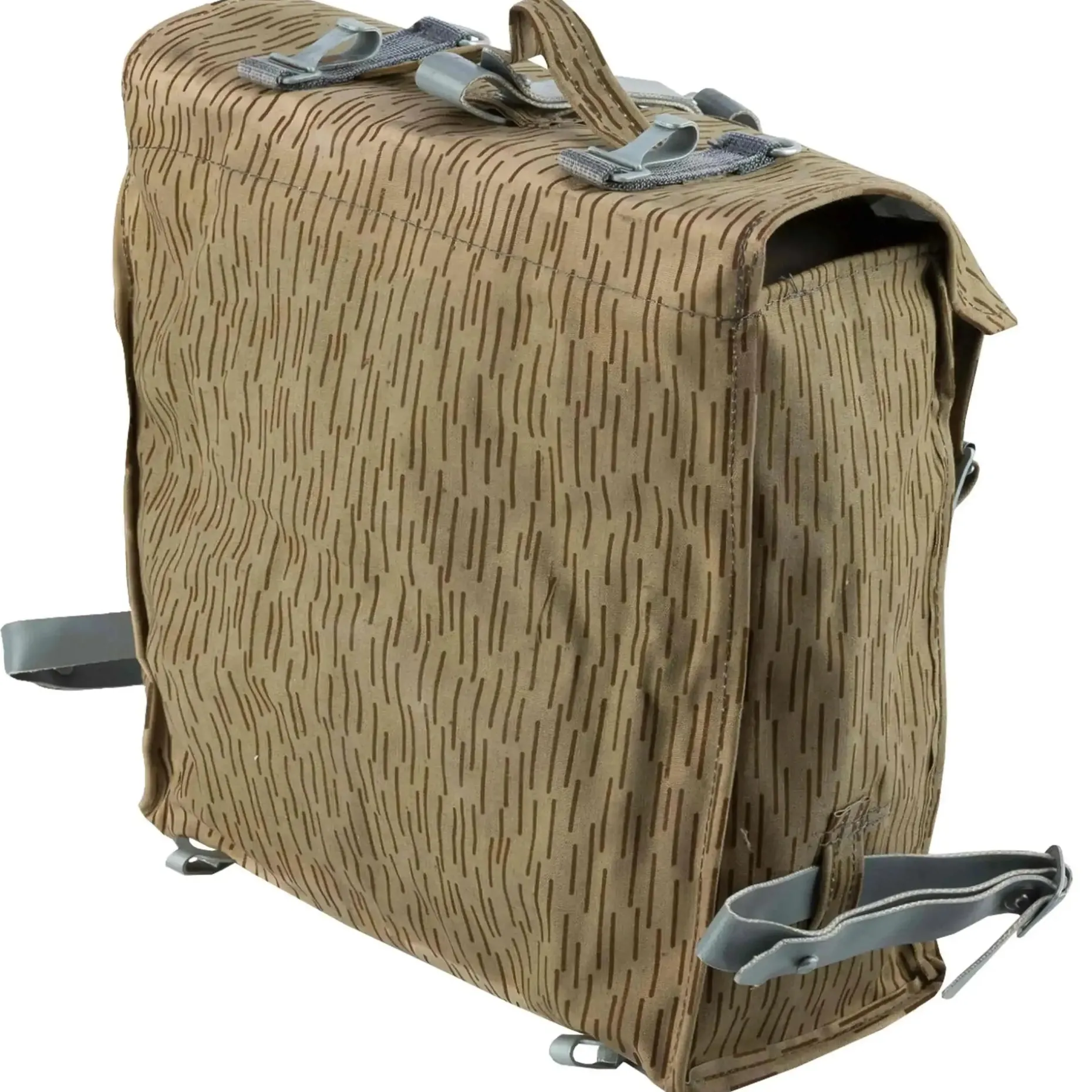 Das Sturmgepäck aus originalen Beständen der Nationalen Volksarmee (NVA) kann dank Y-Tragegestell als Rucksack getragen werden oder wie eine Tasche am Trageriemen. Weiterhin bieten die Schnallen die Möglichkeit, das Sturmgepäck mit einem Koppeltragegestell zu kombinieren