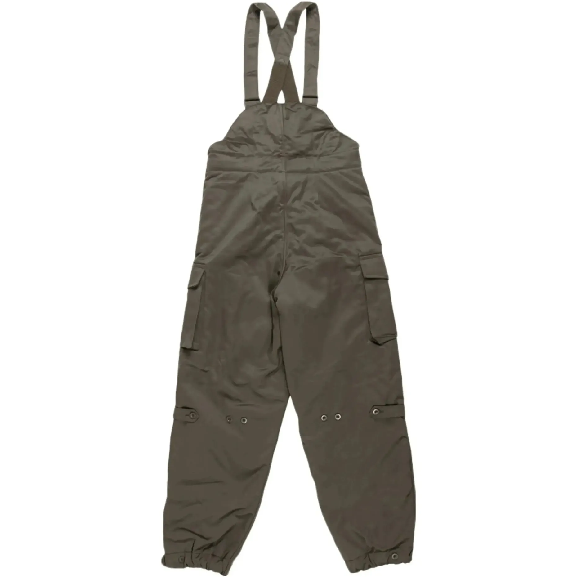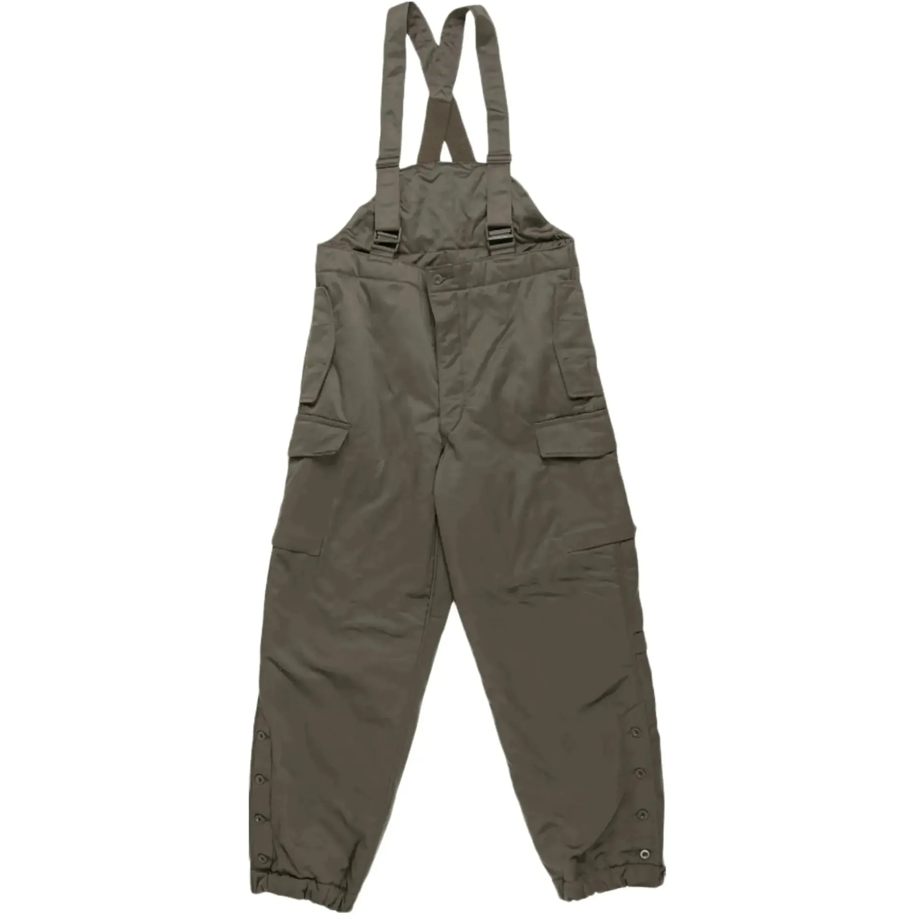 Neuwertige Überhose aus Beständen des österreichischen Bundesheeres. Die Hose besitzt vier Taschen und verstellbare Hosenträger. Zum besseren Überziehen der Hose lassen sich die Hosenbeine mittels Knöpfen öffnen.