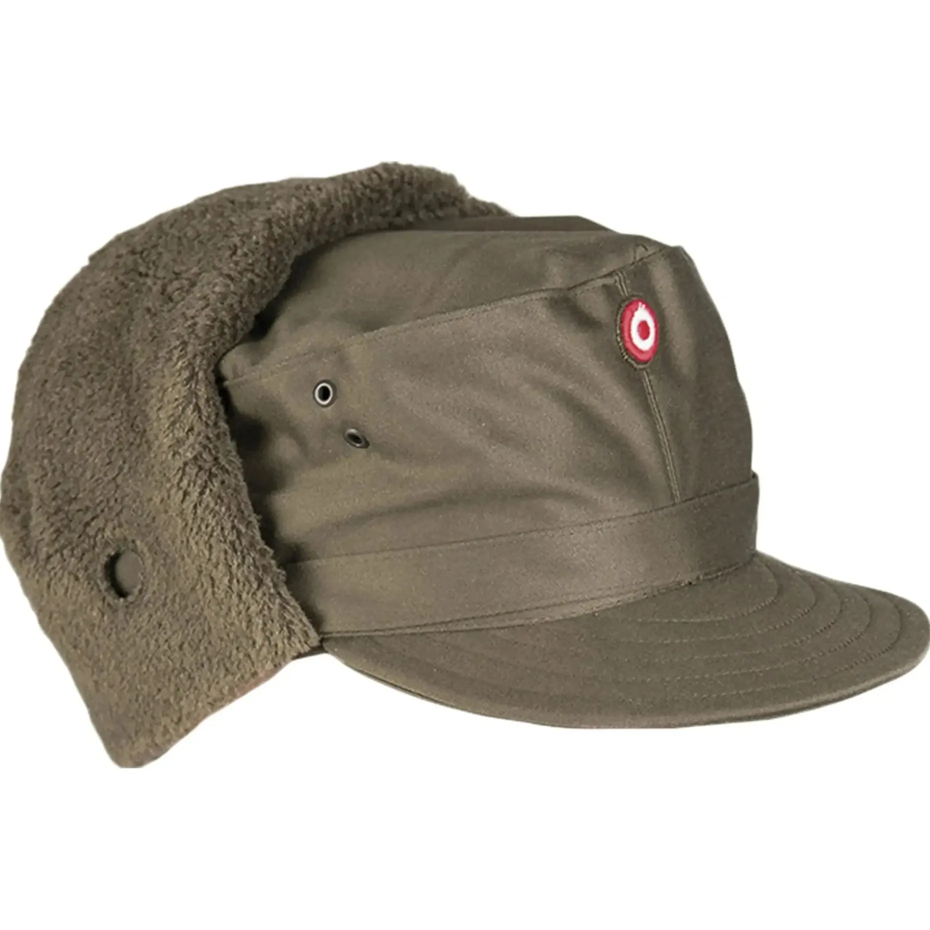 Neuwertige Wintermütze aus Beständen des österreichischen Bundesheeres. Die abklappbaren Ohrenschützer lassen sich zusammenknöpfen und halten dann auch die Nacken- und Halspartie warm.