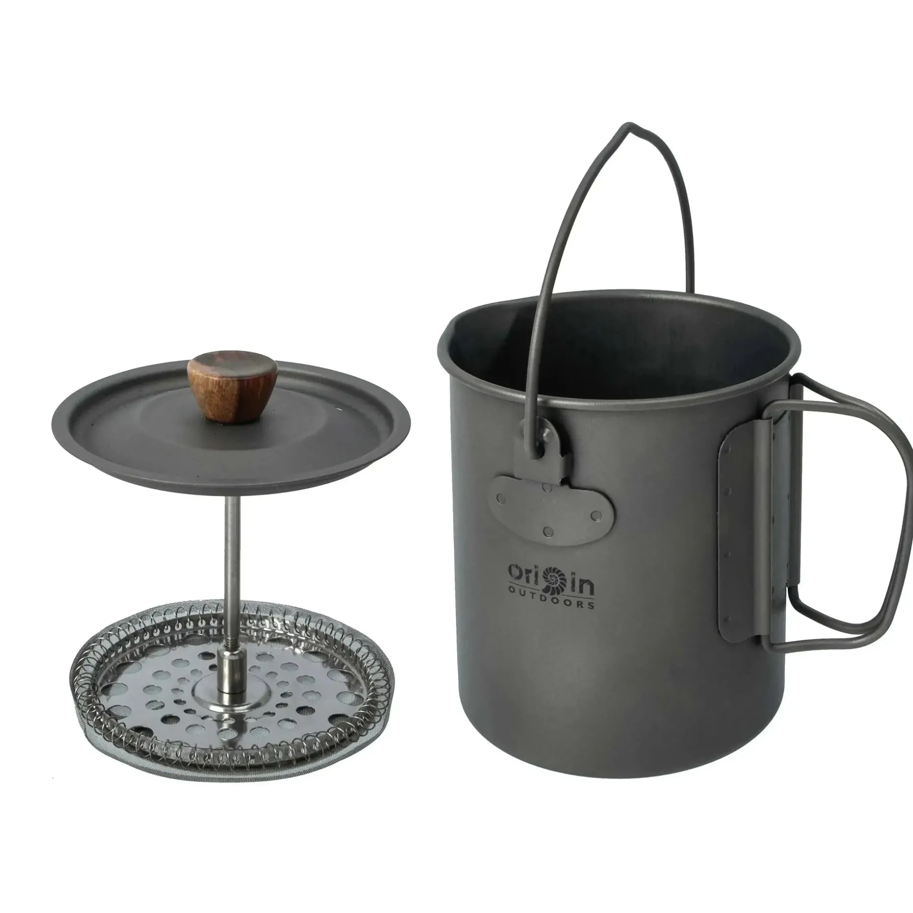 Die French Press Origin Outdoors Titan 3 in 1 ist ein vielseitiges Multitalent für Reisen, Wandern und Trekking. Sie vereint Kaffeepresse, Topf und Tasse in einem extrem leichten und robusten Titan-Gefäß. Du kannst sie flexibel auf Gaskochern, Benzinkochern, Spiritusbrennern oder sogar über dem Lagerfeuer verwenden. Der Aufhängebügel mit Einkerbung ermöglicht es Dir, den Topf sicher mit einem Stock über das Feuer zu hängen.