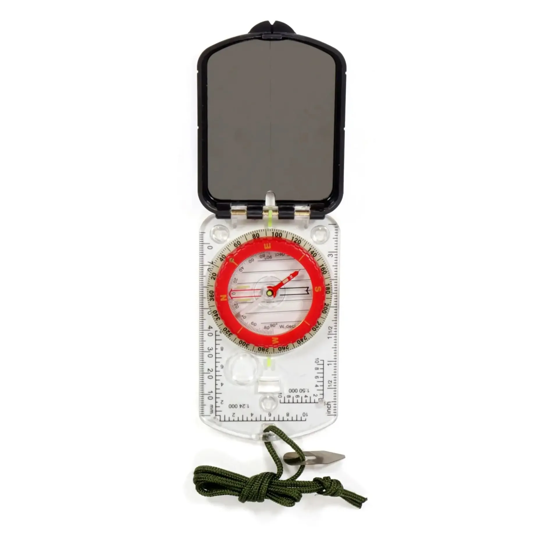 Das robuste Acrylglasgehäuse ist stoßfest und transparent für gute Sicht auf die Karte. Die aufgedruckten Maßstäbe in mm, inch, 1:24.000 und 1:50.000 machen den Kompass vielseitig nutzbar – ob für Wanderkarten oder topografische Spezialkarten. Eine eingebaute Lupe hilft beim Erkennen feiner Details, während Leuchtmarkierungen die Bedienung bei Dämmerung oder Dunkelheit erleichtern.