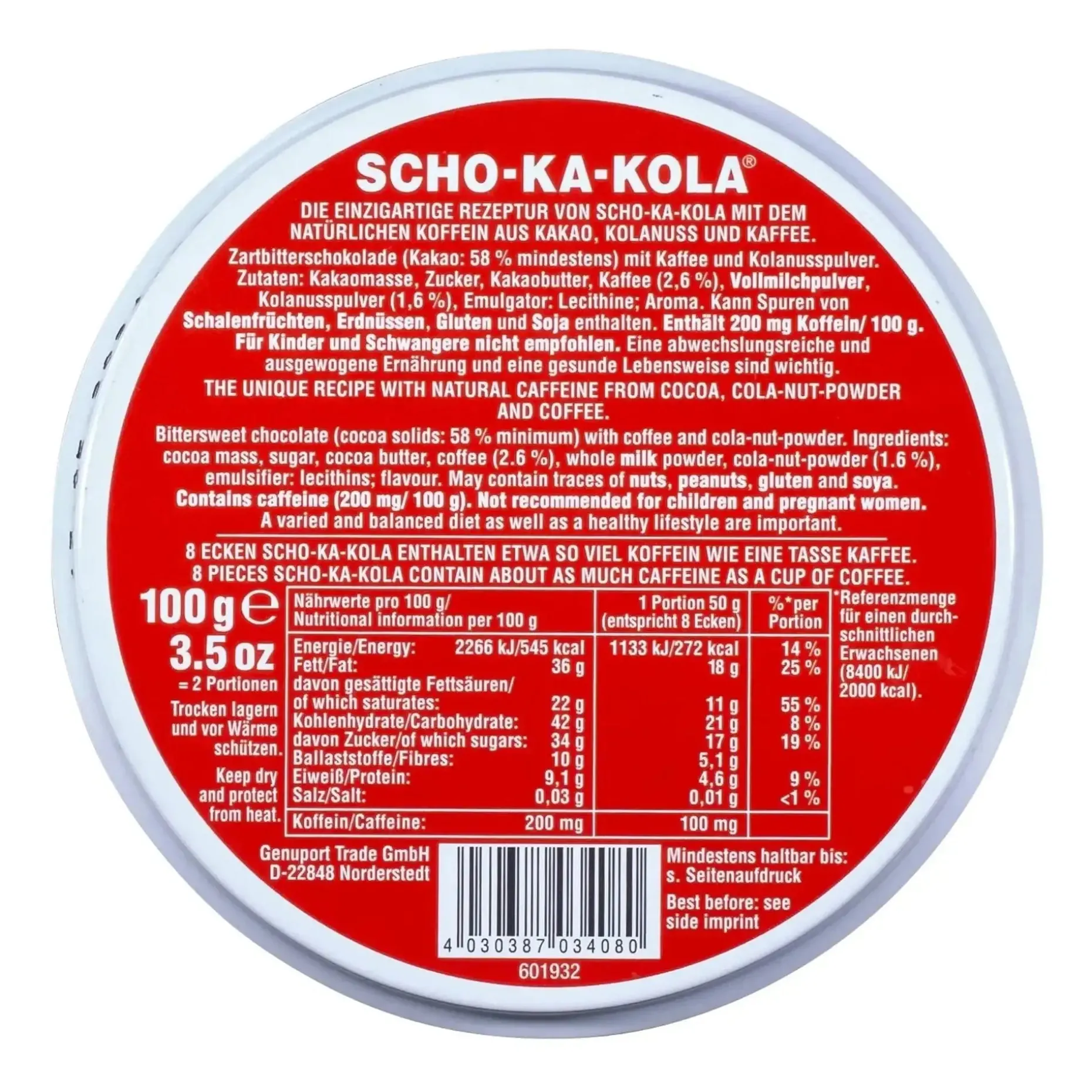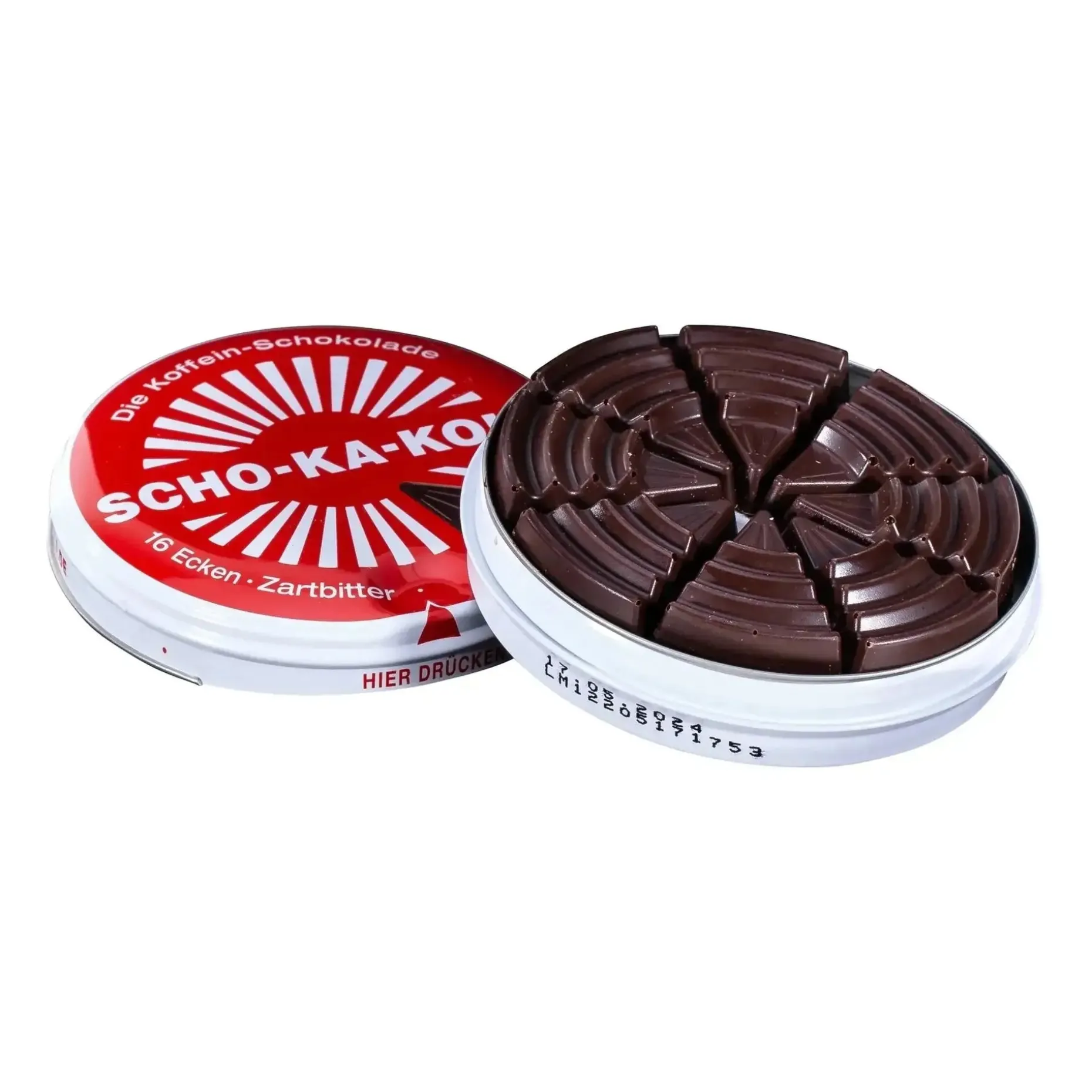 Die original Energie-Schokolade seit 1935 von SCHO-KA-KOLA. Ihr Geheimnis liegt in der einzigartigen Rezeptur aus Kakao, Kaffee und dem Extrakt der Kolanuss. Natürliches Koffein gibt langanhaltende Energie für mehr Kraft und Konzentration. 6 Ecken SCHO-KA-KOLA enthalten etwa so viel Koffein wie ein starker Espresso. Die praktische Alternative zu Kaffee und Energy-Drinks. In der Dose ist die Schokolade zwei Jahre haltbar.