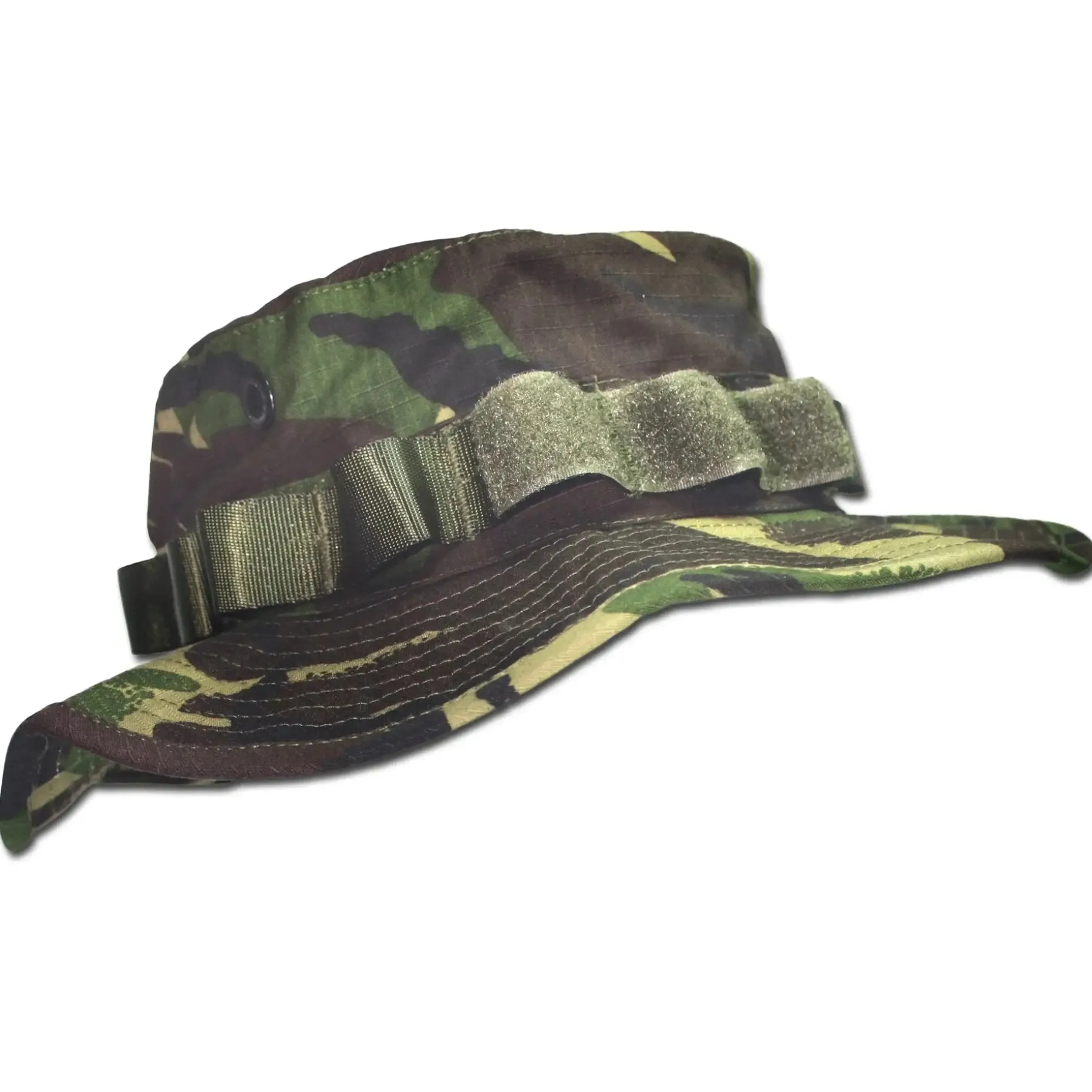 Klassischer Krempenhut mit rundumlaufenden Schlaufen zur Befestigung von zusätzlichem Tarnmaterial. Die großen Belüftungsöffnungen mit Insektengitter sorgen für ausreichende Ventilation. Klettflächen vorne und hinten zum Anbringen von Namensband, taktischer Zahlen und/oder Zeichen etc.