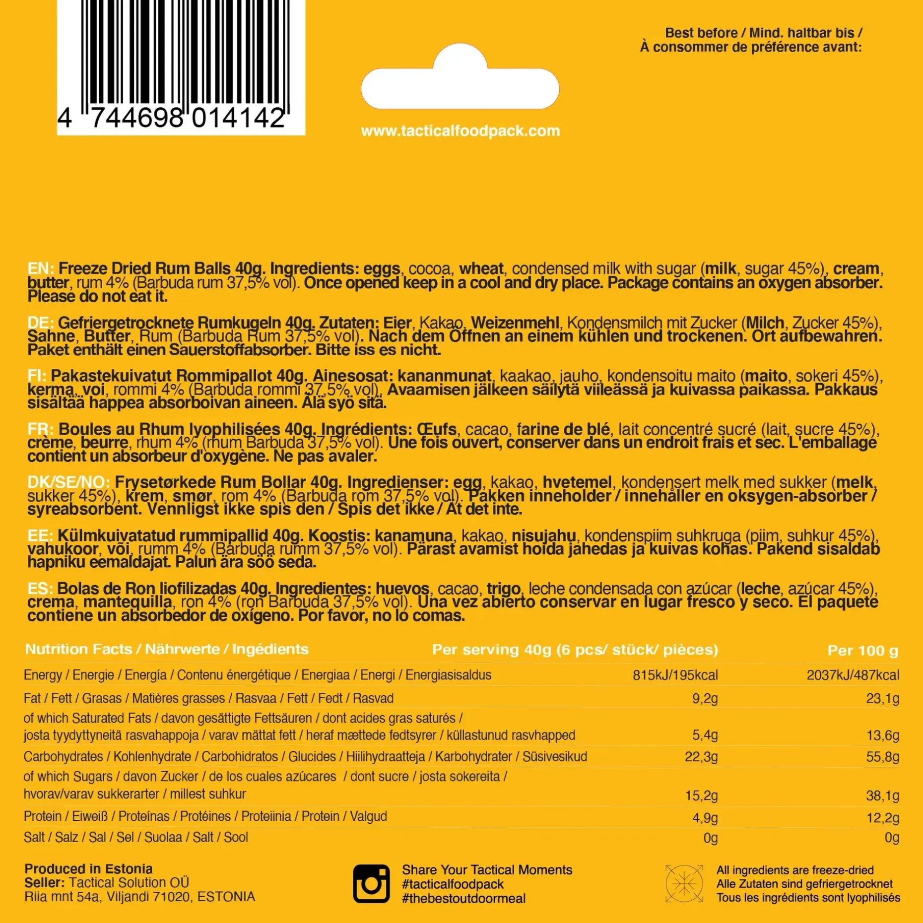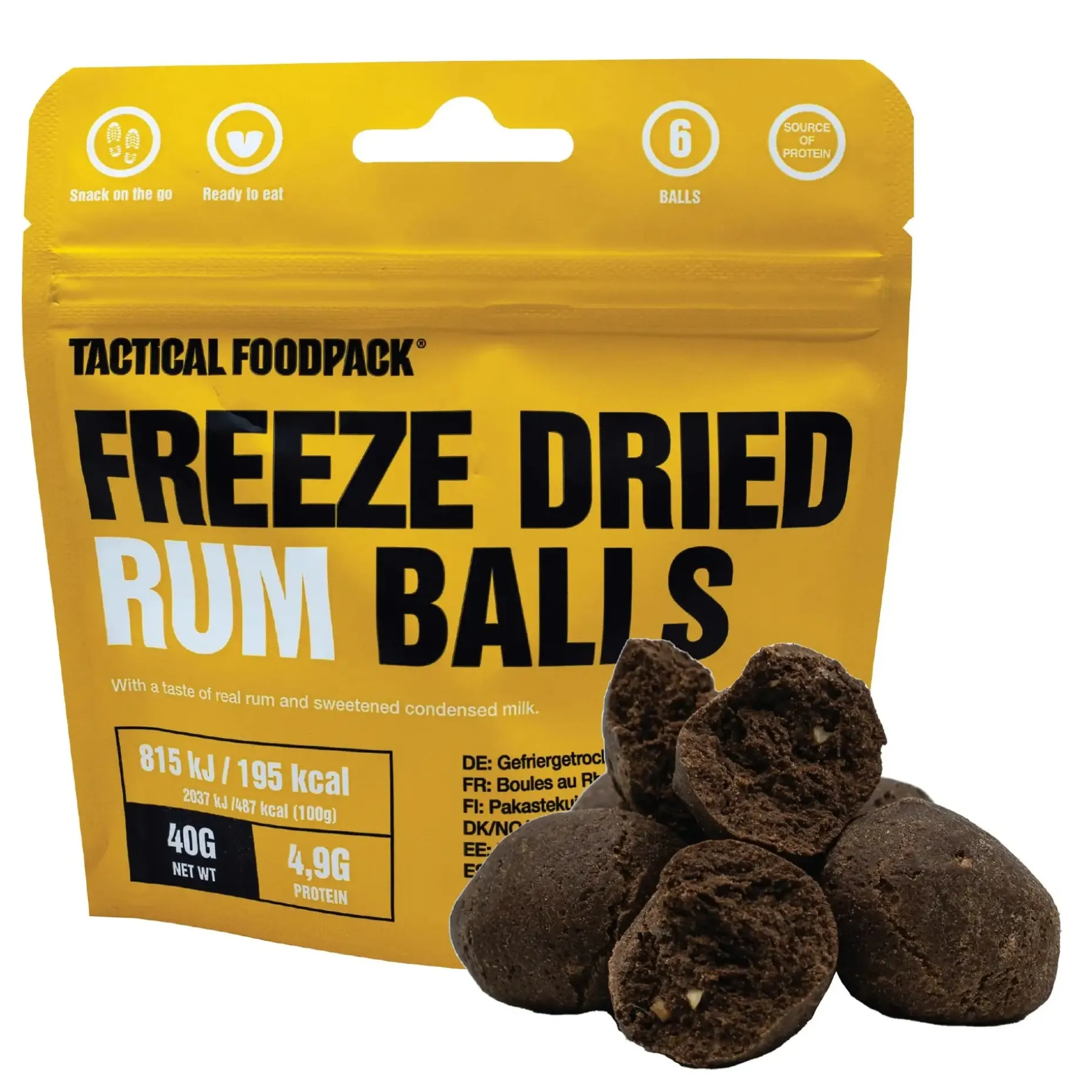 Die Tactical Foodpack Freeze Dried Rum Balls bringen süße Energie in Deinen Rucksack – mit echtem Rumgeschmack, Butter und Kondensmilch. Diese kleinen Kugeln sind nicht nur ein leckerer Snack, sondern auch ein kräftiger Energiebooster für lange Strecken oder fordernde Outdoor-Einsätze.