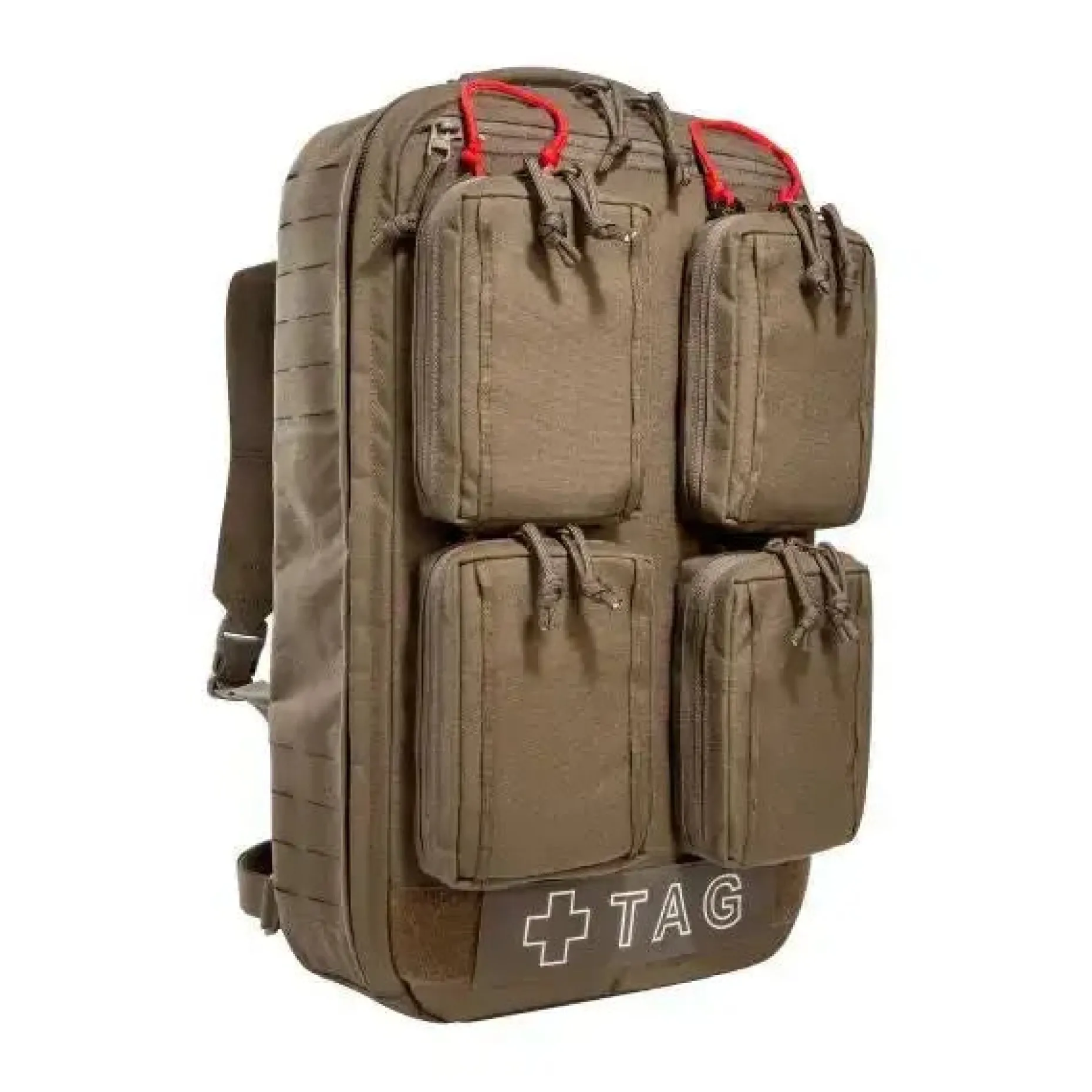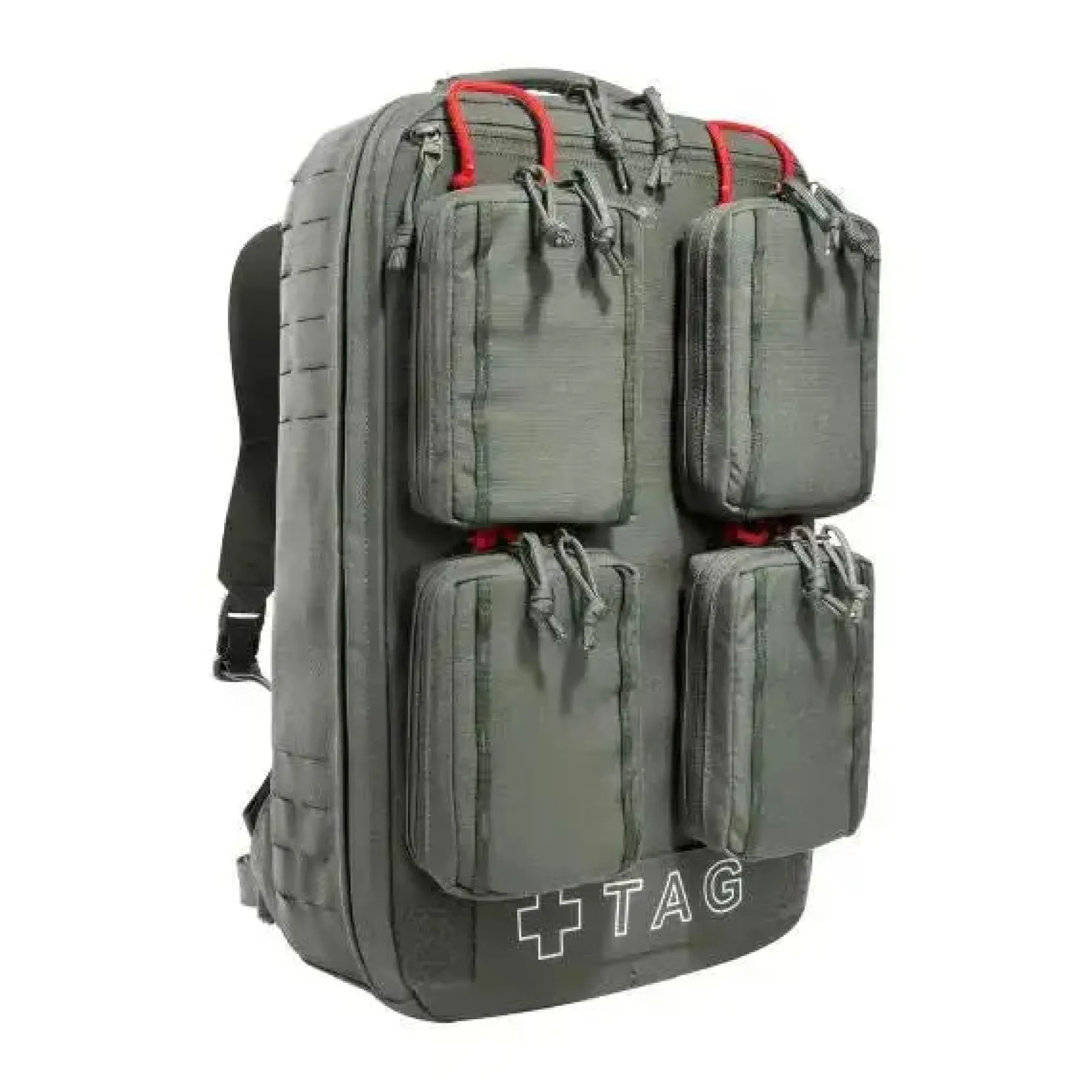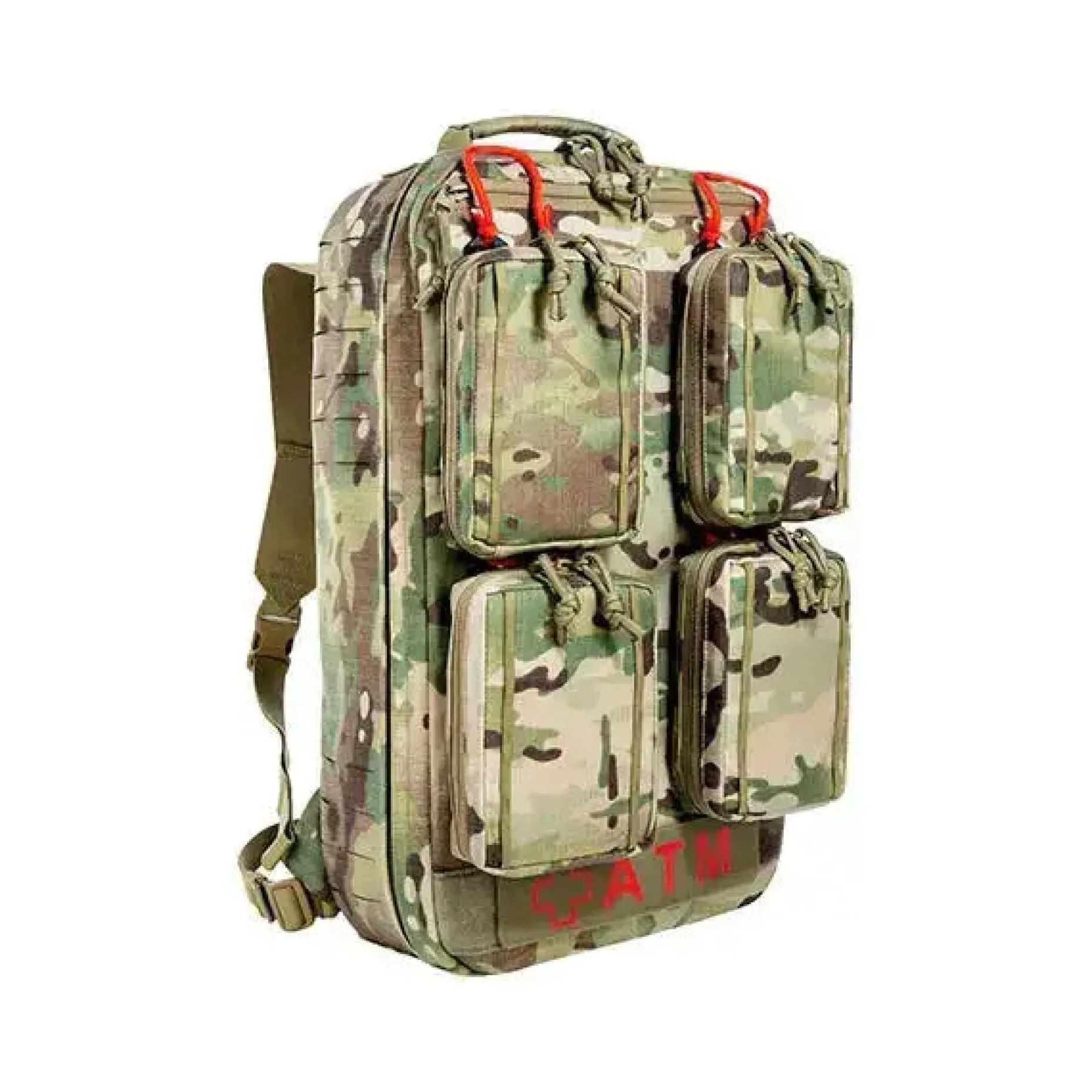 Der Rucksack ist auf der Front mit vier IFAK-Pouches mit Daisy Chains für den schnellen Zugriff ausgestattet. Diese sind durch das Molle-Stick-Schnelllösesystem abnehmbar, sodass mehrere Verwundete gleichzeitig versorgt werden können, ohne den gesamten Rucksack transportieren zu müssen.