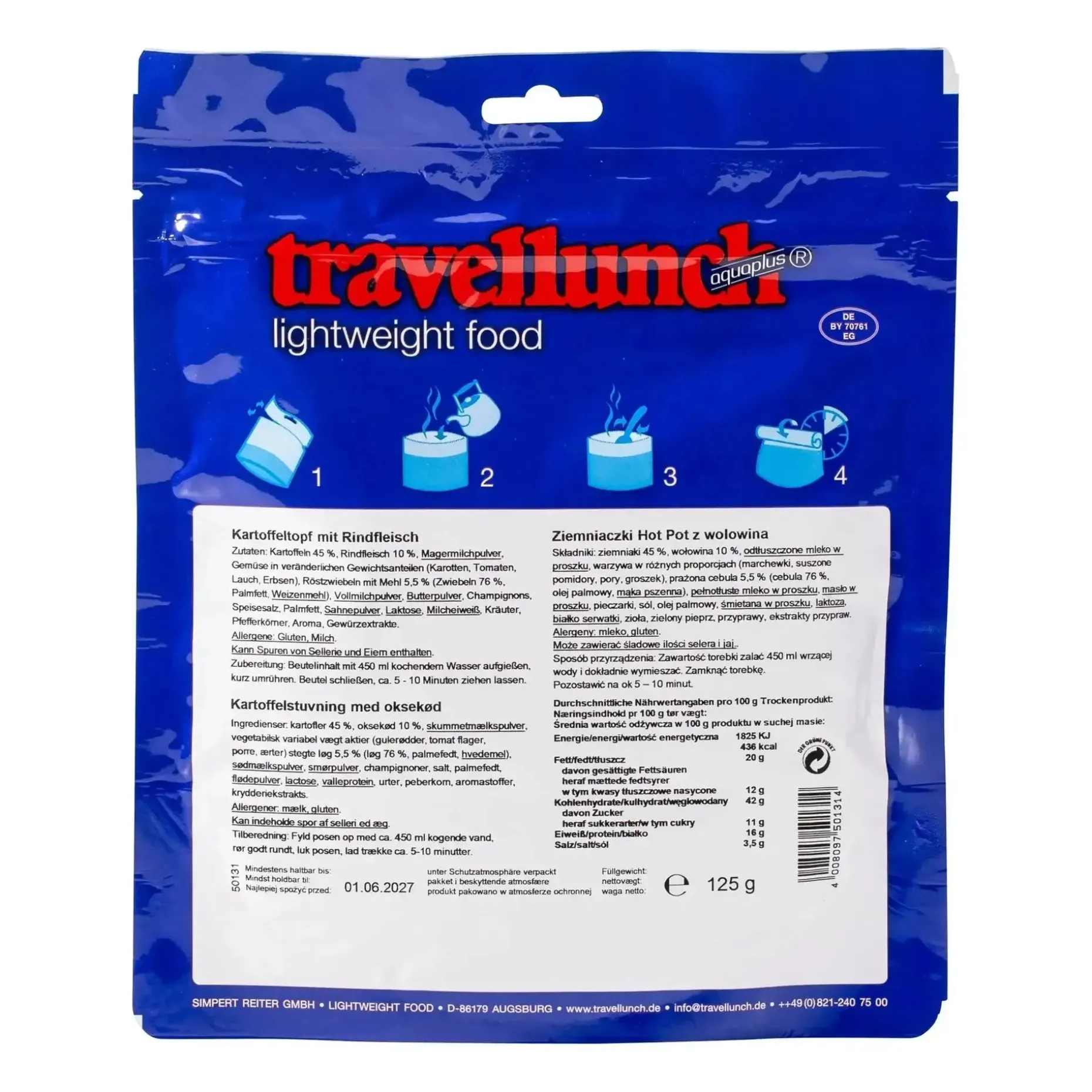 Der Travellunch Kartoffeltopf mit Rindfleisch 1er Packung ist die ideale Hauptmahlzeit für den Notfall, für den Campingausflug oder für Wanderungen. Es ist nicht nur schmackhaft, sondern stellt auch sicher, dass Du in der freien Natur gut versorgt bist. Hier kommt das leckere Essen im praktischen 2er Pack.