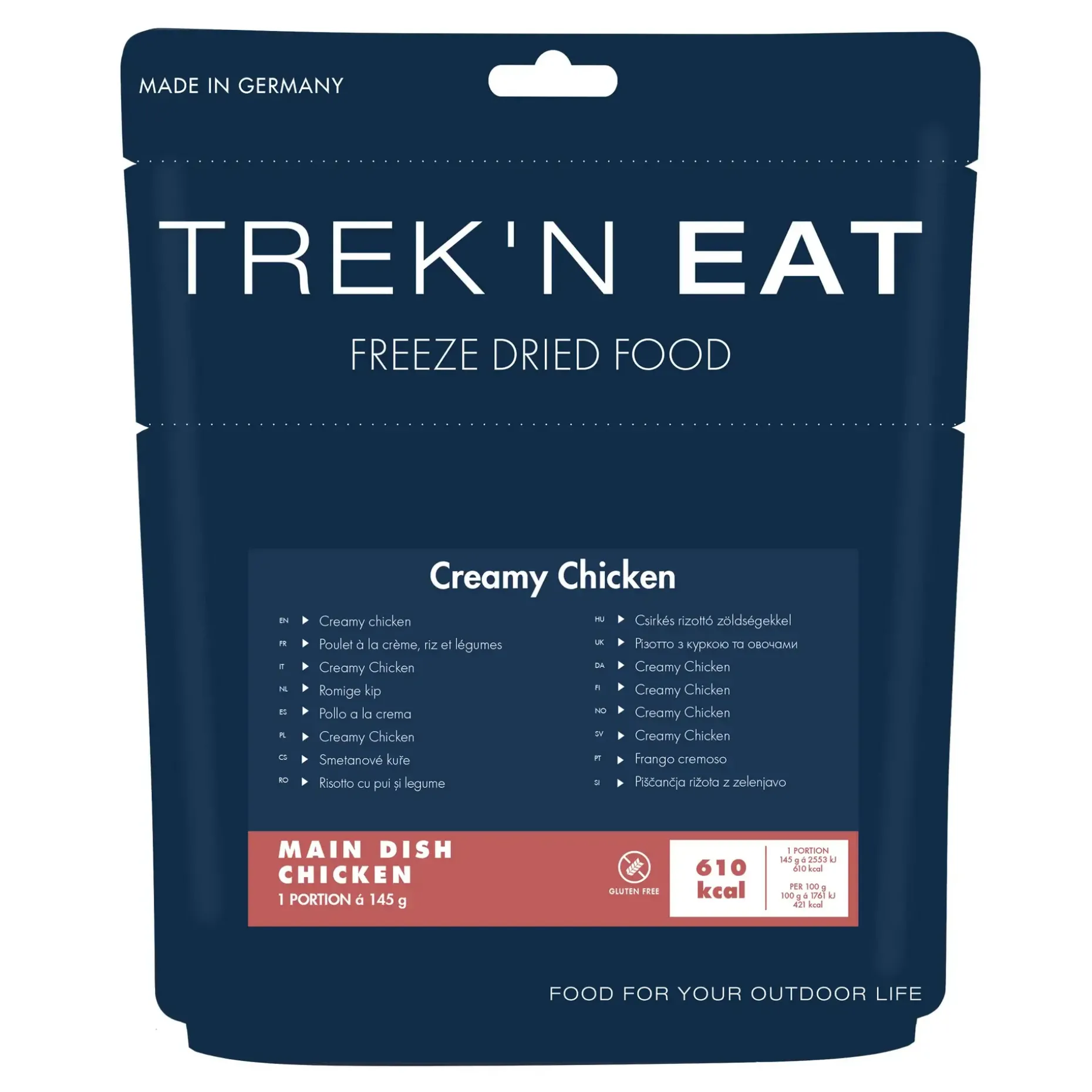 Das Trek’N Eat Creamy Chicken überzeugt mit gutem Geschmack und langer Haltbarkeit. Es versorgt Dich mit der benötigten Energie und eignet sich sowohl für Ausflüge wie auch für die Krisenvorsorge, als Notnahrung oder als Backup im Rucksack oder Auto.