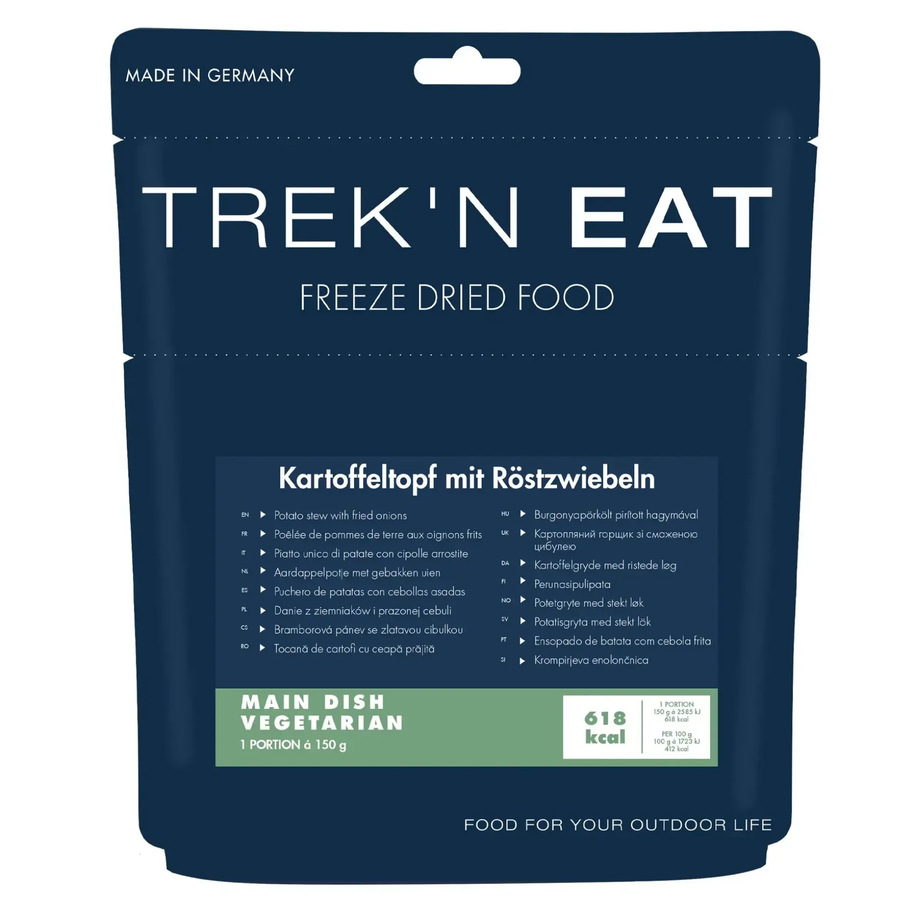 Der Trek’N Eat Kartoffeleintopf mit Röstzwiebeln überzeugt mit gutem Geschmack und langer Haltbarkeit. Er versorgt Dich mit der benötigten Energie und eignet sich sowohl für Ausflüge wie auch für die Krisenvorsorge, als Notnahrung oder als Backup im Rucksack oder Auto.