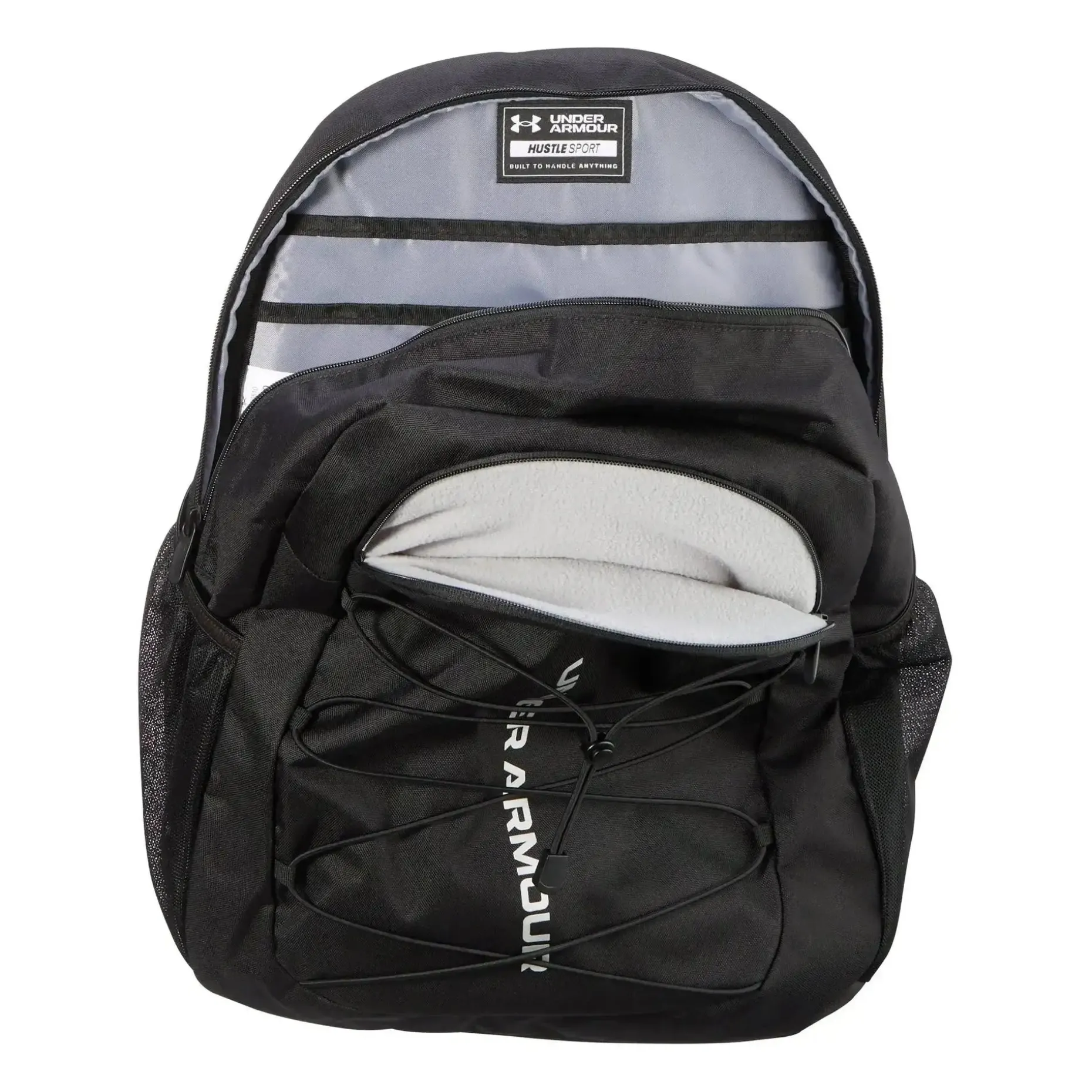 Der Under Armour Rucksack Hustle Sport ist ideal für den Alltag. Die Storm-Technologie sorgt für ein extrem wasser- und schmutzabweisendes Finish. Ein hoher Tragekomfort ergibt sich durch den gepolsterten Rückenteil und die geformten Träger. Er bietet zahlreiche Taschen, um Deine Tools oder persönliche Gegenstände zu verstauen. So ist er mit einem weich gefütterten Fach für Laptops bis zu 15 Zoll ausgestattet. Außerdem hat er an der Vorderseite eine extra Tasche mit Zip für Deine Wertsachen und zwei Seitentaschen für Wasserflaschen. Der Spannverschluss auf der Vorderseite eignet sich zum leichten Verstauen von einer Jacke, einem Paar Schuhe oder einem Ball. Das robuste, abriebfeste und beschichtete Bodenteil und der obere Henkel runden den Hustle Sport ab.