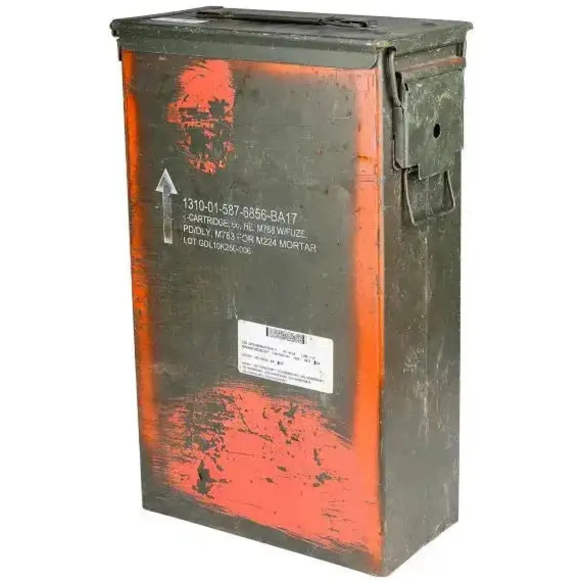 Original US Munikiste in der Größe 2a mittel in gebrauchtem Zustand. – Maße: 48 x 30 x 15,5 cm Für Munition: 8 Cartridge 60 mm HE, M768 W/FUZE PD/DLY M783 for M224 Mortar LOT GDL 10K 250-006